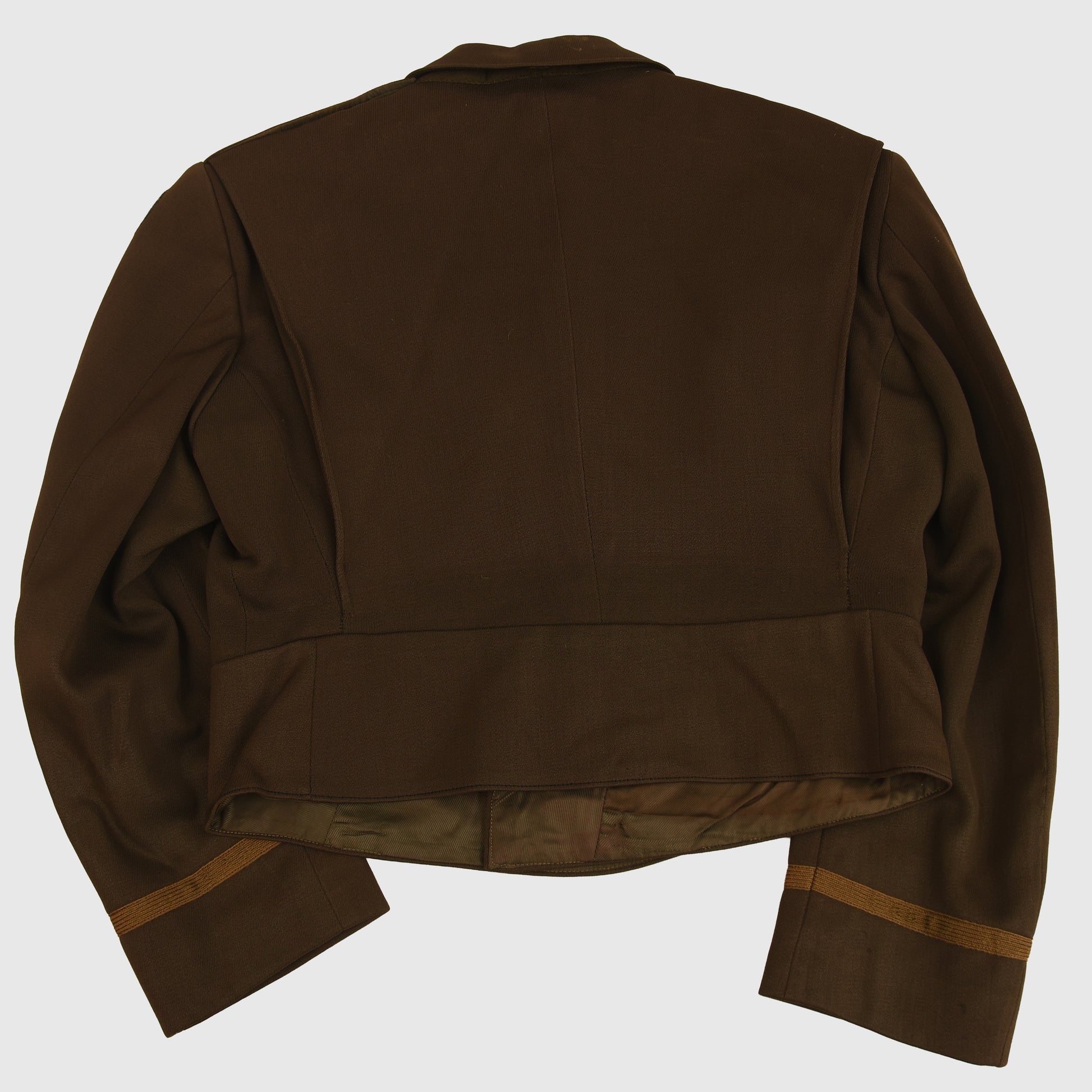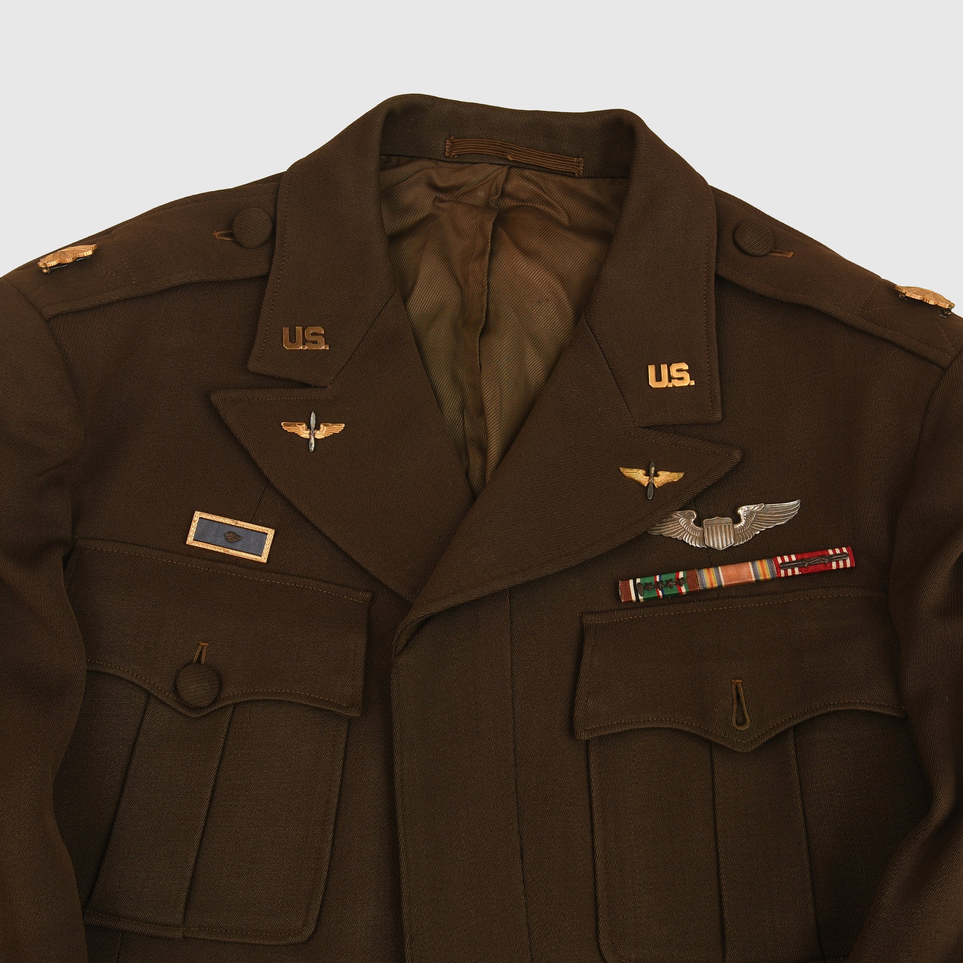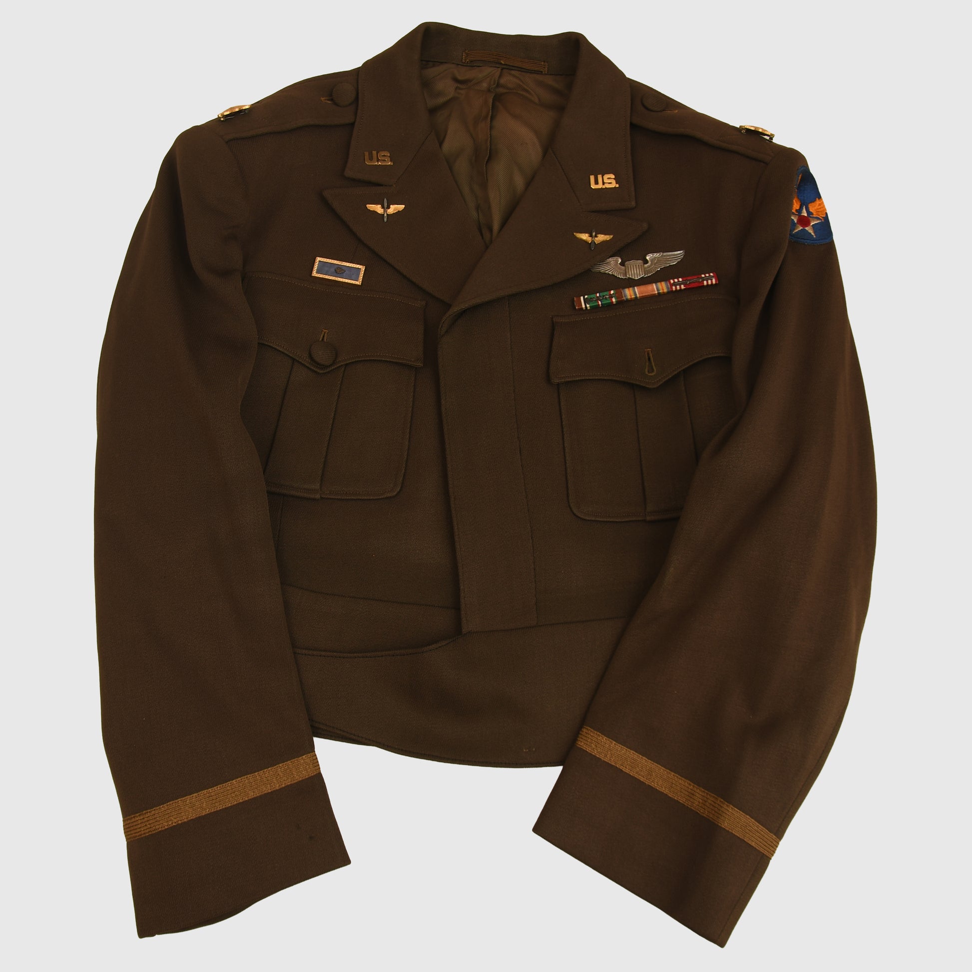 All of the American uniforms for officers in WWII were of the most superb quality, and this is a Standard chocolate colour, blouse-type tunic with two upper pockets with flaps, open collar style. Even the buttons that secure the shoulder boards to the tunic are covered in the same chocolate brown Gaberdine material. A full complement of insignia, Major's oak leaves to the epaulettes. ‘U.S.’ over wing propeller badges to the lower collar. Pilot's wings, held to the tunic by American-style clutches. Medal ribbon bar of three medals. Air Force patch on the left-hand shoulder. To the interior of the tunic pocket, there is a manufacturer's label, accompanied by the British-made trousers of a slightly different shade of chocolate brown than the jacket, with its integral fitted belt having a manufacturer's label of ‘Brown & Haigh, England’. Both portions of the uniform are completely free of any moth damage, repairs or staining.