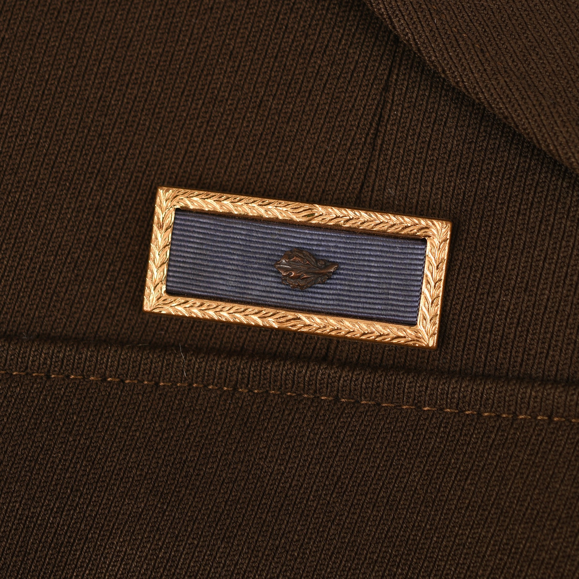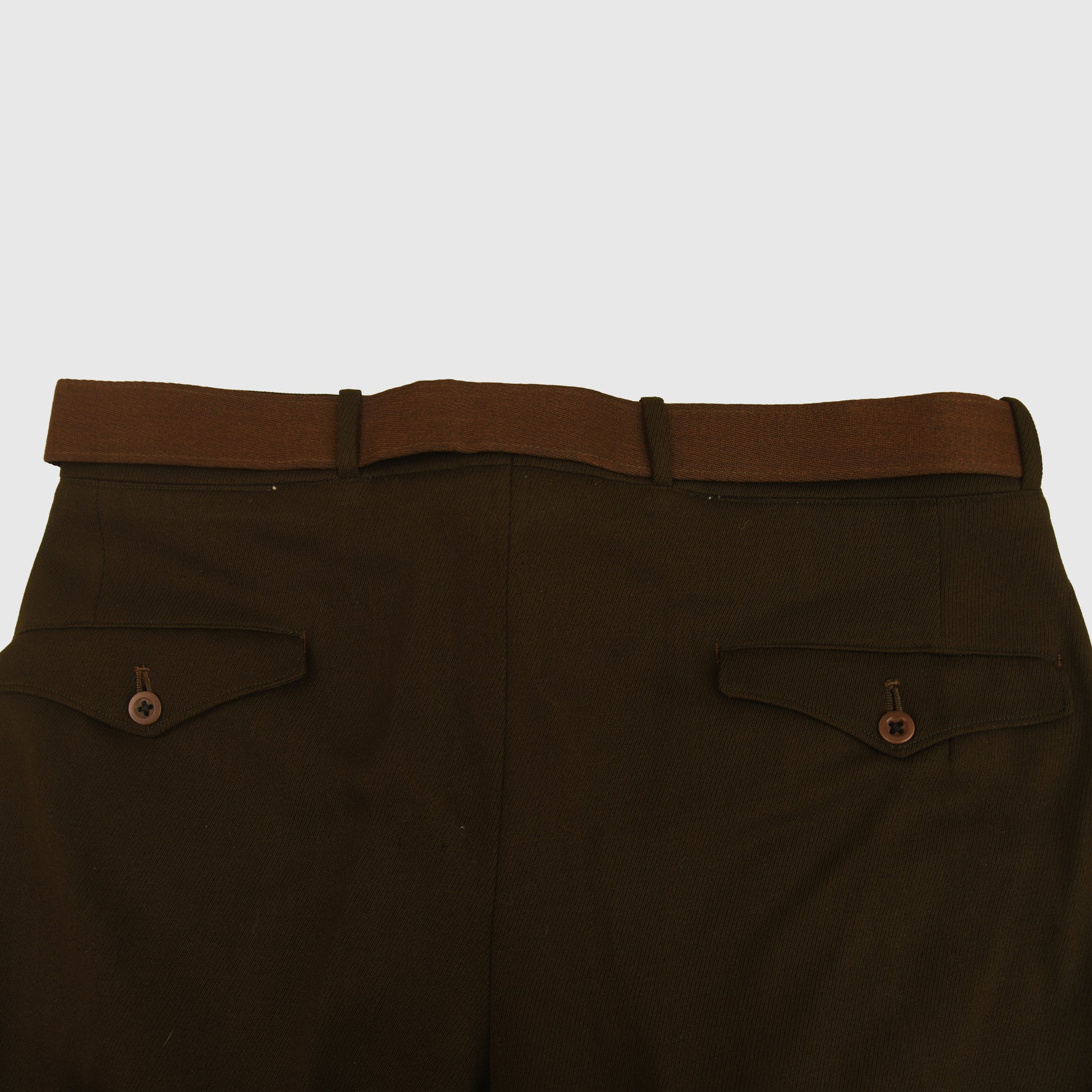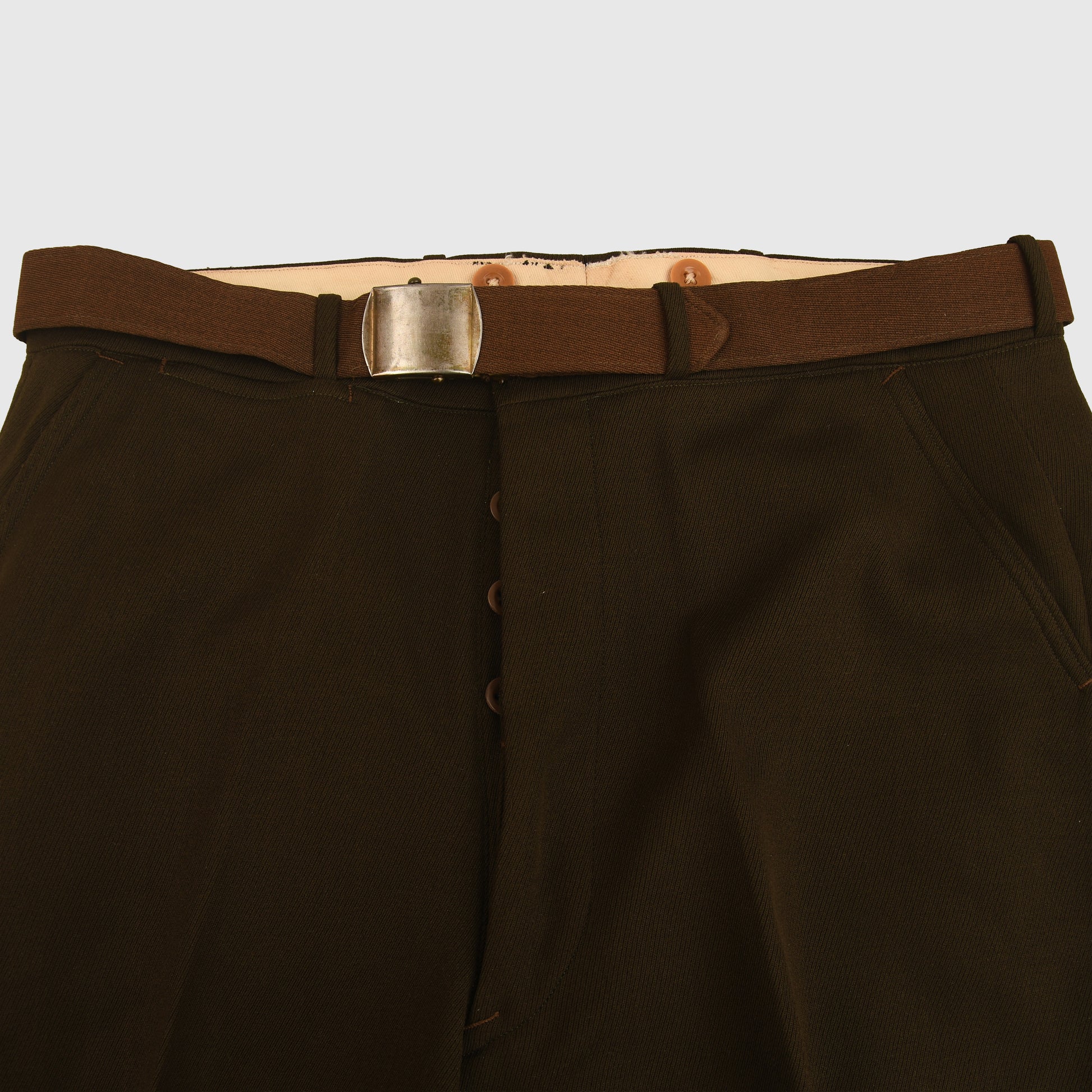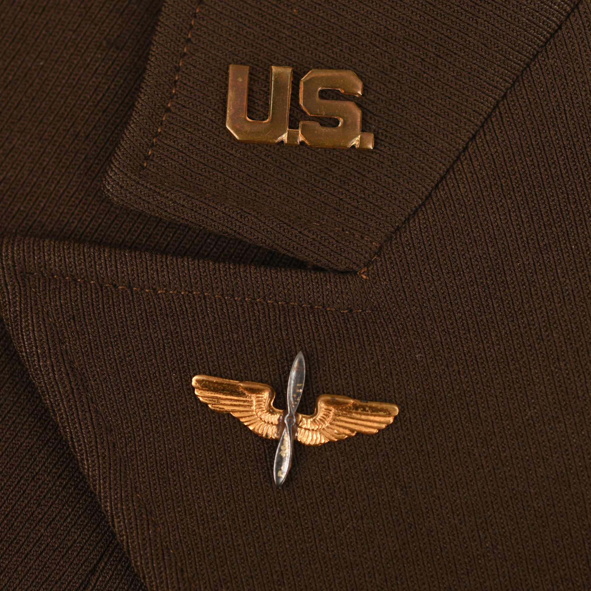 All of the American uniforms for officers in WWII were of the most superb quality, and this is a Standard chocolate colour, blouse-type tunic with two upper pockets with flaps, open collar style. Even the buttons that secure the shoulder boards to the tunic are covered in the same chocolate brown Gaberdine material. A full complement of insignia, Major's oak leaves to the epaulettes. ‘U.S.’ over wing propeller badges to the lower collar. Pilot's wings, held to the tunic by American-style clutches. Medal ribbon bar of three medals. Air Force patch on the left-hand shoulder. To the interior of the tunic pocket, there is a manufacturer's label, accompanied by the British-made trousers of a slightly different shade of chocolate brown than the jacket, with its integral fitted belt having a manufacturer's label of ‘Brown & Haigh, England’. Both portions of the uniform are completely free of any moth damage, repairs or staining.