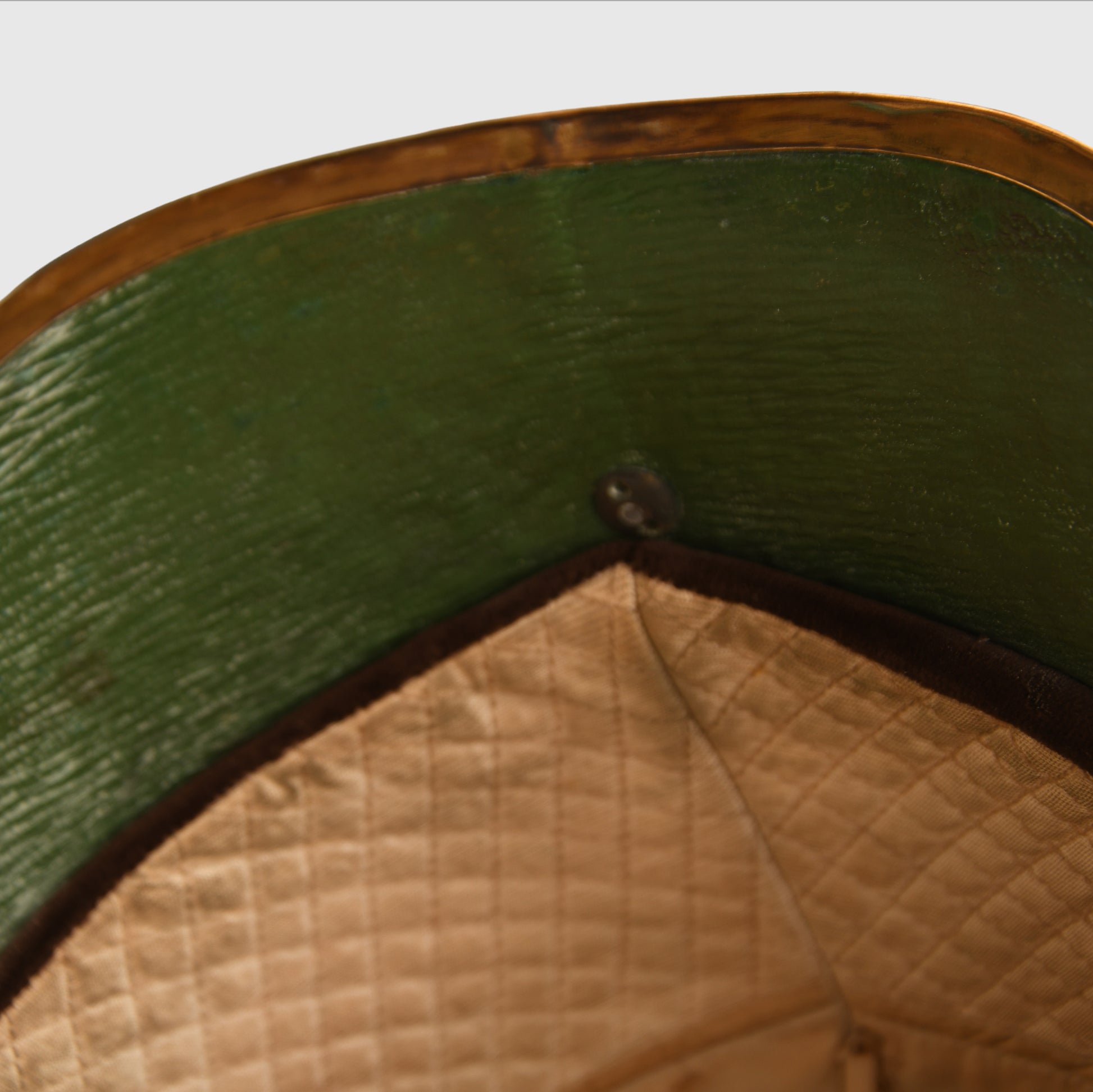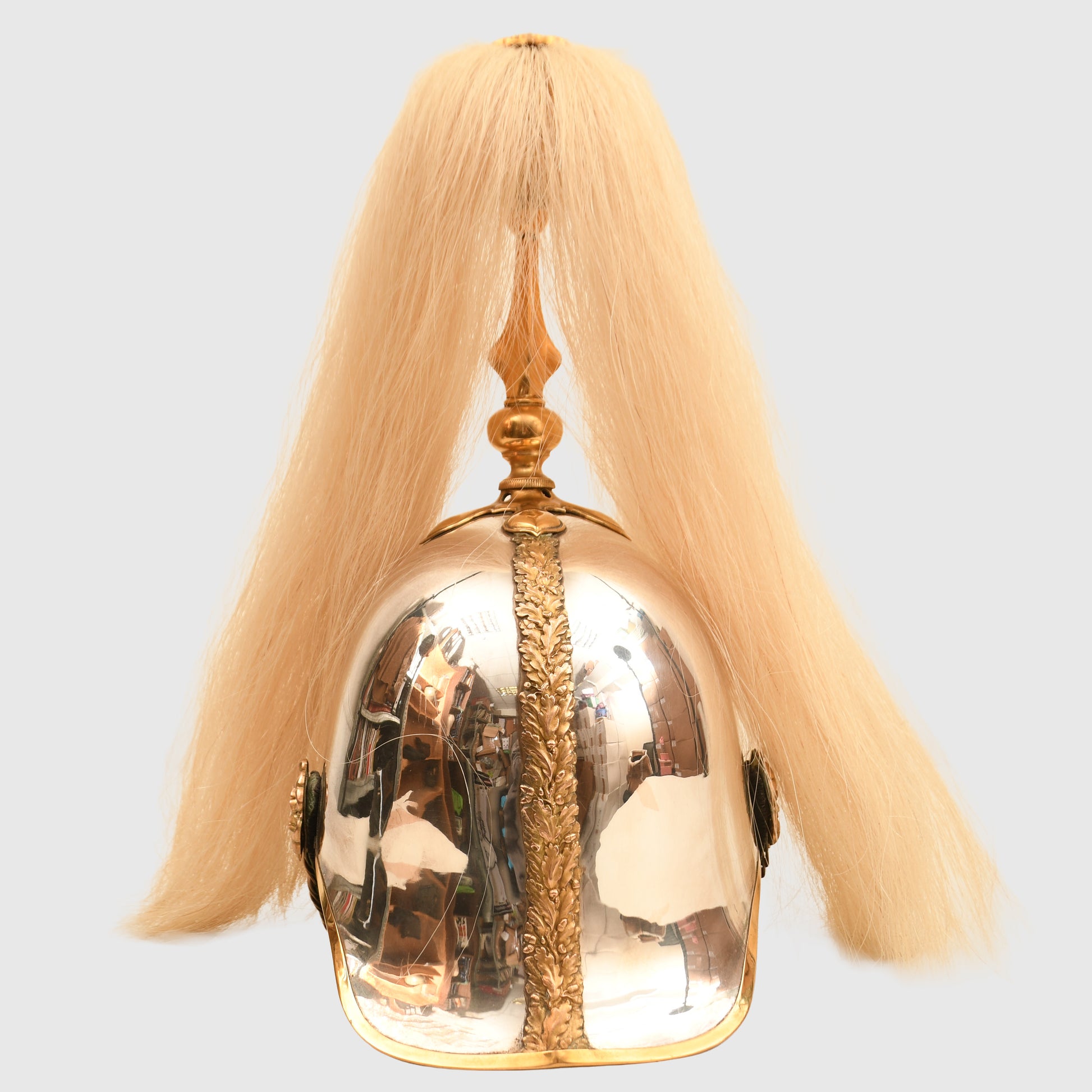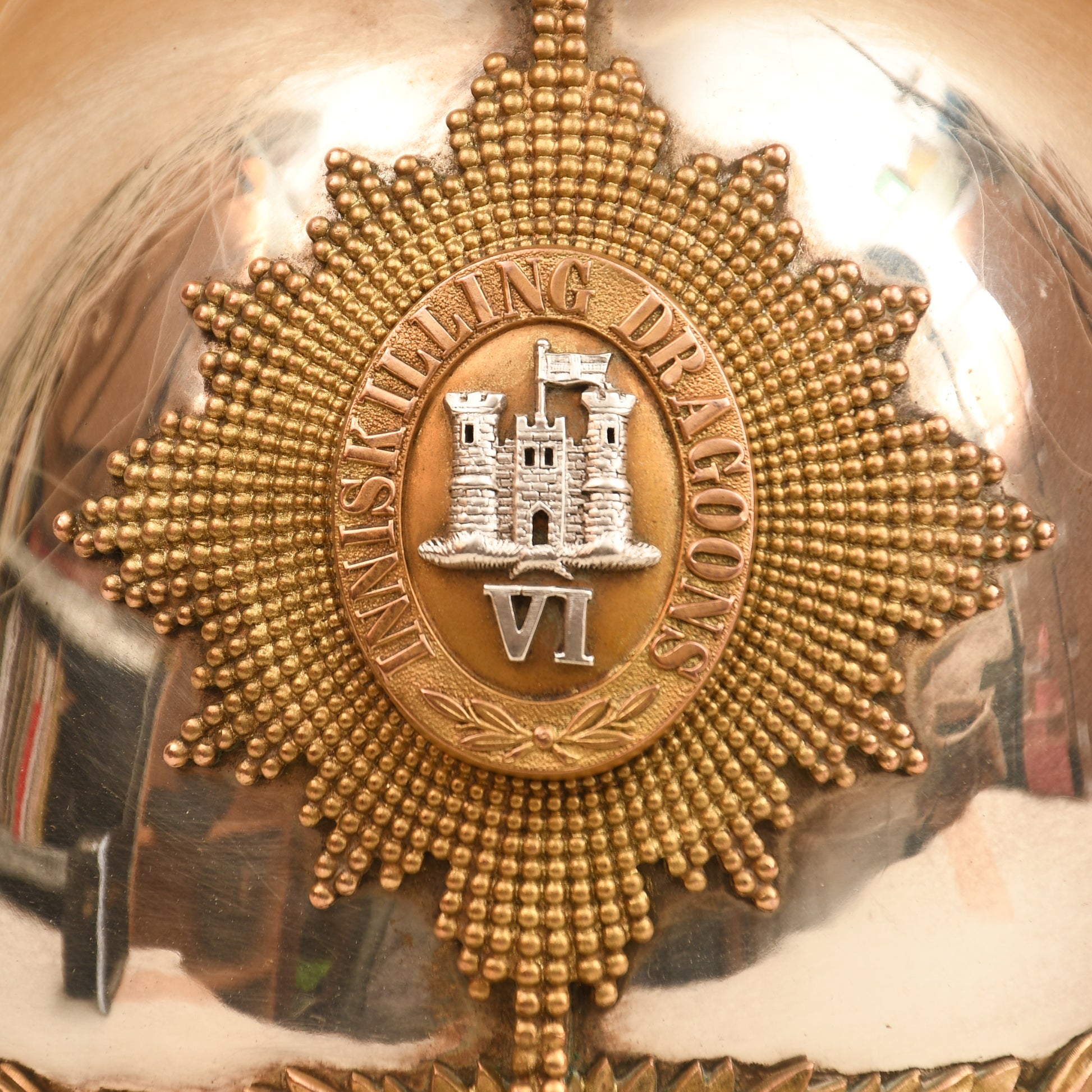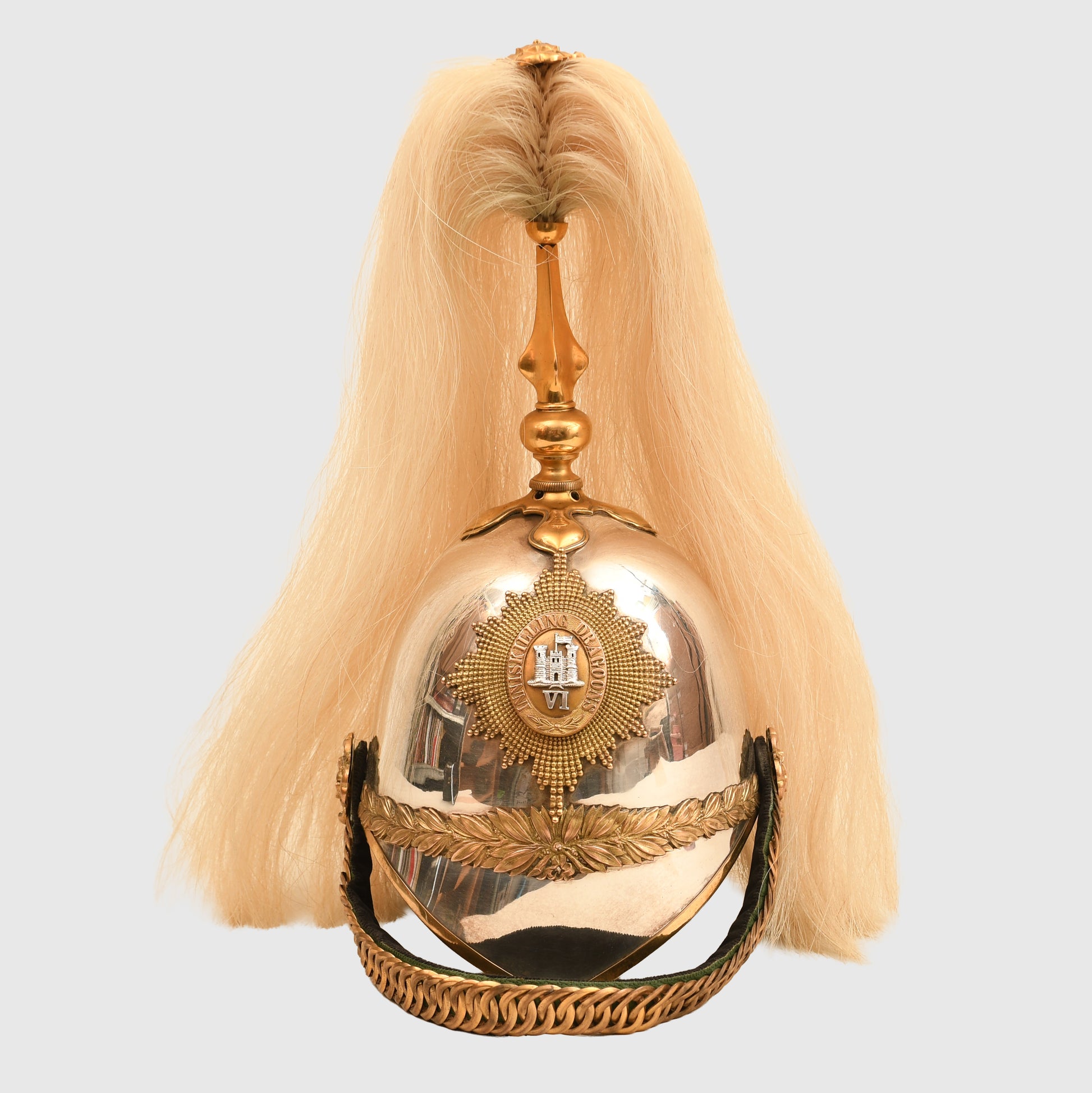 A fabulous example of the 1871 pattern all-metal helmet worn by an officer of the Irish-based 6th Inniskilling Dragoons. The skull is near perfect, with one minute crease just to the left-hand side of the front plate. Gilding excellent overall, with its long officers' quality white horsehair plume. To the centre of the Inniskilling Dragoon front circlet is the castle of Inniskilling in Ireland. Much recruitment for this regiment came from the local Irish population. A nice feature is that the chin chain, backed in velvet, has an inner colour of Irish green; the skull itself is very bright. Complete with its multi-stitched interior liner, green leather lined to the front peak and the inner rear peak. It would be hard to better this example. And to a Regiment with a long and illustrious history.