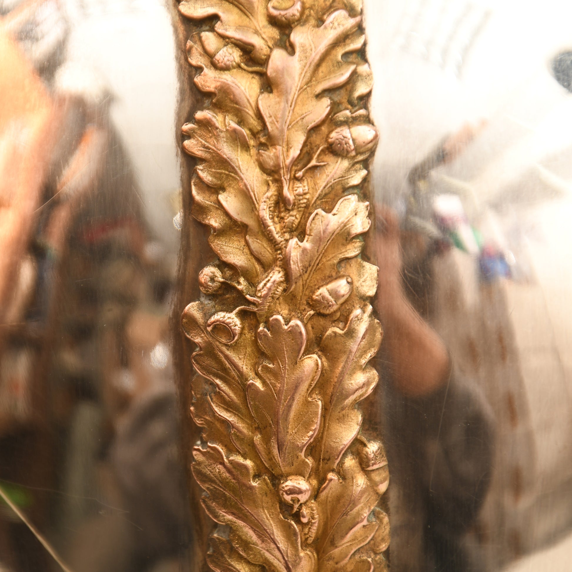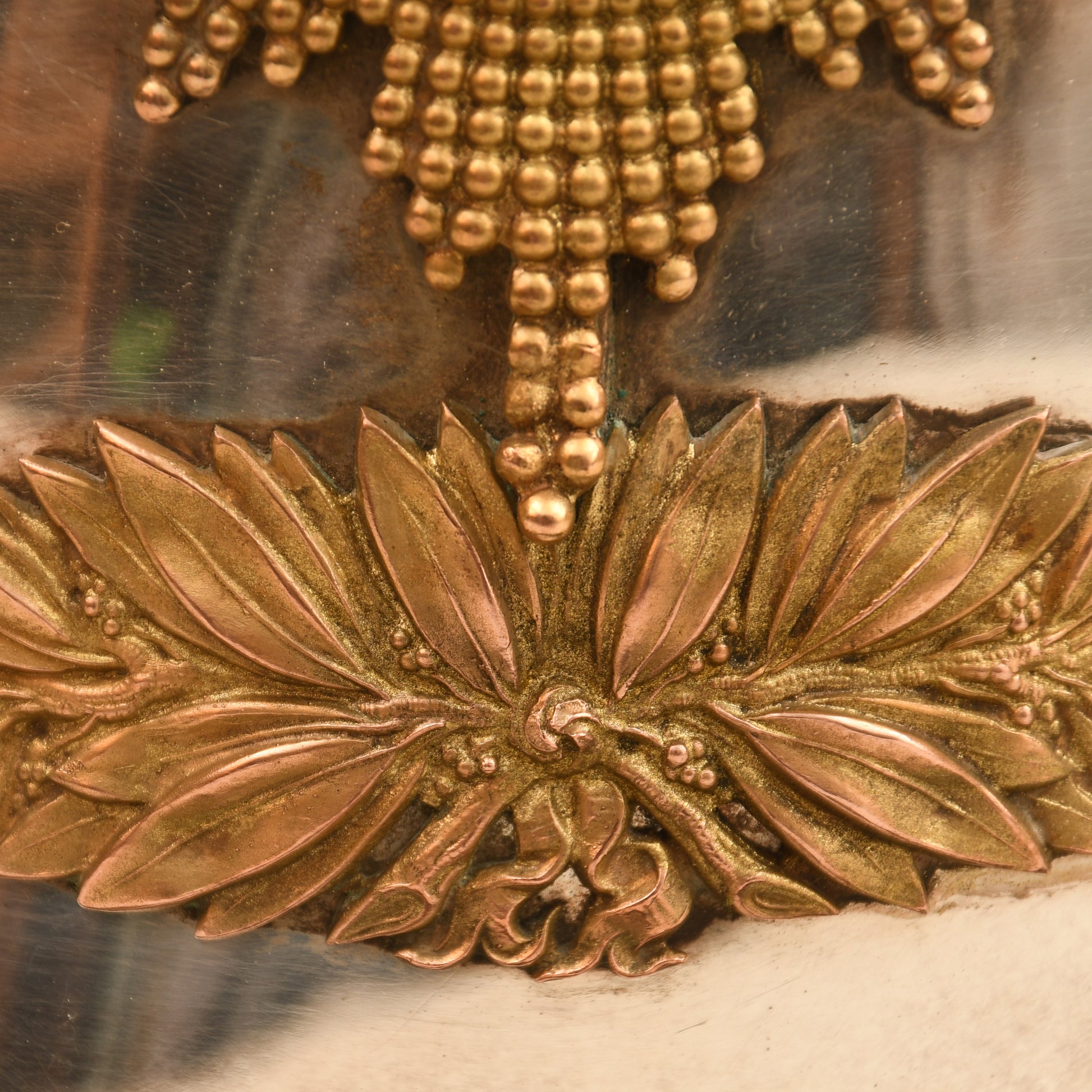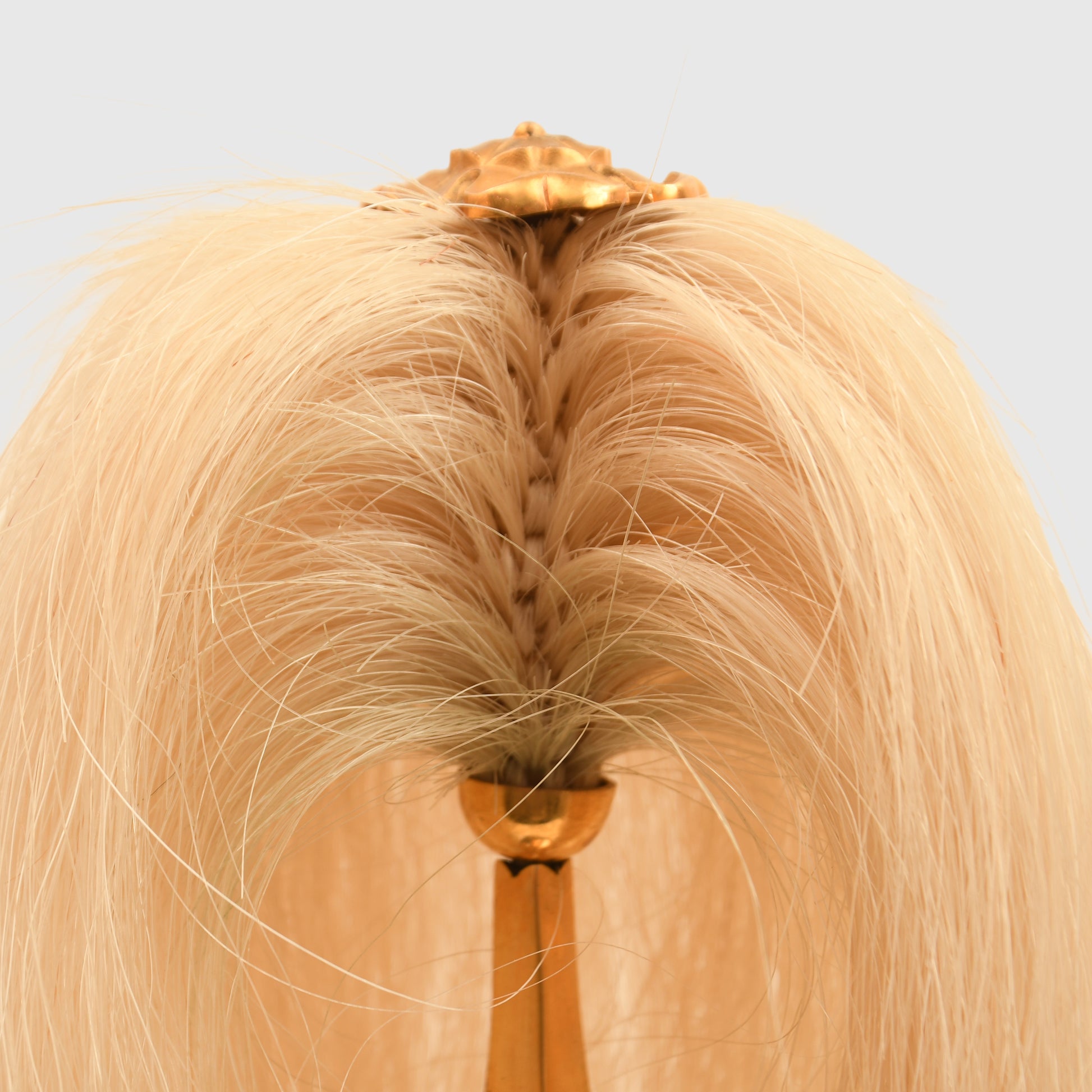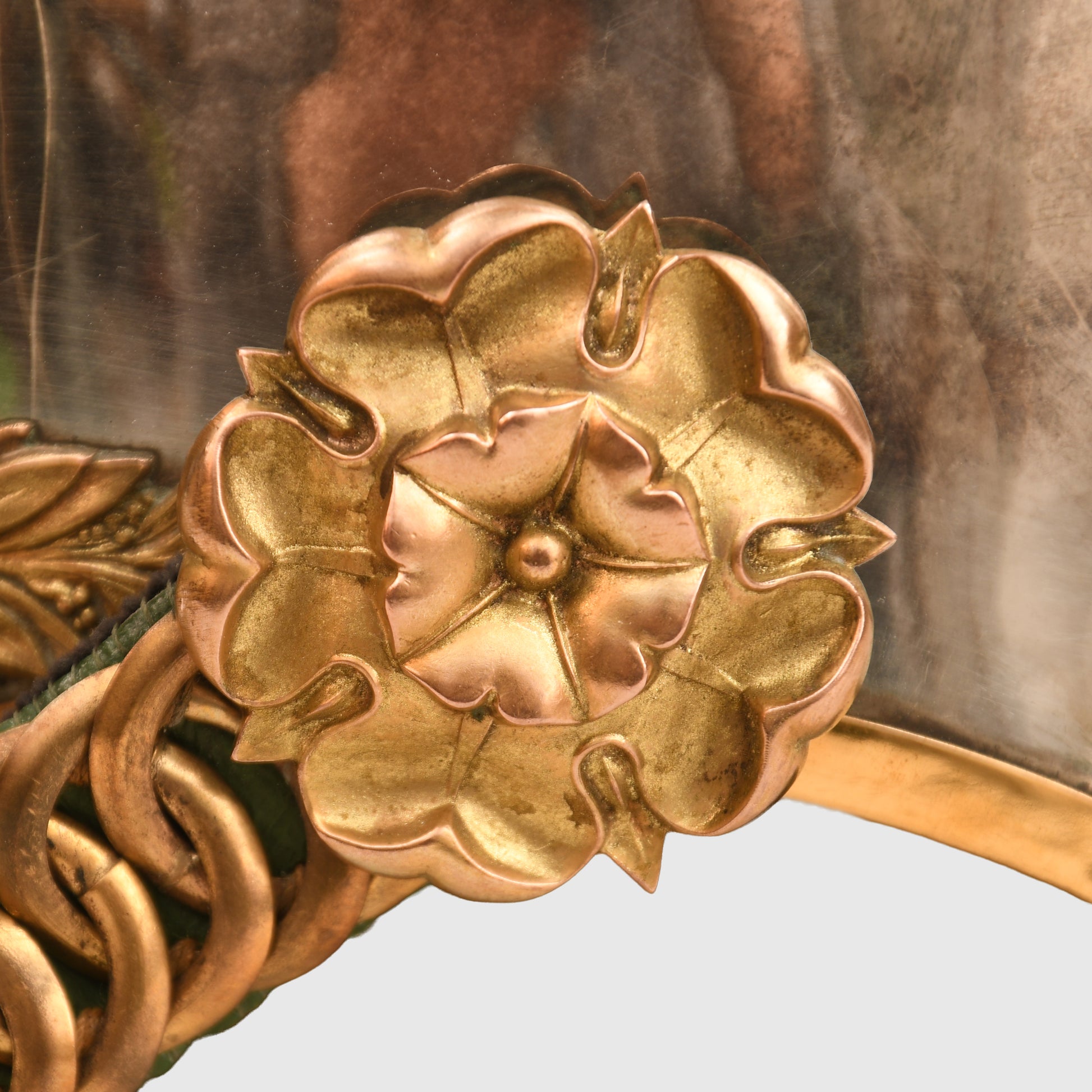 A fabulous example of the 1871 pattern all-metal helmet worn by an officer of the Irish-based 6th Inniskilling Dragoons. The skull is near perfect, with one minute crease just to the left-hand side of the front plate. Gilding excellent overall, with its long officers' quality white horsehair plume. To the centre of the Inniskilling Dragoon front circlet is the castle of Inniskilling in Ireland. Much recruitment for this regiment came from the local Irish population. A nice feature is that the chin chain, backed in velvet, has an inner colour of Irish green; the skull itself is very bright. Complete with its multi-stitched interior liner, green leather lined to the front peak and the inner rear peak. It would be hard to better this example. And to a Regiment with a long and illustrious history.