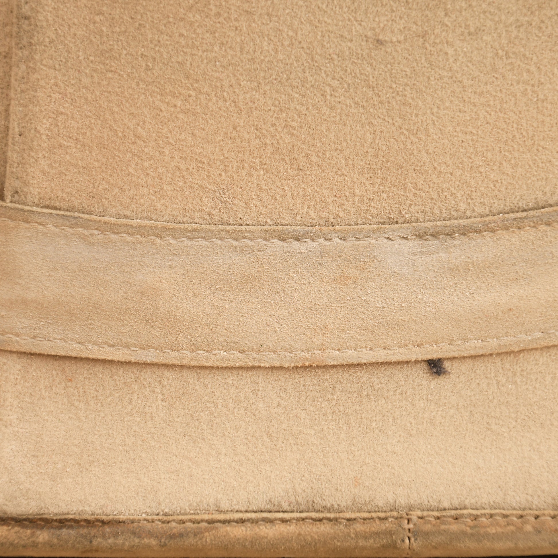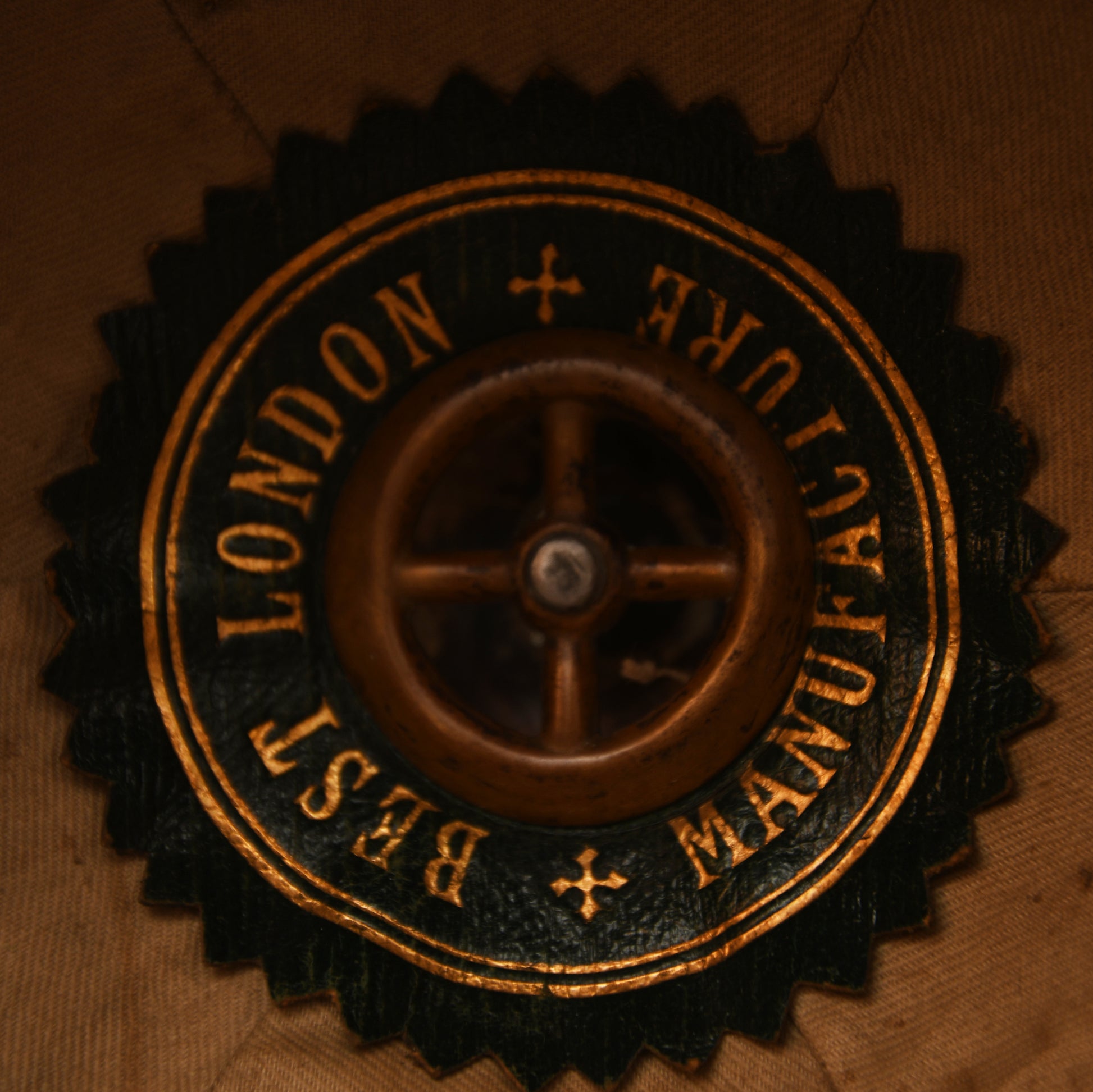 A six-panel white-over-cork officers colonial helmet in generally nice condition from the late 1870s. The cork body is undamaged, with only slight age staining to parts of the cloth covering. The interior features a gilt-blocked maker’s label on green leather to the upper crown, marked “Best London Manufacture.”