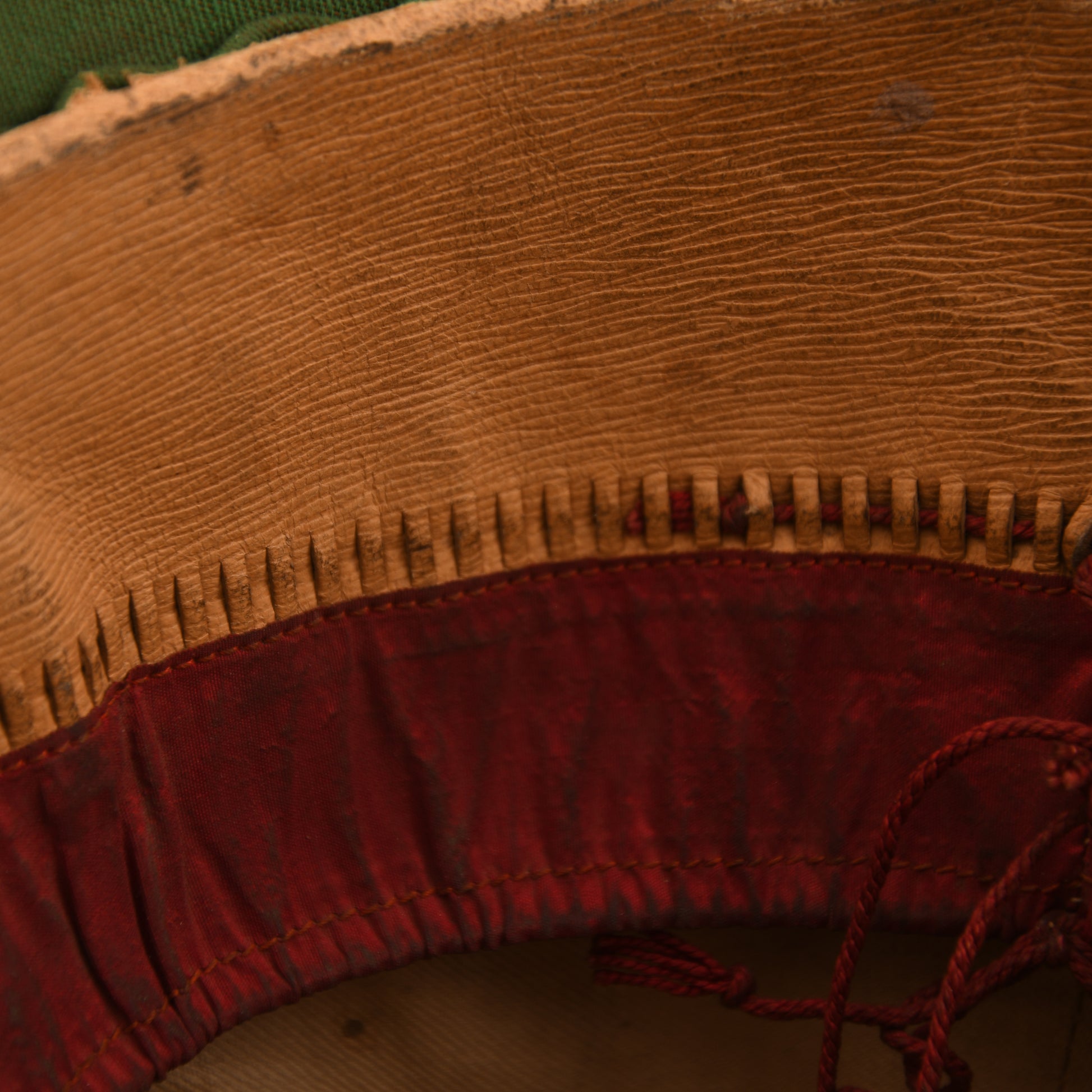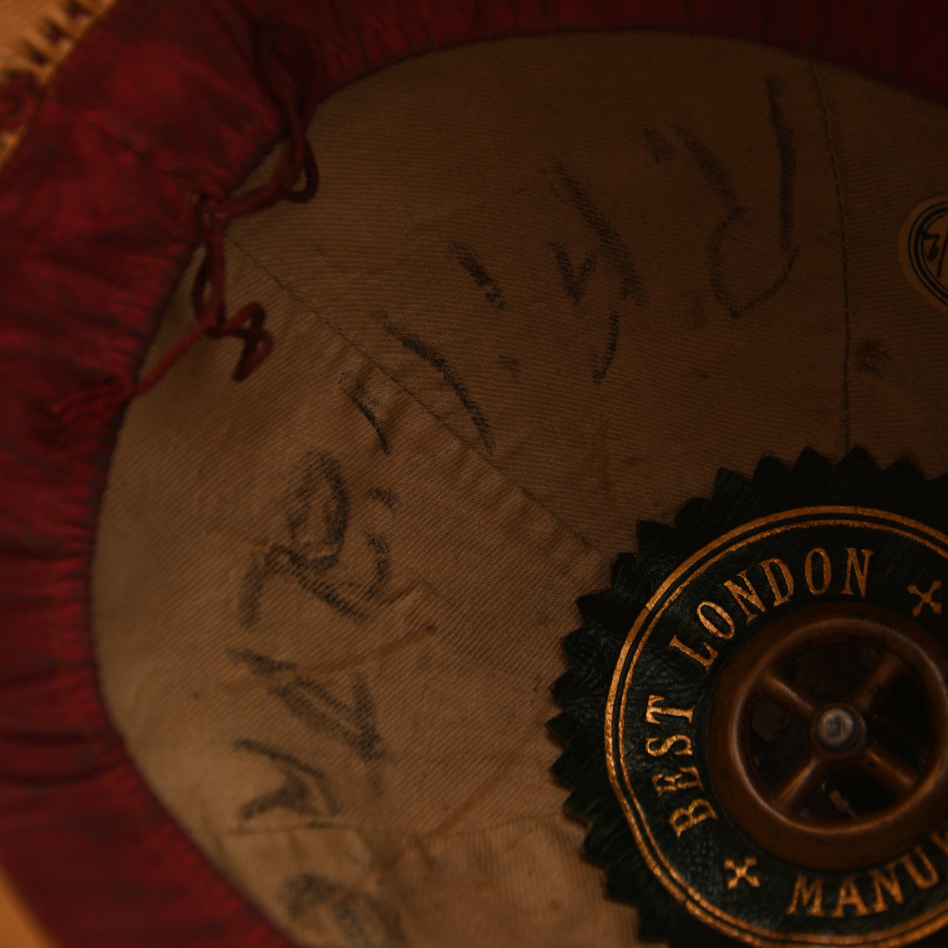 The liner follows the British home service pattern used from 1878 to 1911, with a light tan leather band and attached red silk section, two clips for a chin chain, and a large hand-applied name inside the bowl, possibly reading “RF Cotterell.” The same name is also written on the green inner lining at the rear tail of the helmet. A regimental plate was originally fitted but has been removed, leaving three blocked holes.