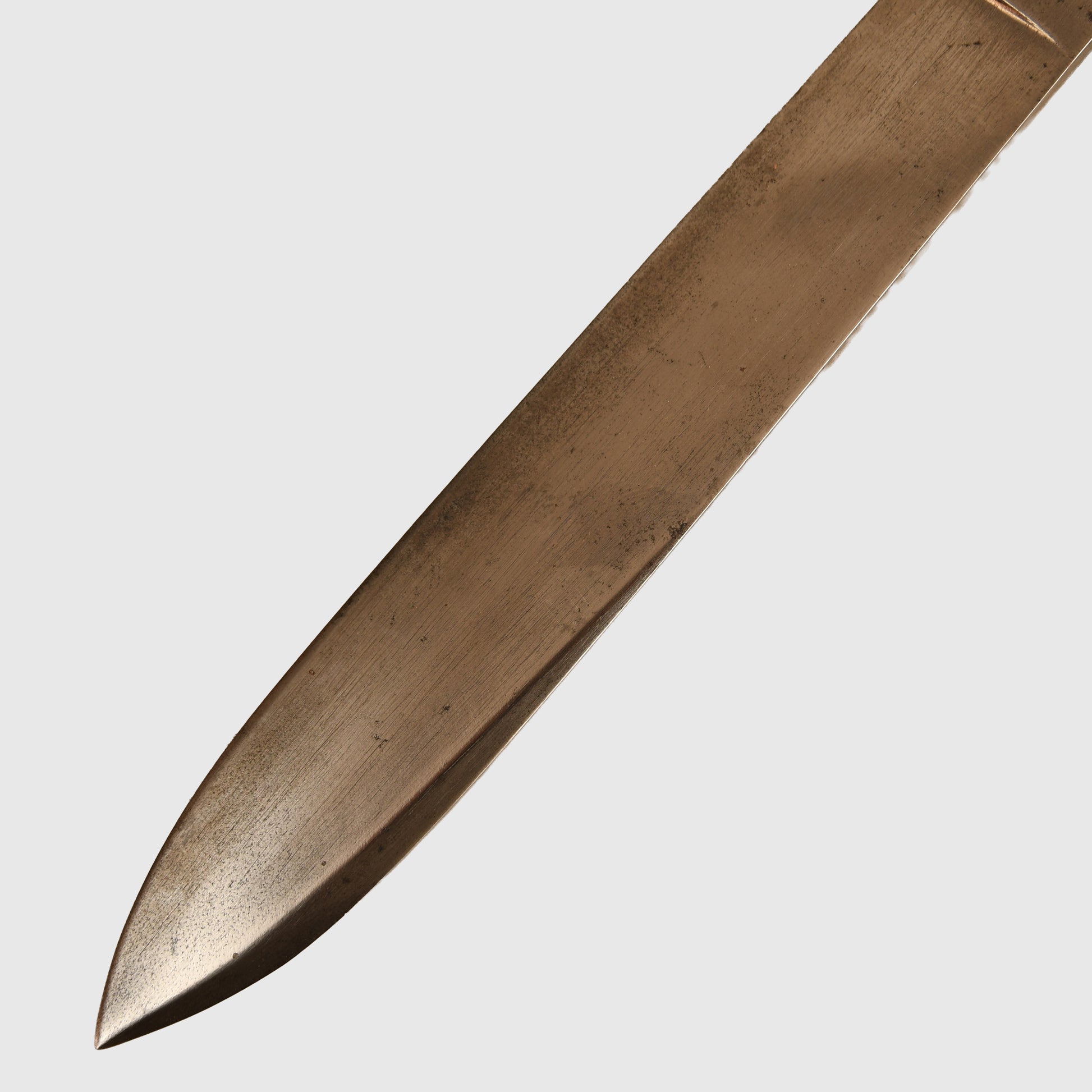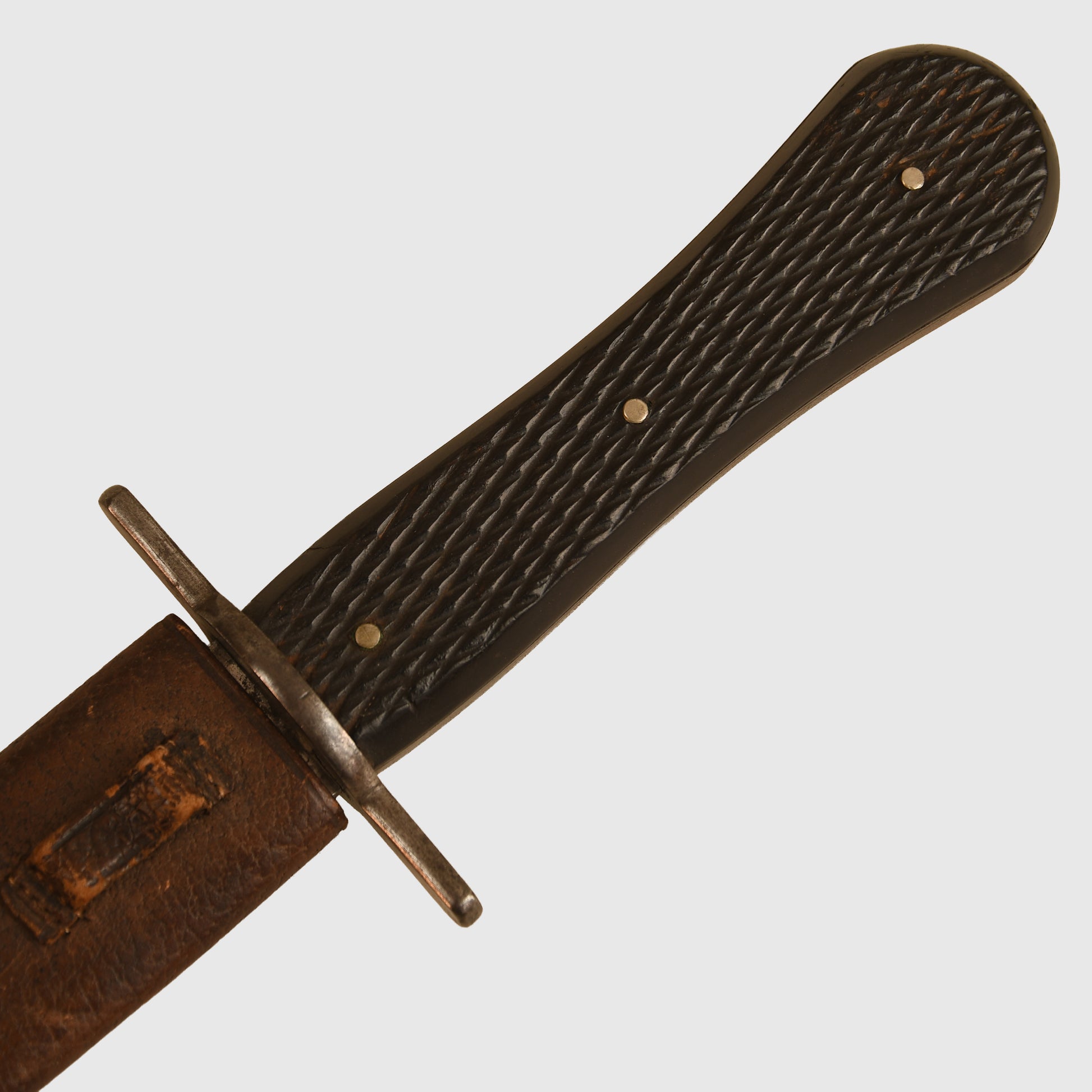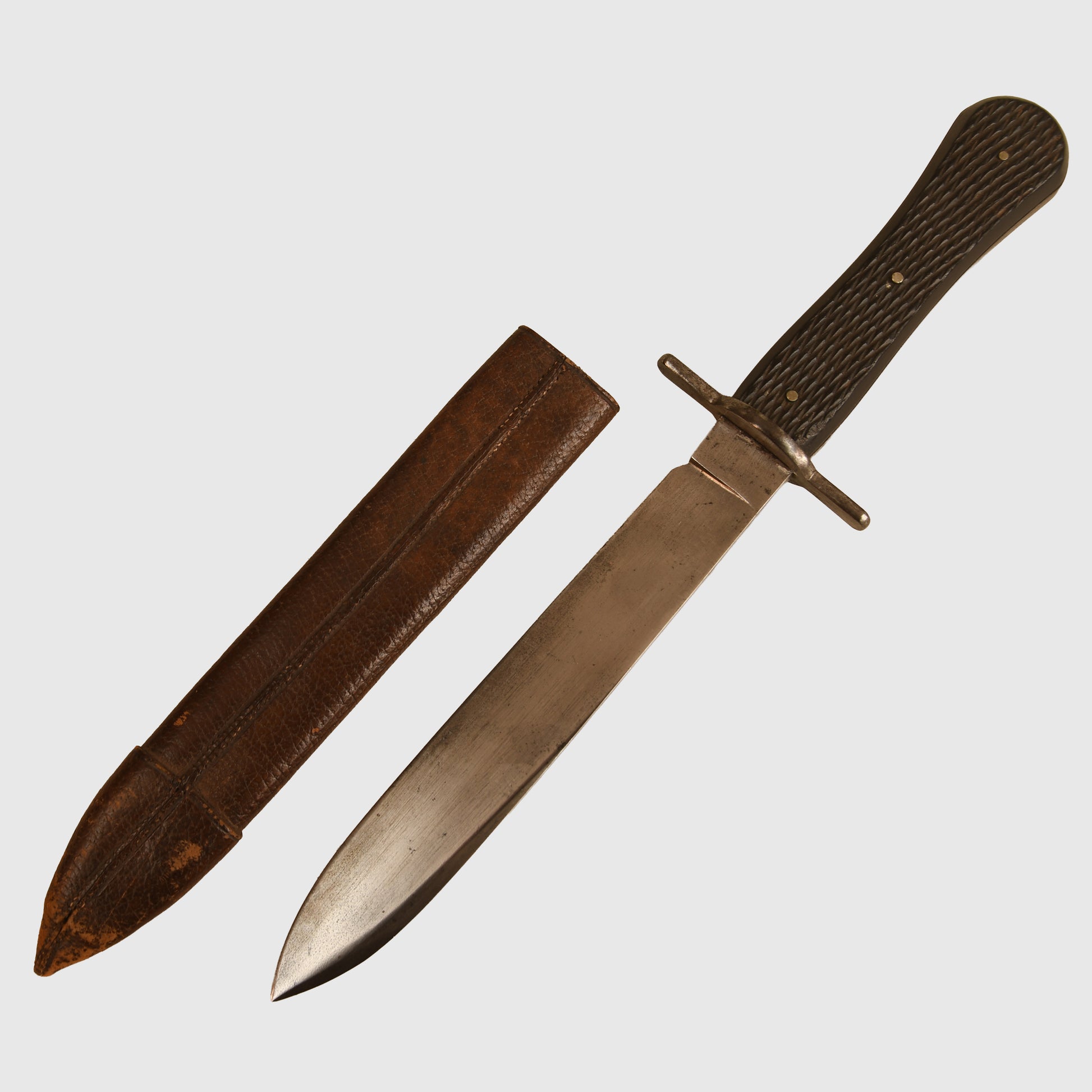 A superb pre-First World War display piece produced by the renowned Thornhill Company of London, with a history dating back to 1734. Measuring 32cm in total length, with a 19cm original polished section clearly stamped ‘VR’ over ‘Thornhill, London’. The piece features a beautifully chequered black horn grip attached to the steel tang, secured with three rivets, and complemented by a straight steel cross guard. Fitted into its original leather scabbard, complete with its narrow belt loop. The grip retains exquisite cross-hatched detailing, reflecting the high-quality craftsmanship of Thornhill. Various examples of Thornhill pieces are illustrated in full colour in The London Knife Book: An A to Z Guide to London Cutlers 1820 to 1945. The Thornhill Company closed in 1912.