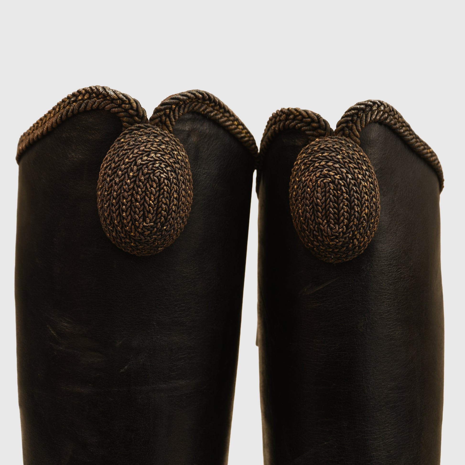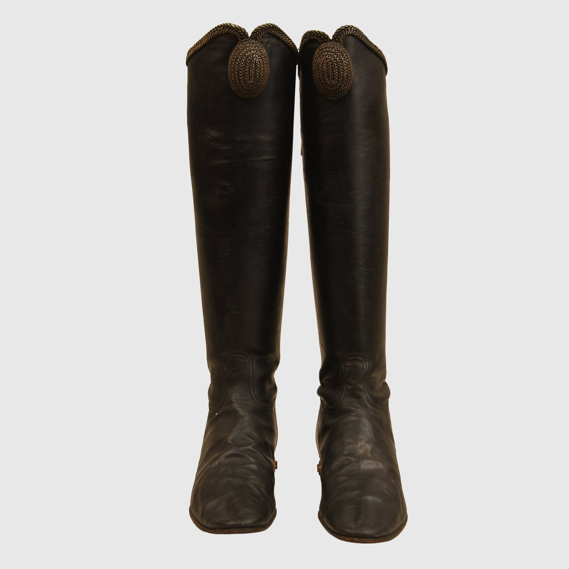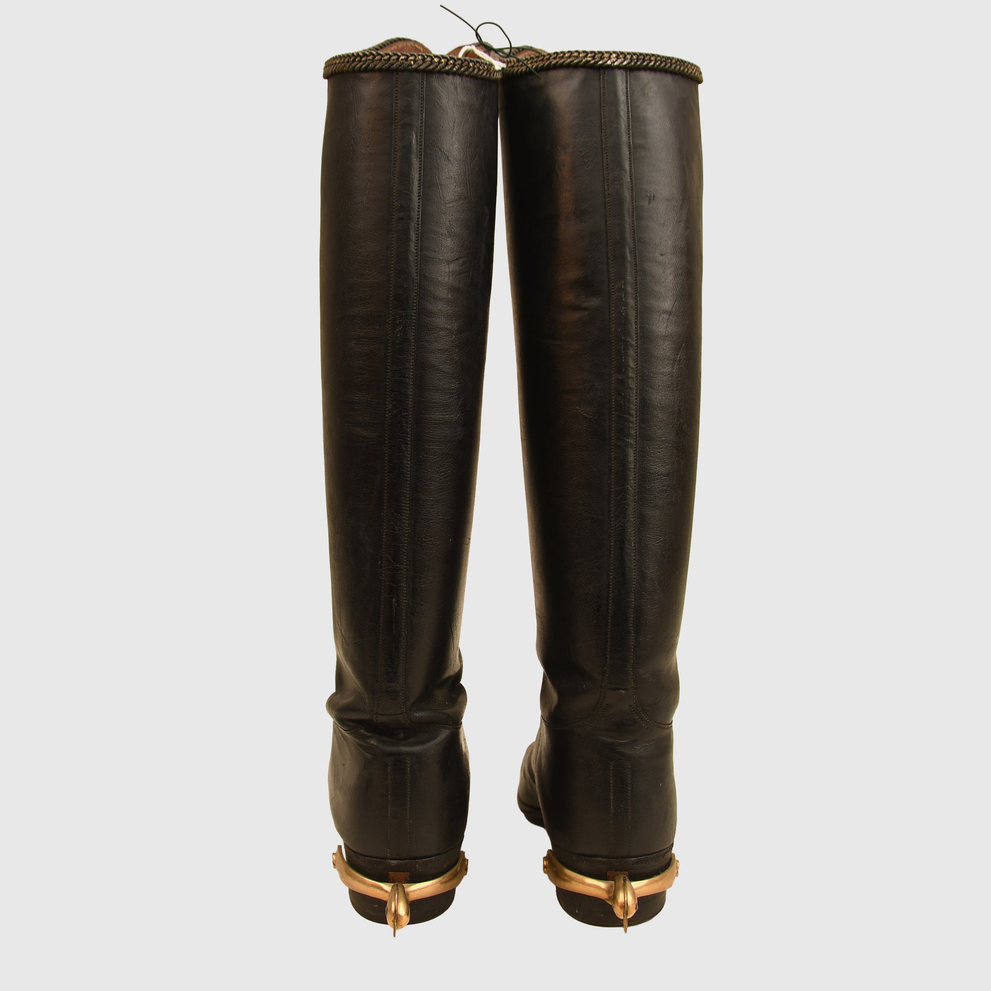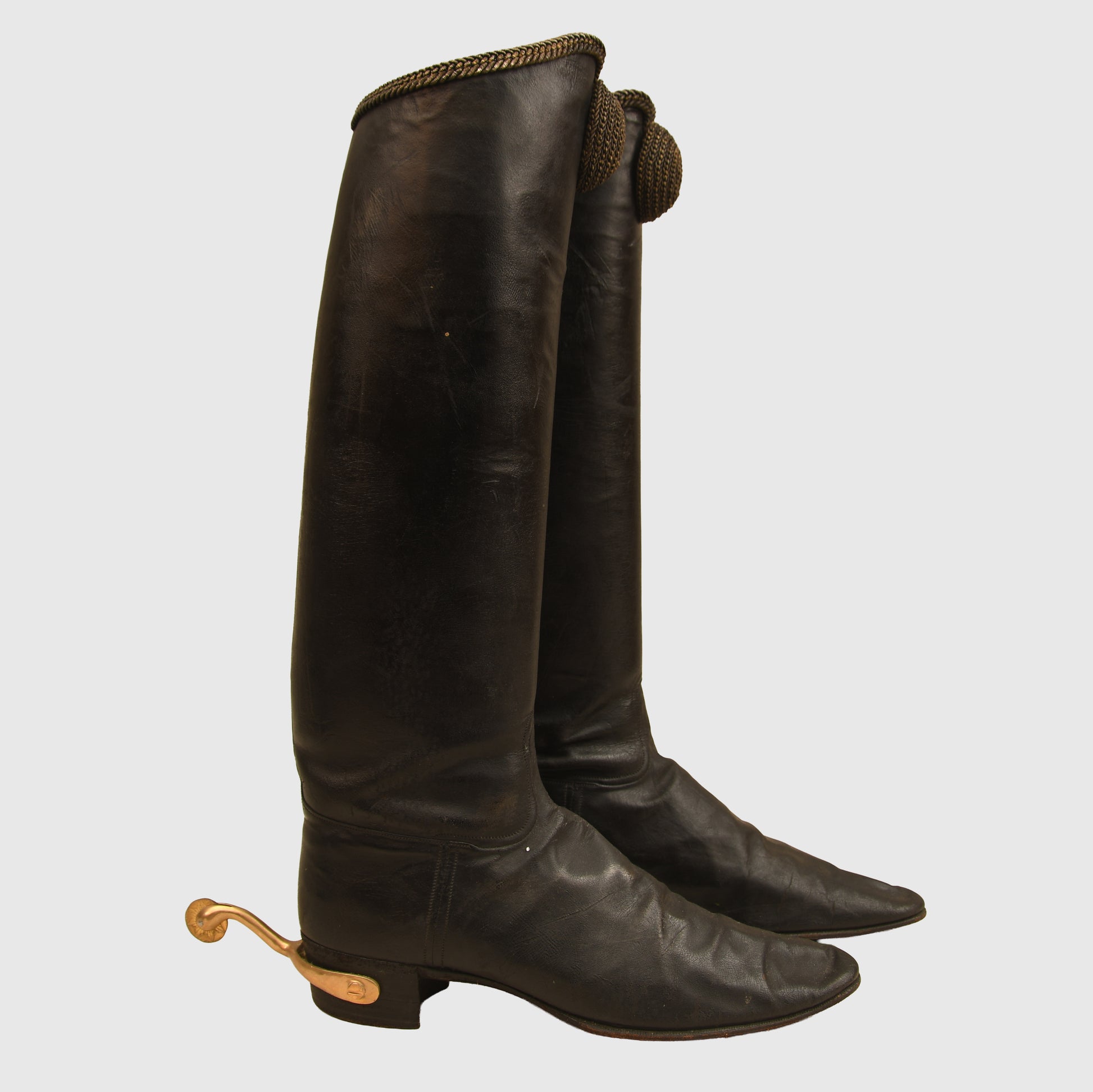 The construction remains sound, and the presence of the original spurs adds significant display value. As is typical for historical footwear of this age, these are intended strictly for mannequin or cabinet display and are not suitable for contemporary wear.