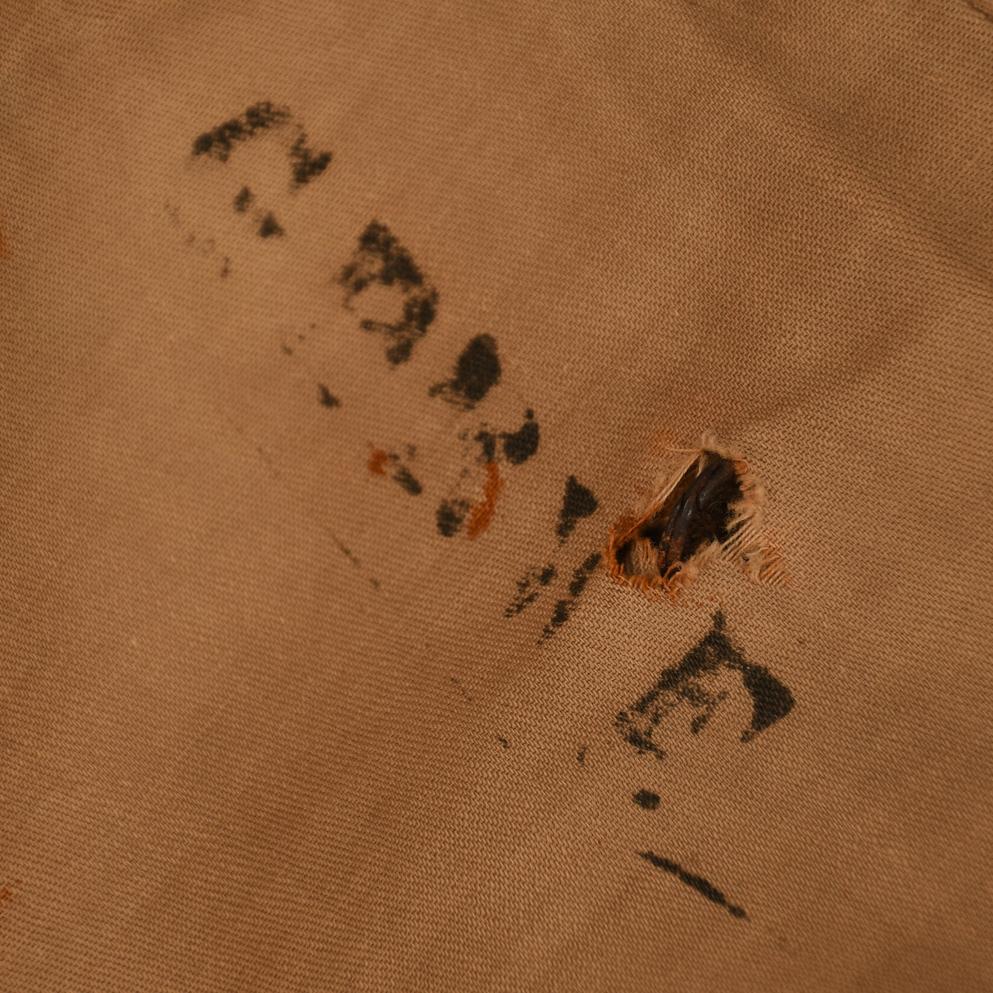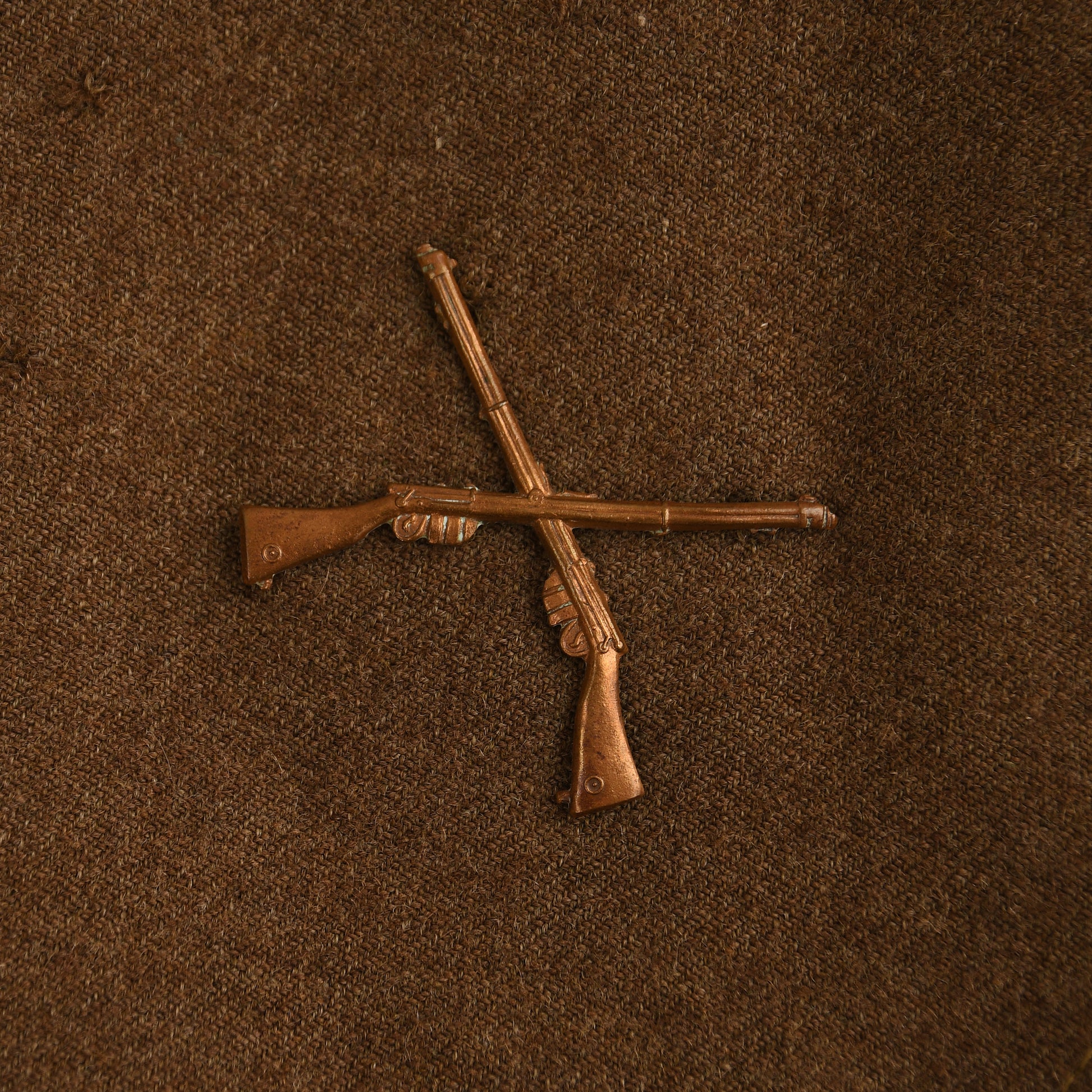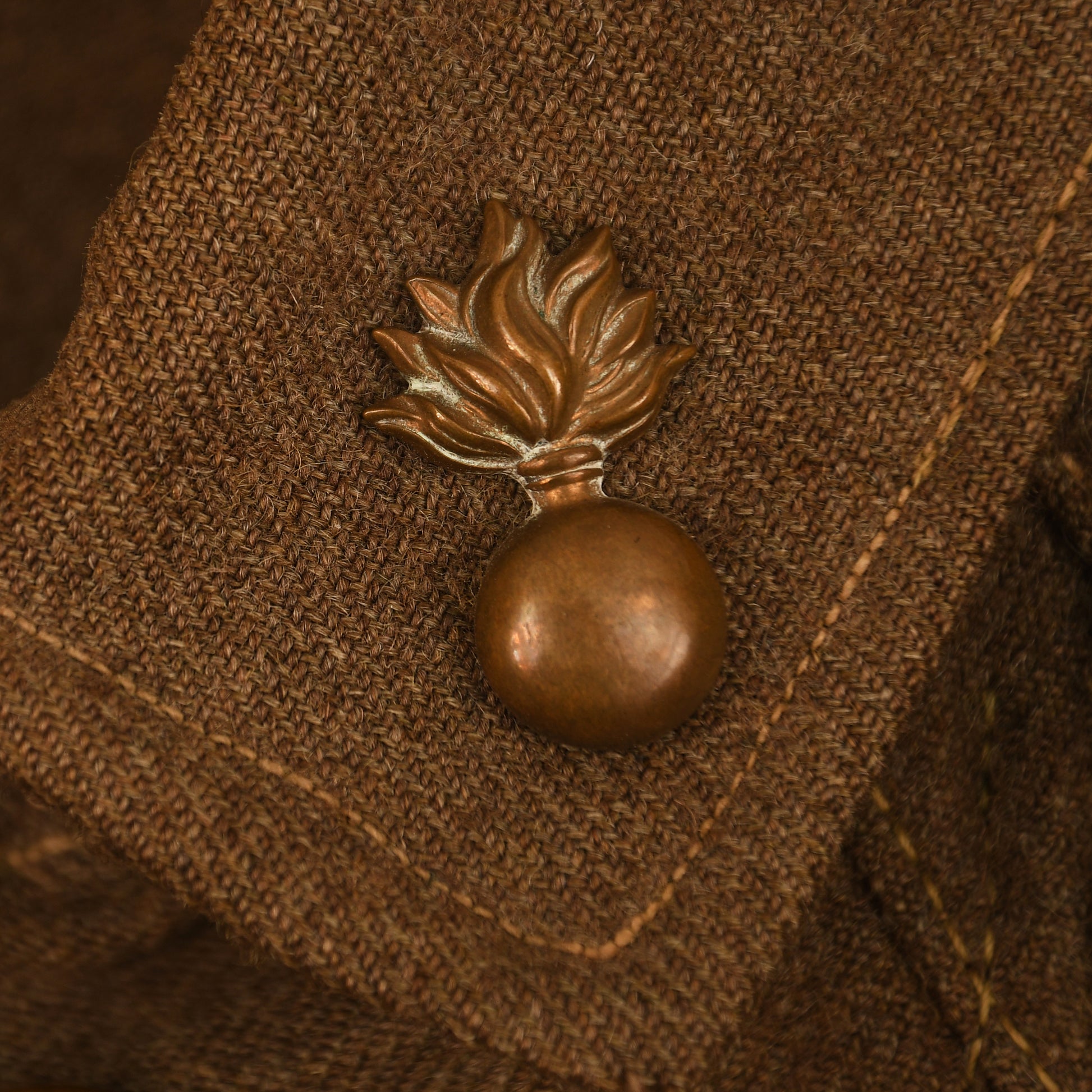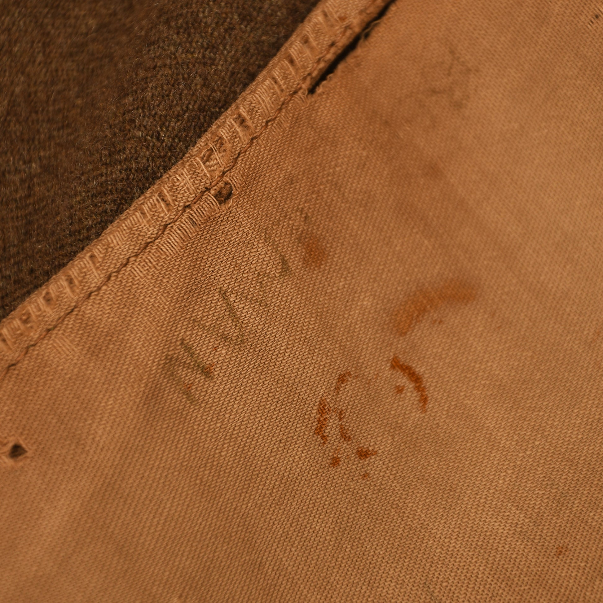 A service-worn and untouched 1902 pattern British combat tunic, formerly worn by a Corporal in the Royal Welsh Fusiliers. The cloth shows thinning nap, with three small moth holes to the upper rear panel and one large tear beneath the left armpit. All original regimental pattern buttons are present except for one lower pocket button, which has been replaced. Shoulder boards display the flaming grenade with “RWF” title below, complemented by flaming grenade collar badges. Additional details include a green company lanyard and a marksmanship cross with rifles on the lower right sleeve. The interior lower pocket bears two separate wearers’ names—one stamped, one handwritten—with a third set of initials in green ink applied to the lining, suggesting the tunic may have been worn by three different men. The remains of the original paper label are still visible.