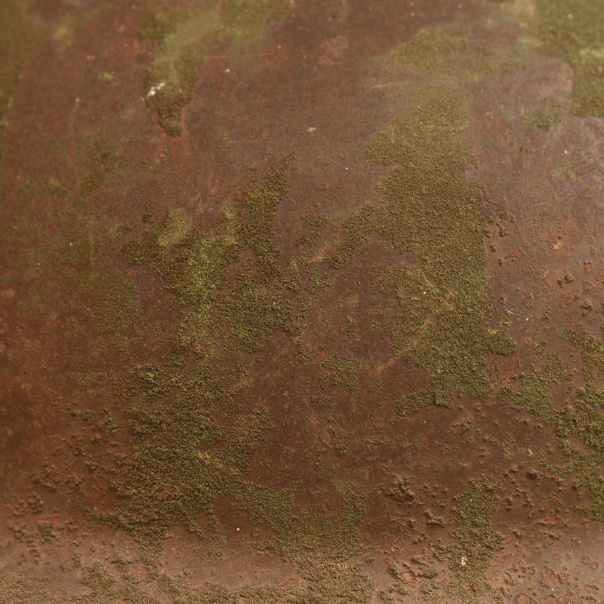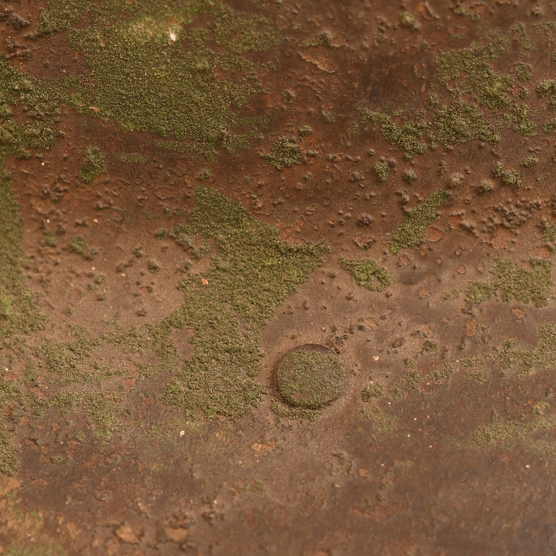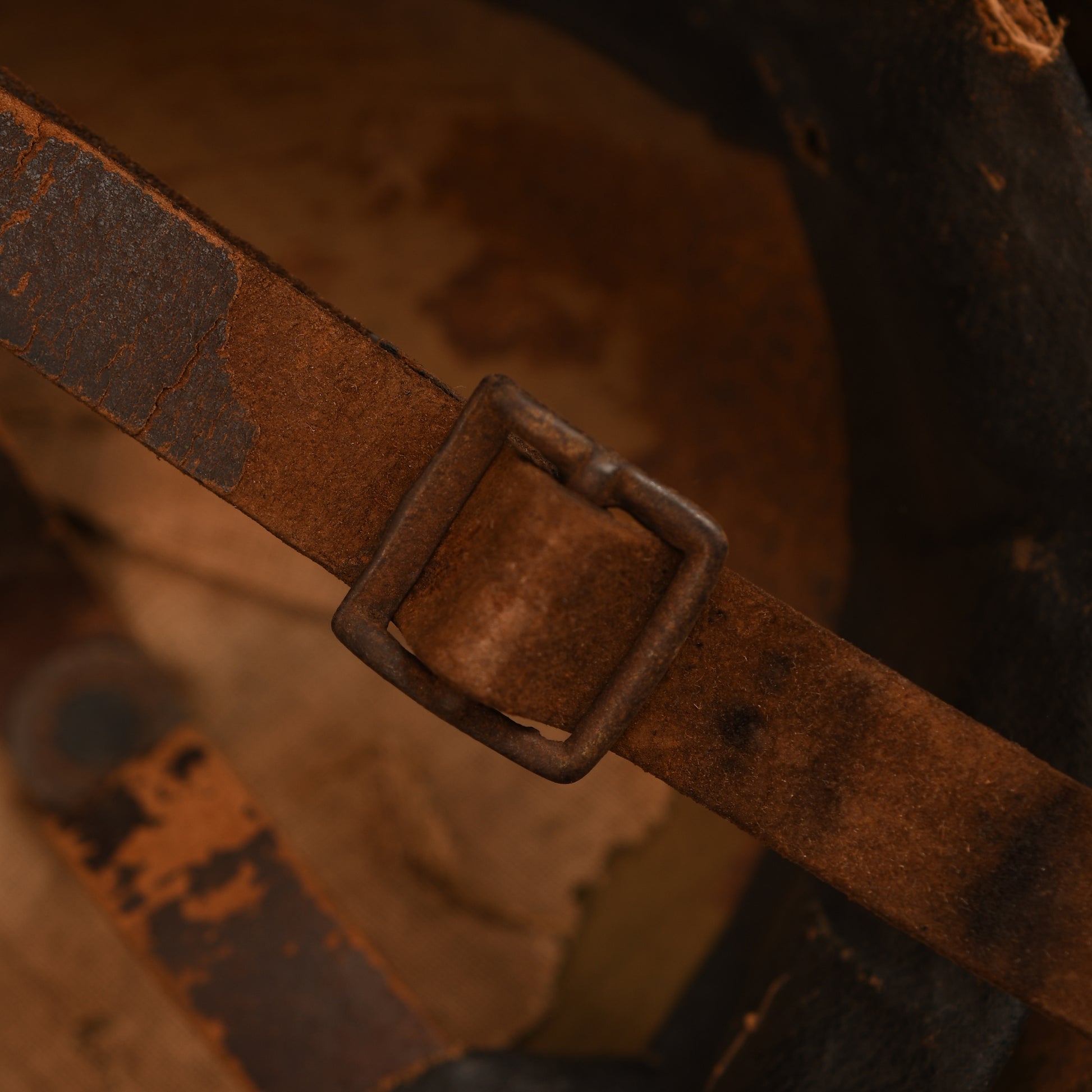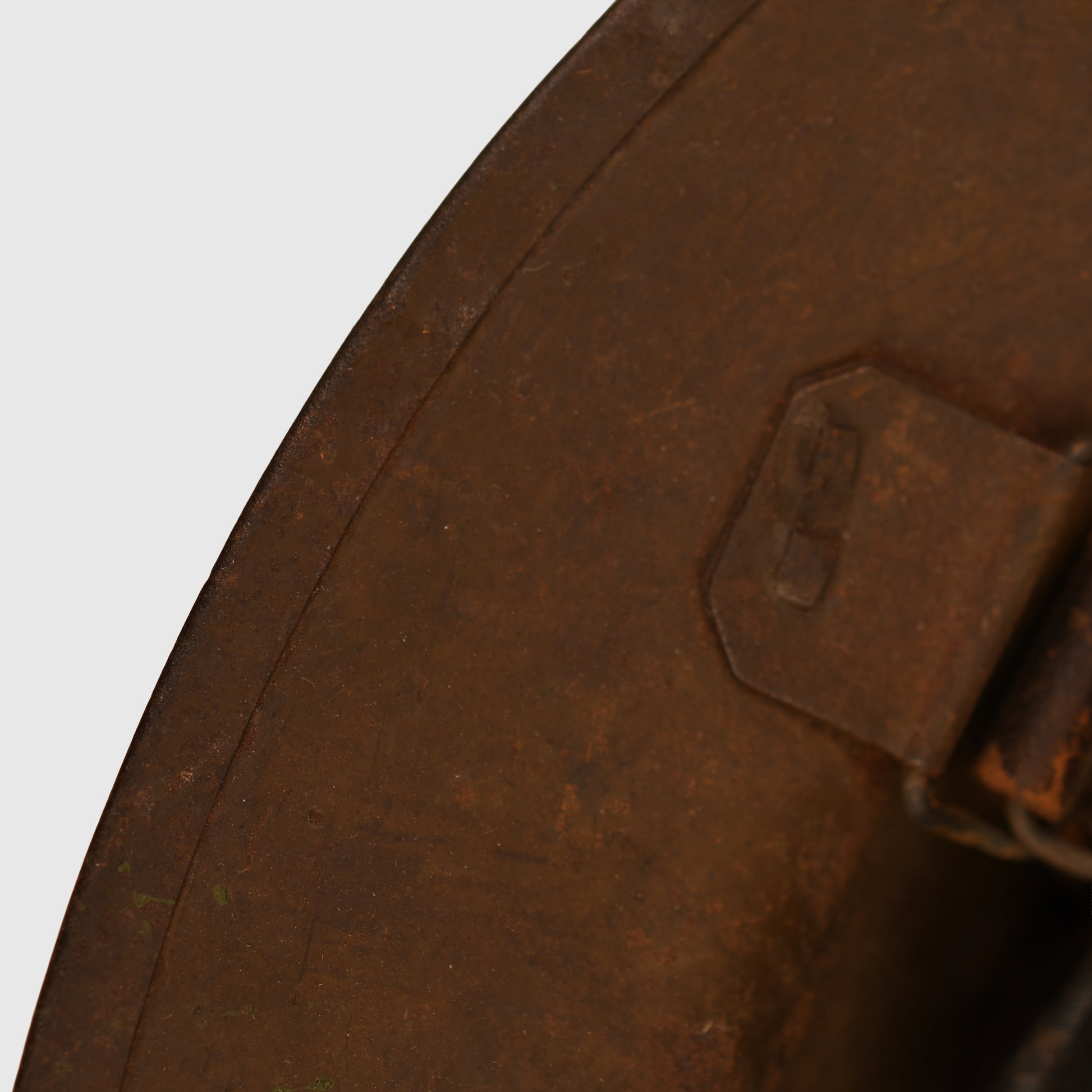 A good example of a standard 2nd pattern Brodie helmet. The shell remains in solid condition, featuring an unusual green paint applied over the original sand-based khaki finish. Paint losses are evident, as shown in our web images, though it is unclear whether this colour variation was intended as camouflage or a specific unit marking. The helmet retains its original fabric liner and leather chinstrap, though the inner horsehair padding is missing. Faint traces of an owner’s name or possible unit designation can be seen on the inner flap skirt.