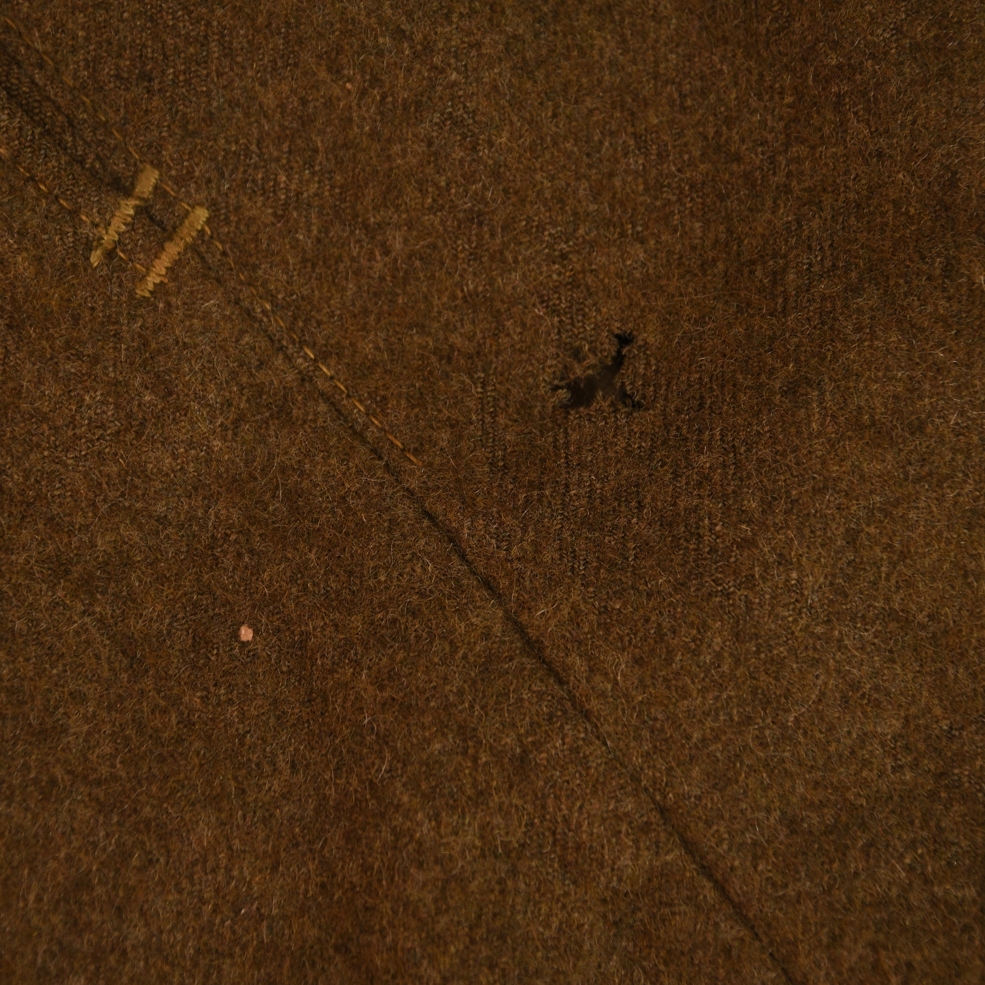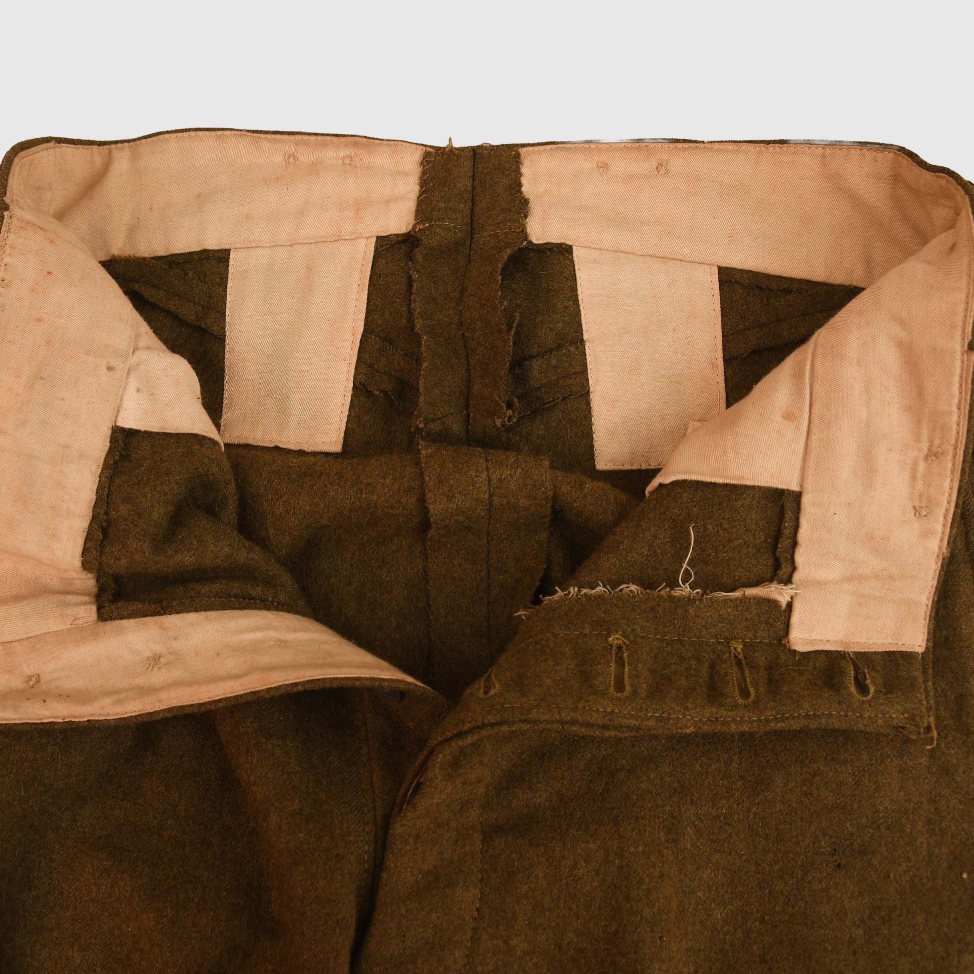 This pair remains in very good condition, with only minor moth activity—small areas of loss near both pocket apertures, one small hole on the upper thigh, and two on the lower seat area. The cloth retains its full original nap and texture throughout. Constructed with the standard double stitching at the base of each side pocket and fitted with zinc buttons. The interior shows light wear and use staining to the cream cotton lining.