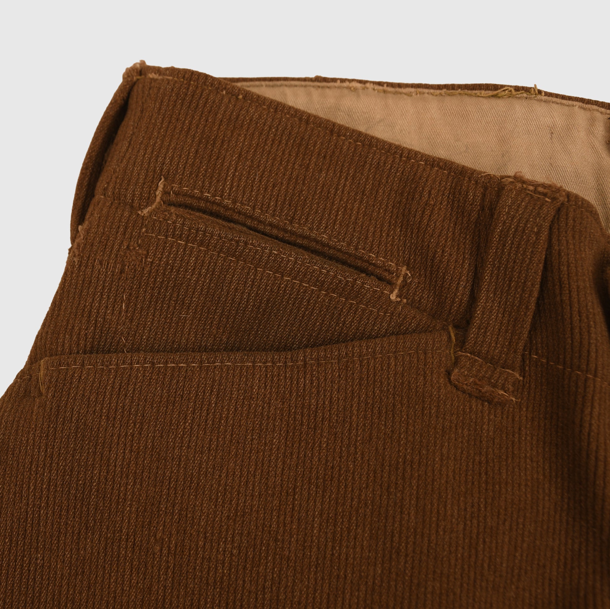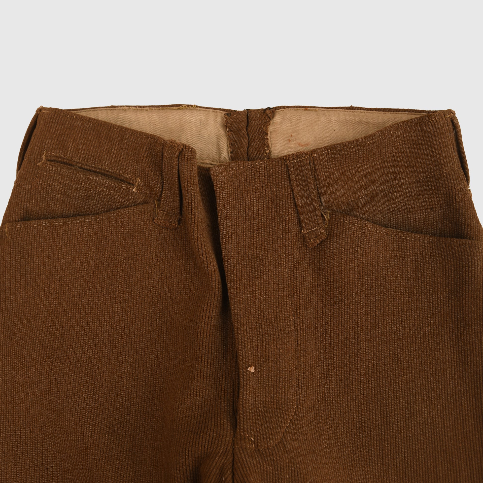 A clean and well-preserved set of corded breeches as worn by enlisted men and NCOs of the mounted artillery. Minor staining is visible to the seat area, otherwise the breeches remain in excellent condition. All original zinc fly buttons are present, and the ankle laces for fastening the breeches are fully intact. No moth damage.