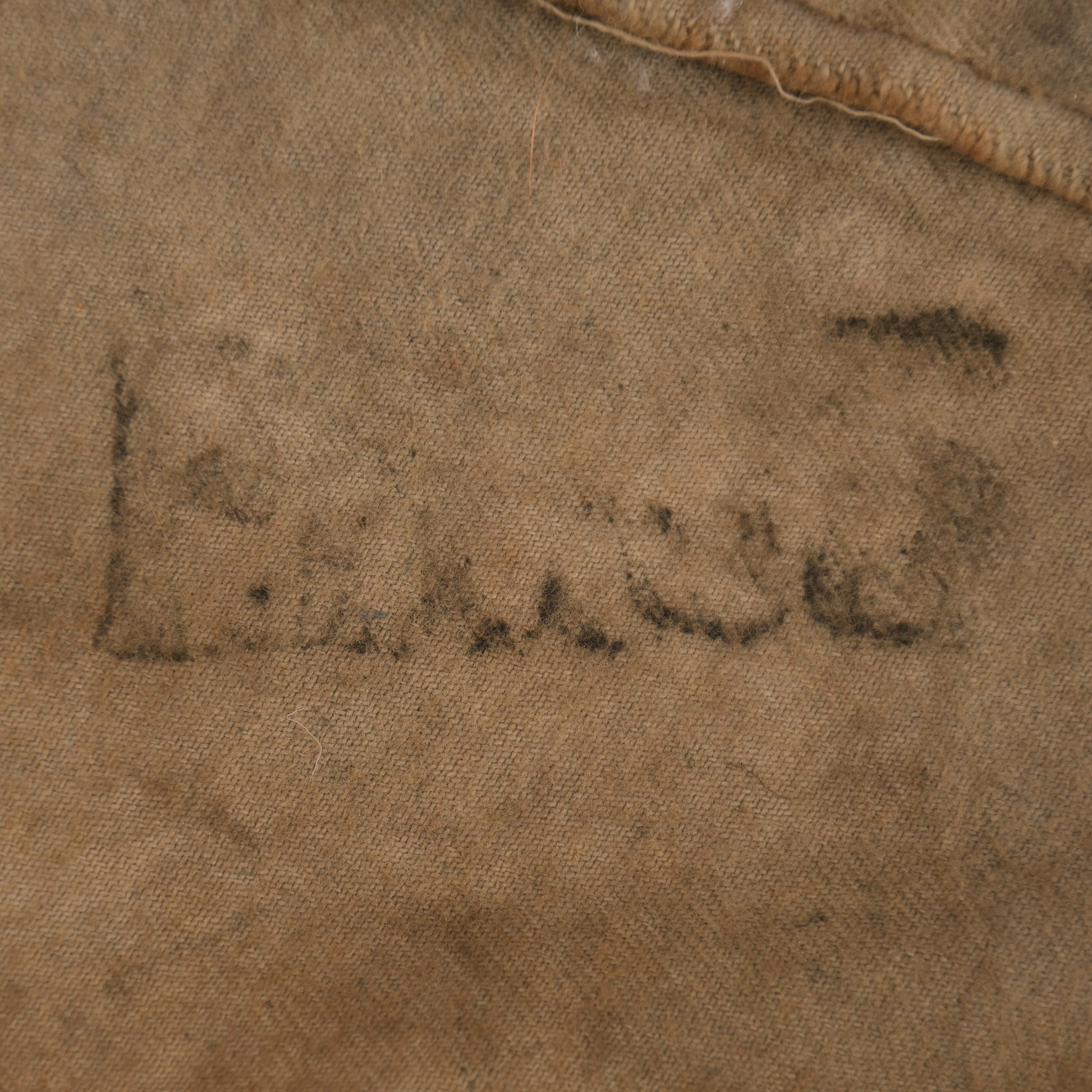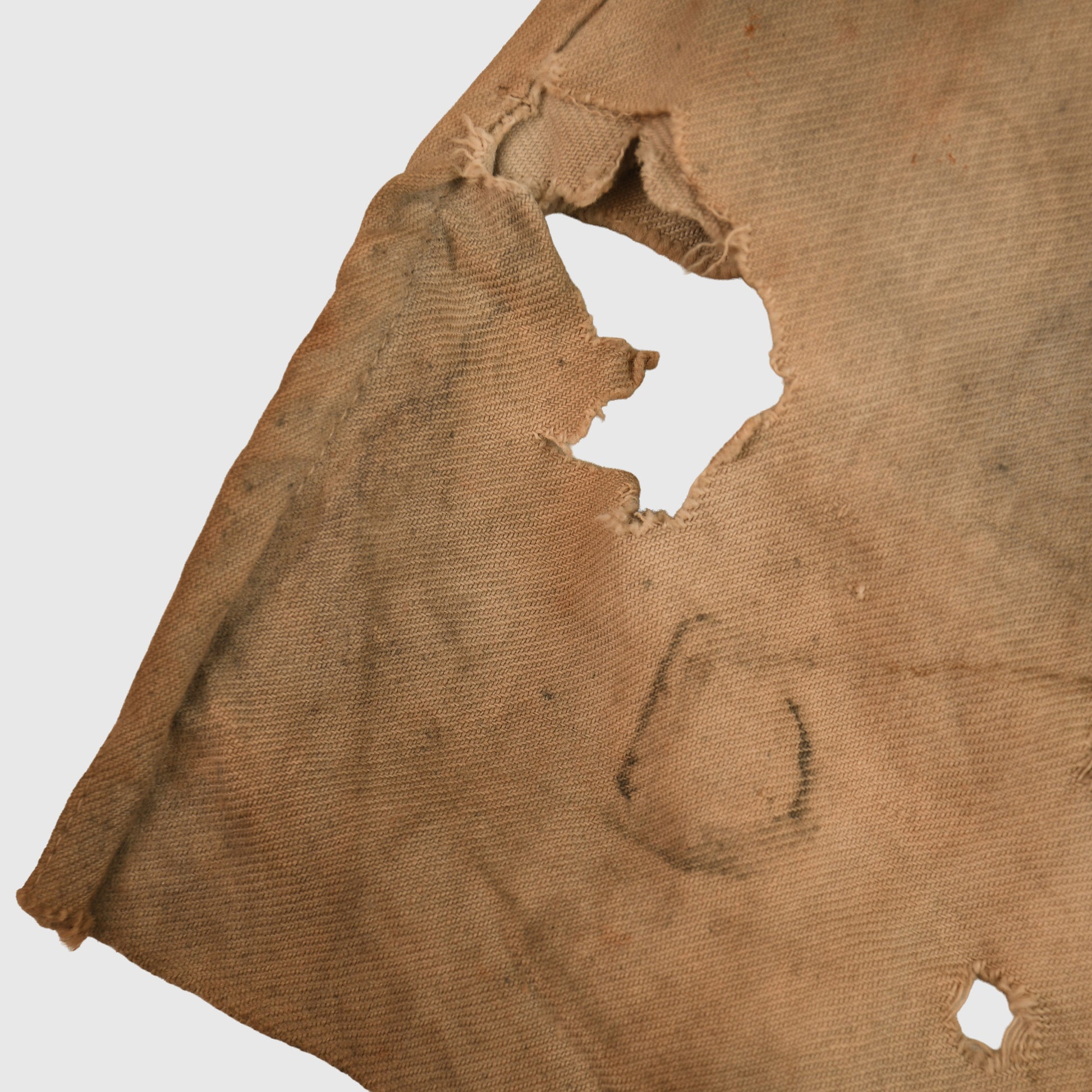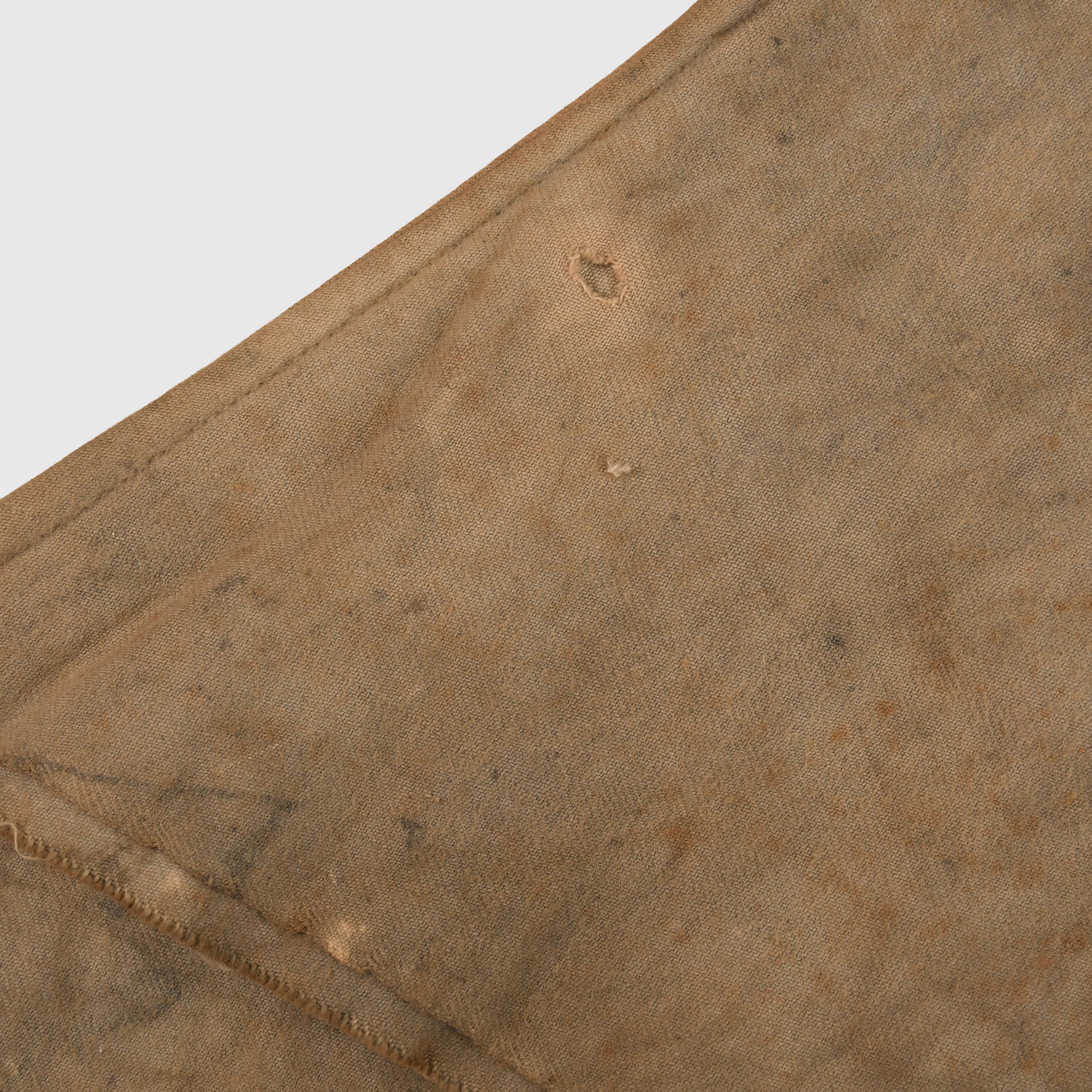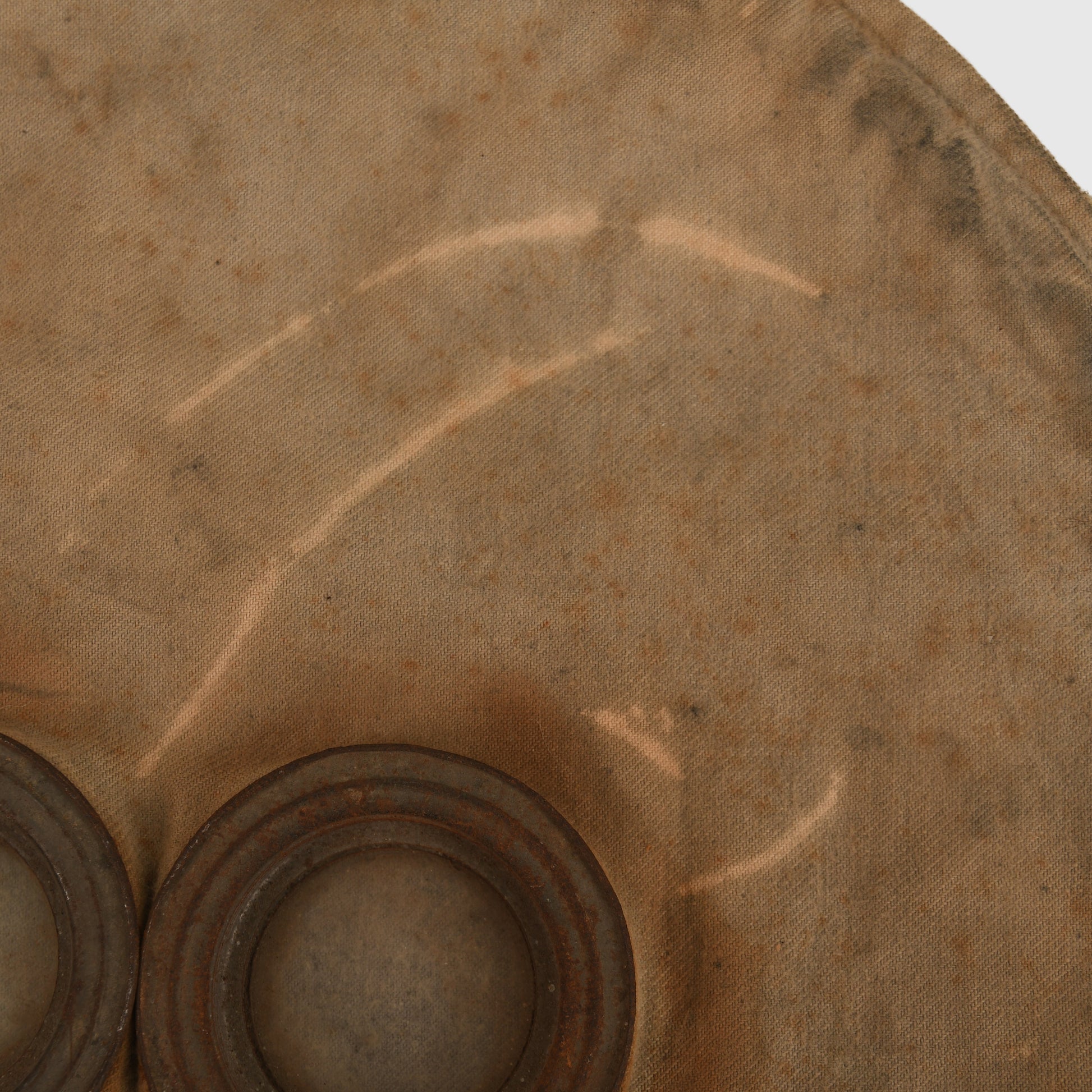 A good example of the ultra-rare gas hood known as the PH helmet. The P or PH helmet appeared in 1915, replacing the previous Hypo helmet. It has two glass eye pieces, which are both intact and unbroken. The exhale valve rubberised has solidified but is still intact and unbroken. Various staining can be seen in our web images. Two what appear to be rodent gnaws to the lower left-hand side. It has the unusual triangular form of stitching at the lower front, which is common to all PH helmets. Faint traces of stamp marking on the interior.