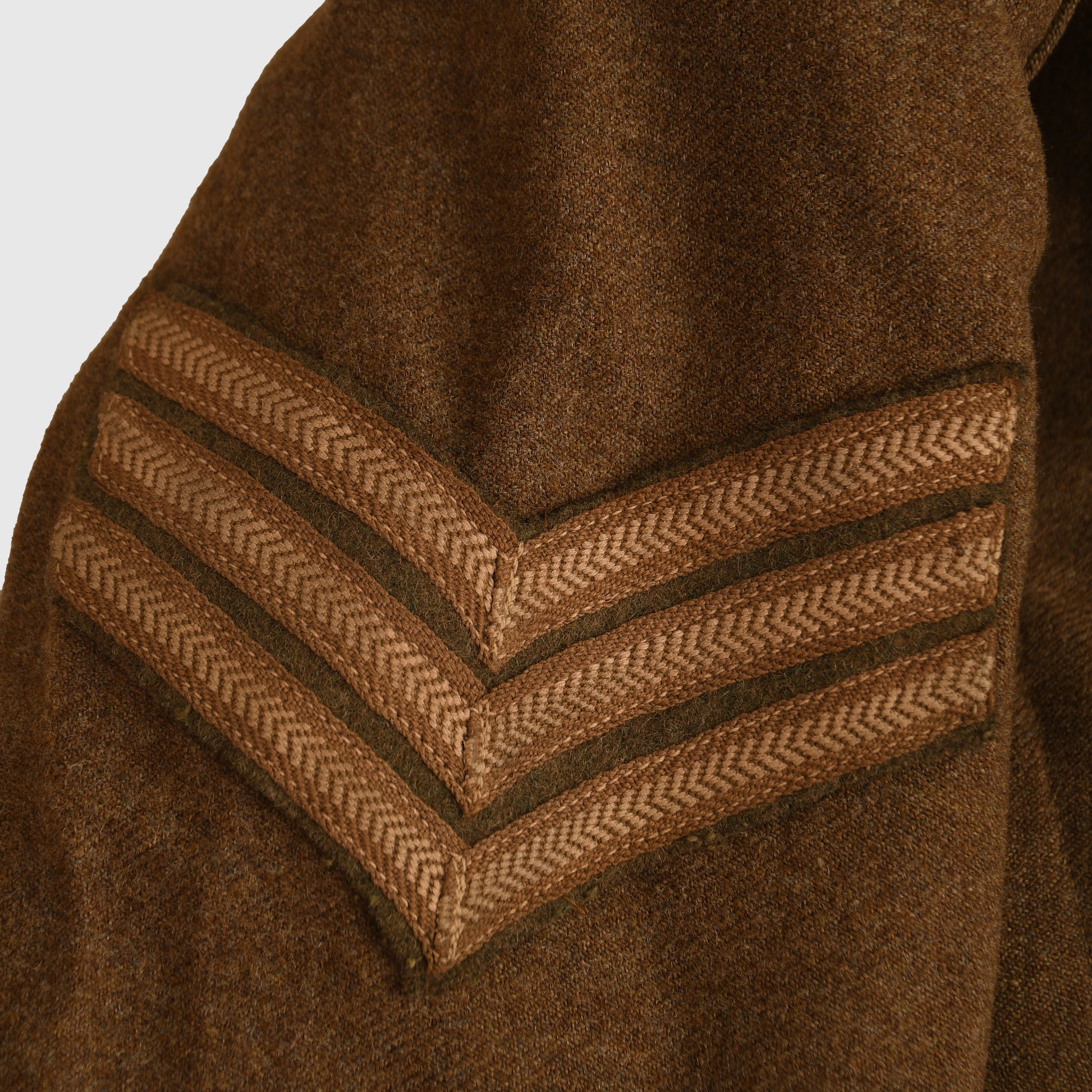 The tunic is in the standard configuration with epaulettes and two lower pockets with flaps. It is fitted with a very nice matching set of Royal Flying Corps shoulder titles, observer wings, and sergeant stripes.