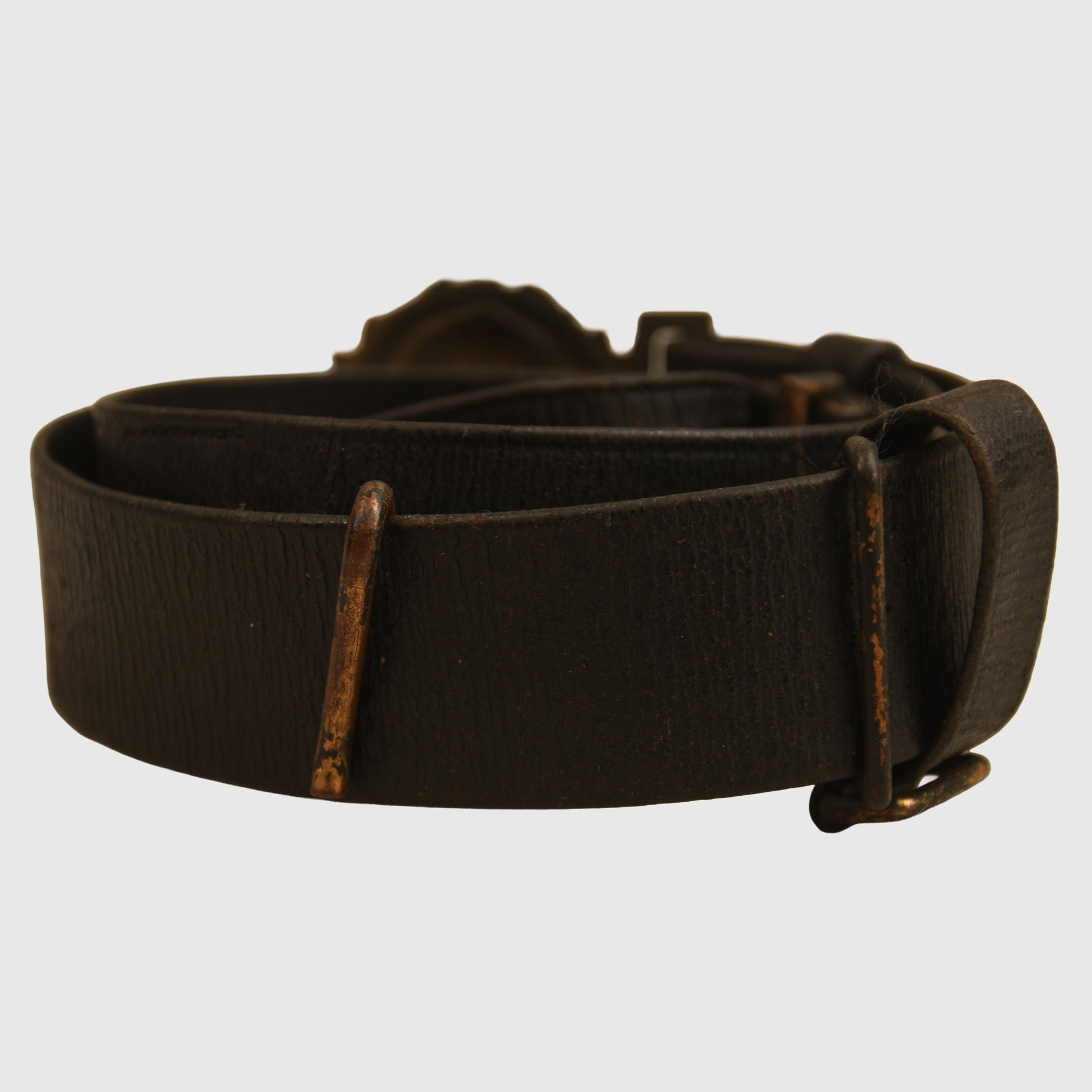 In all of our years of handling militaria, we have only ever had two Royal Naval Air Service officers' swords; we have never had the suspension belt, either service or dress. This is the black leather service waist belt, complete with the Royal Naval Air Service brass buckle, crown over flying eagle with one single runner, a belt loop and a sword hanger. A very rare accessory for the Royal Naval Air Service sword.