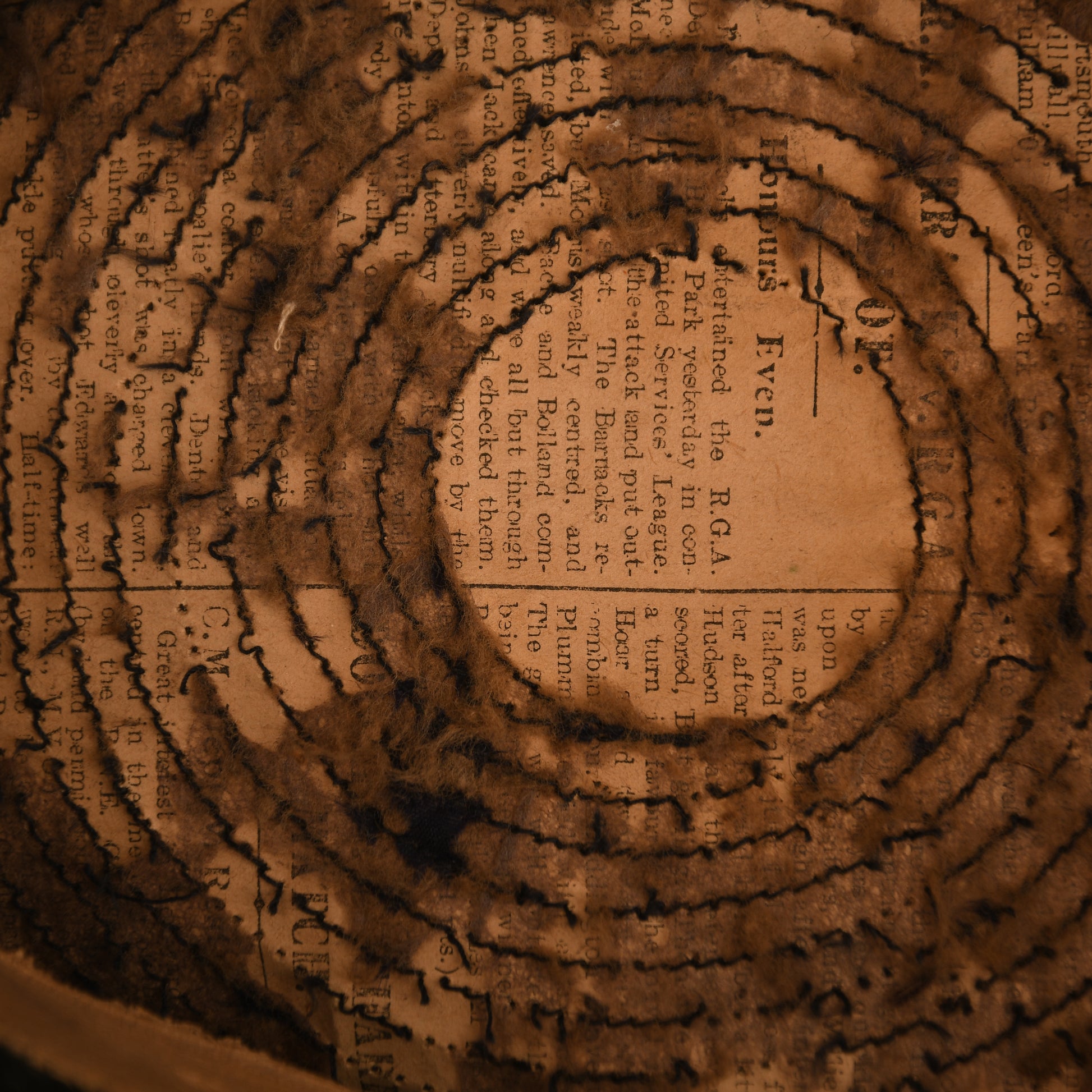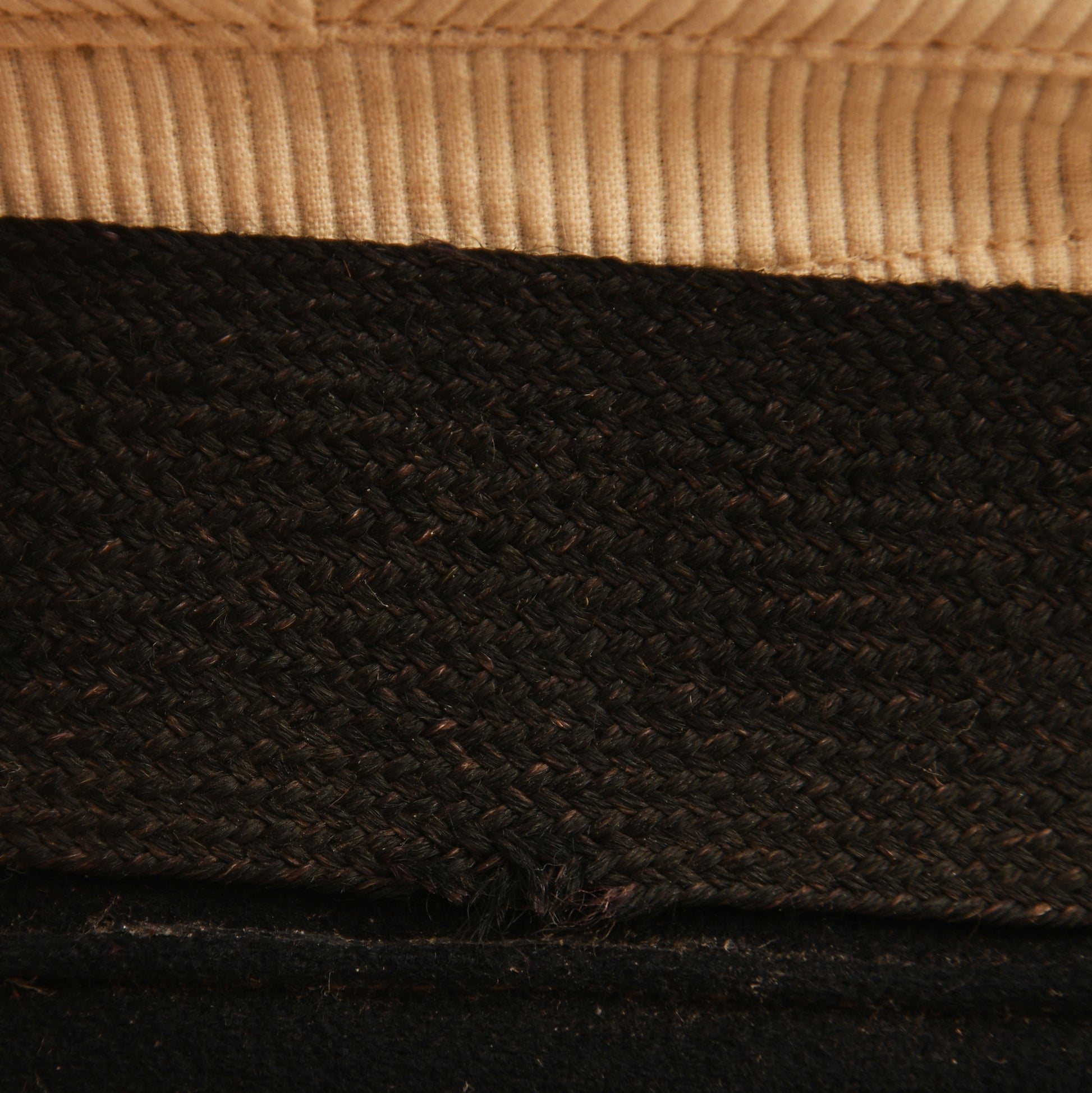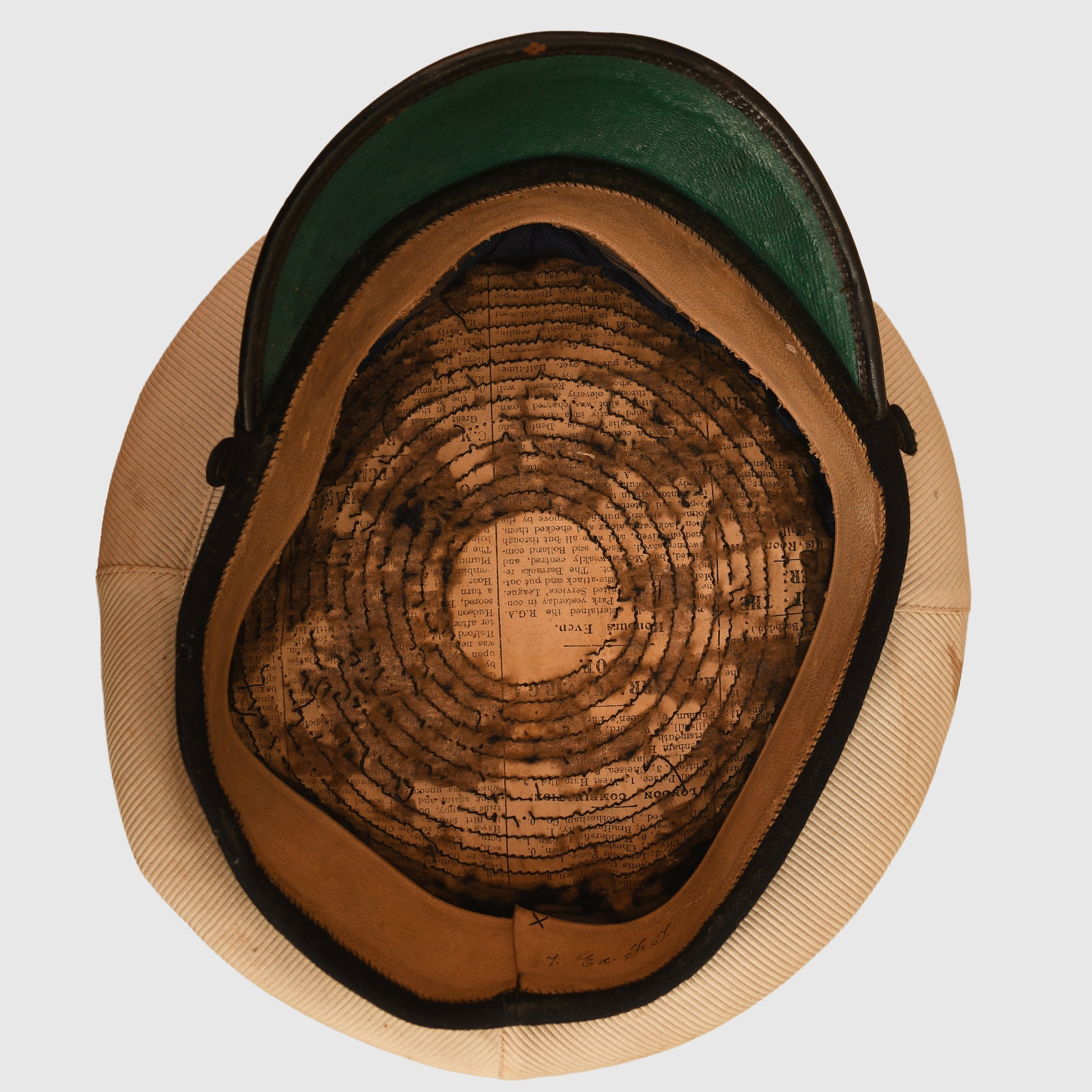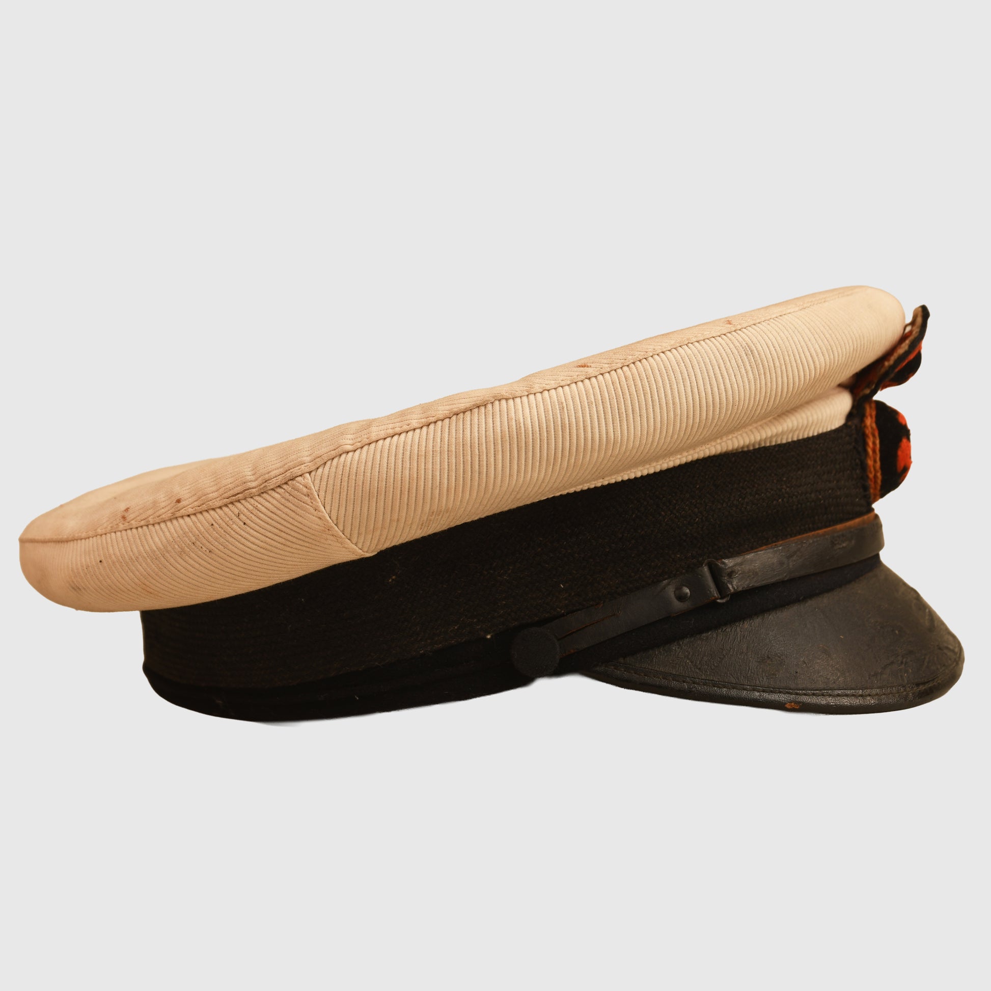 A very nice white top naval visor cap with a blue body and removable ribbed white top. The cap shows minor rust staining and slight discoloration but is overall in excellent condition. Fitted with a Chief Petty Officer red-on-black crown-over-anchor badge and a standard WWI period small chinstrap. Officer quality, with a white leather sweatband featuring the owner’s initials to the interior. The upper inner crown silk is worn but reveals fine circular stitching. Notably, newspaper was originally used as padding between the exterior blue and interior silk. Royal Naval caps from WWI are scarce. Approximate size 56–57.