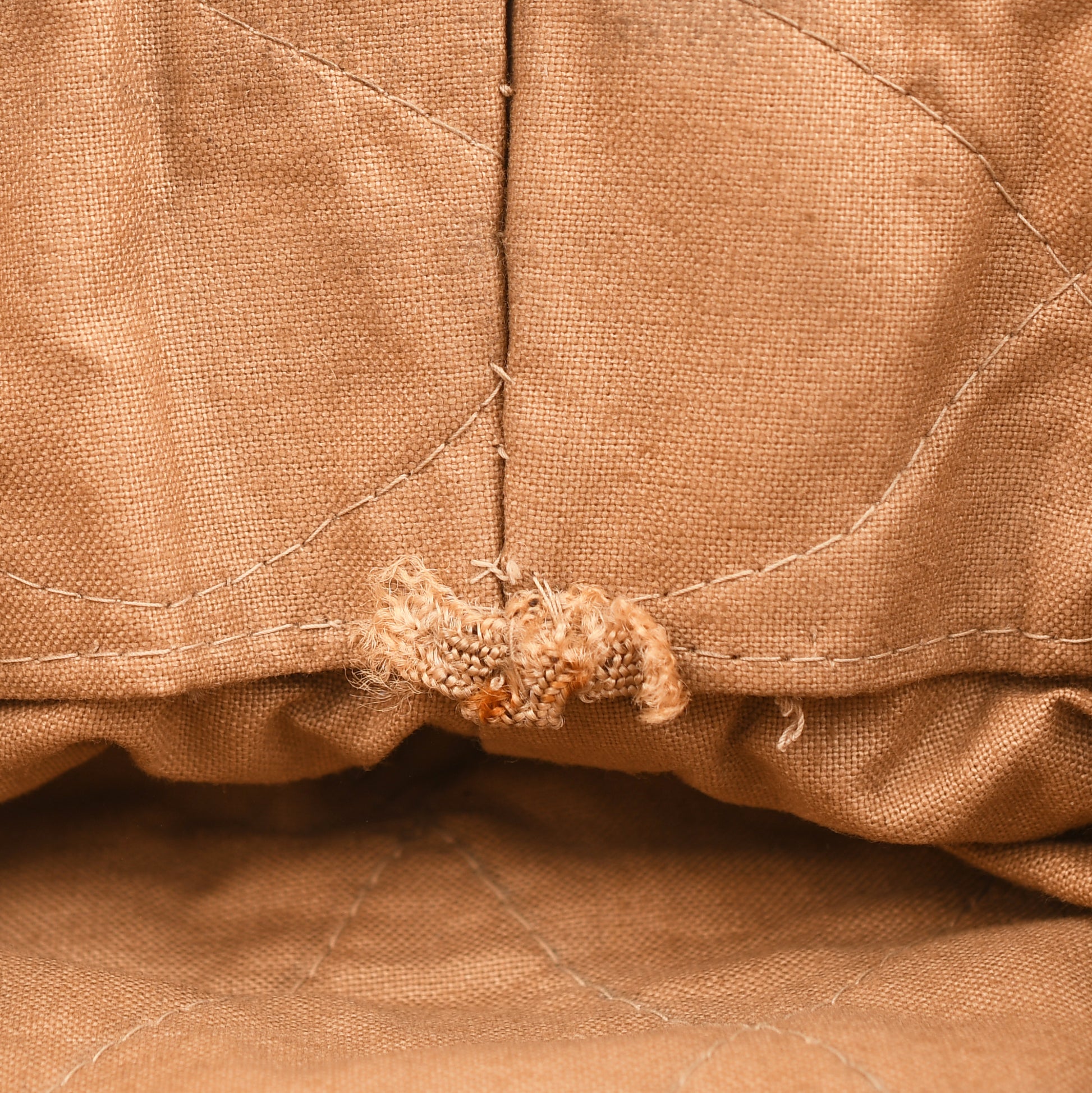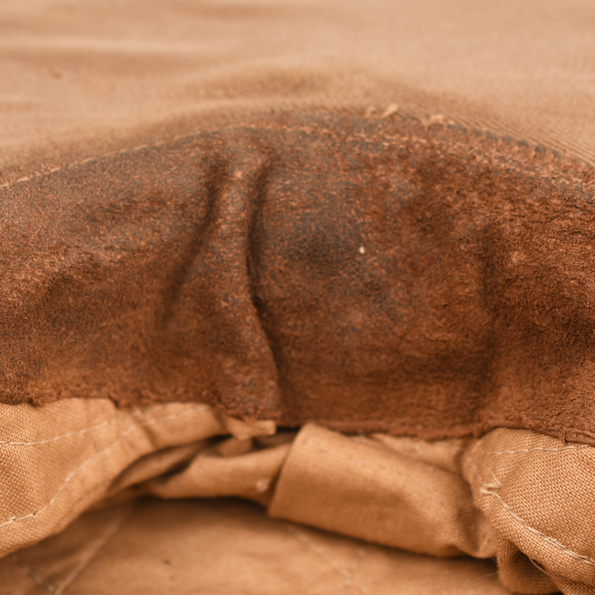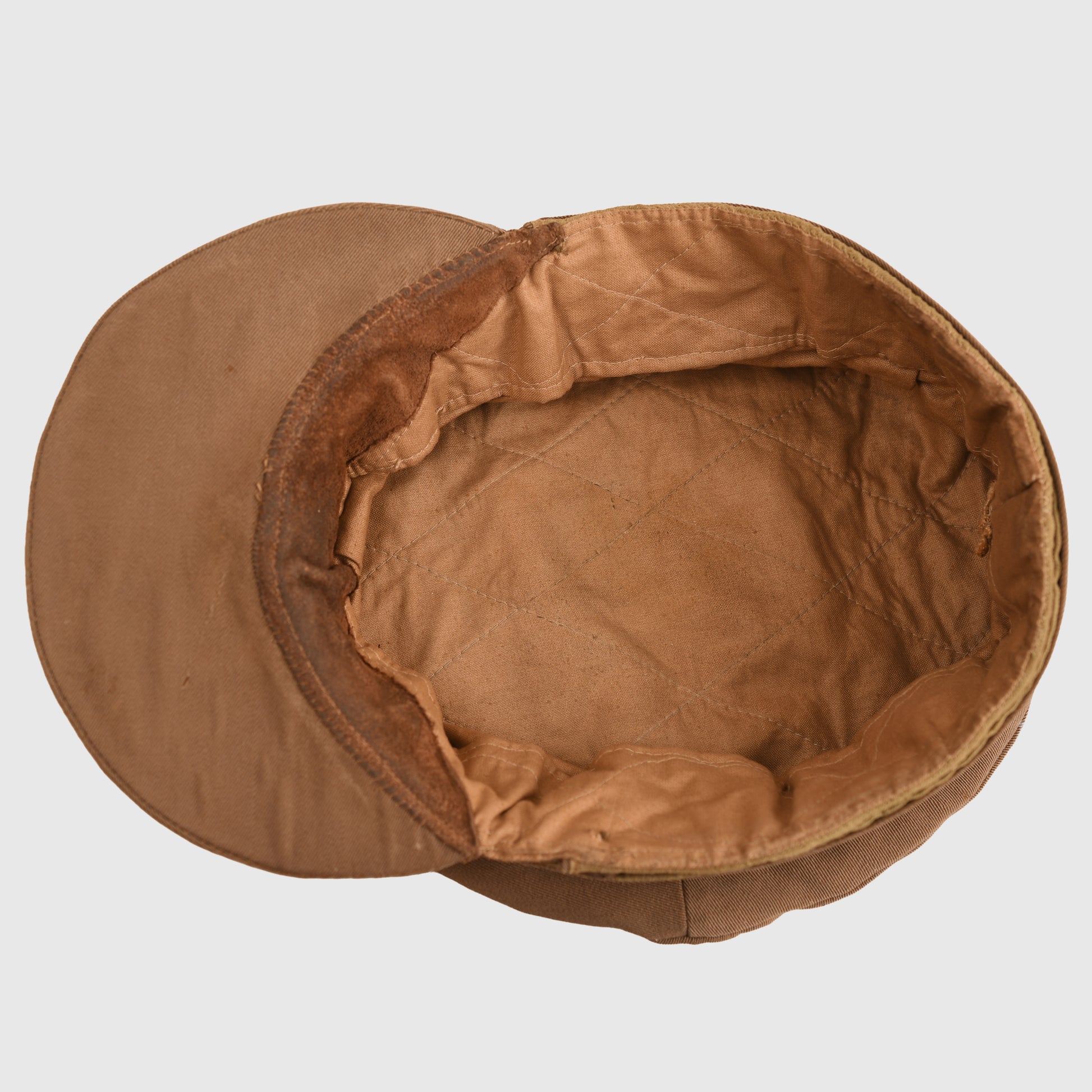 A very rare Gor Blimey style officer’s trench cap with pull-down side curtains, constructed in lightweight gabardine similar to tropical tunics produced by First World War tailors. Fitted with the correct chinstrap, leather football-style side strap buttons, and a Royal Northumberland Fusiliers officer’s bronze badge. The leather sweatband is stitched in a half-moon pattern along the forehead, with the remainder of the interior liner in lightweight linen featuring the typical lozenge-style stitching of the period.