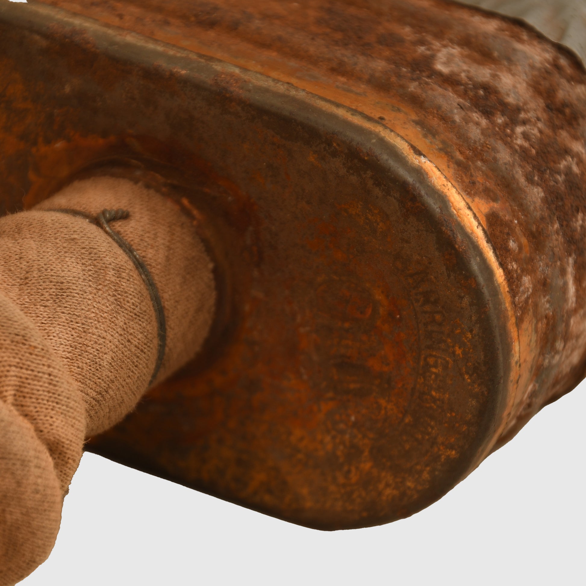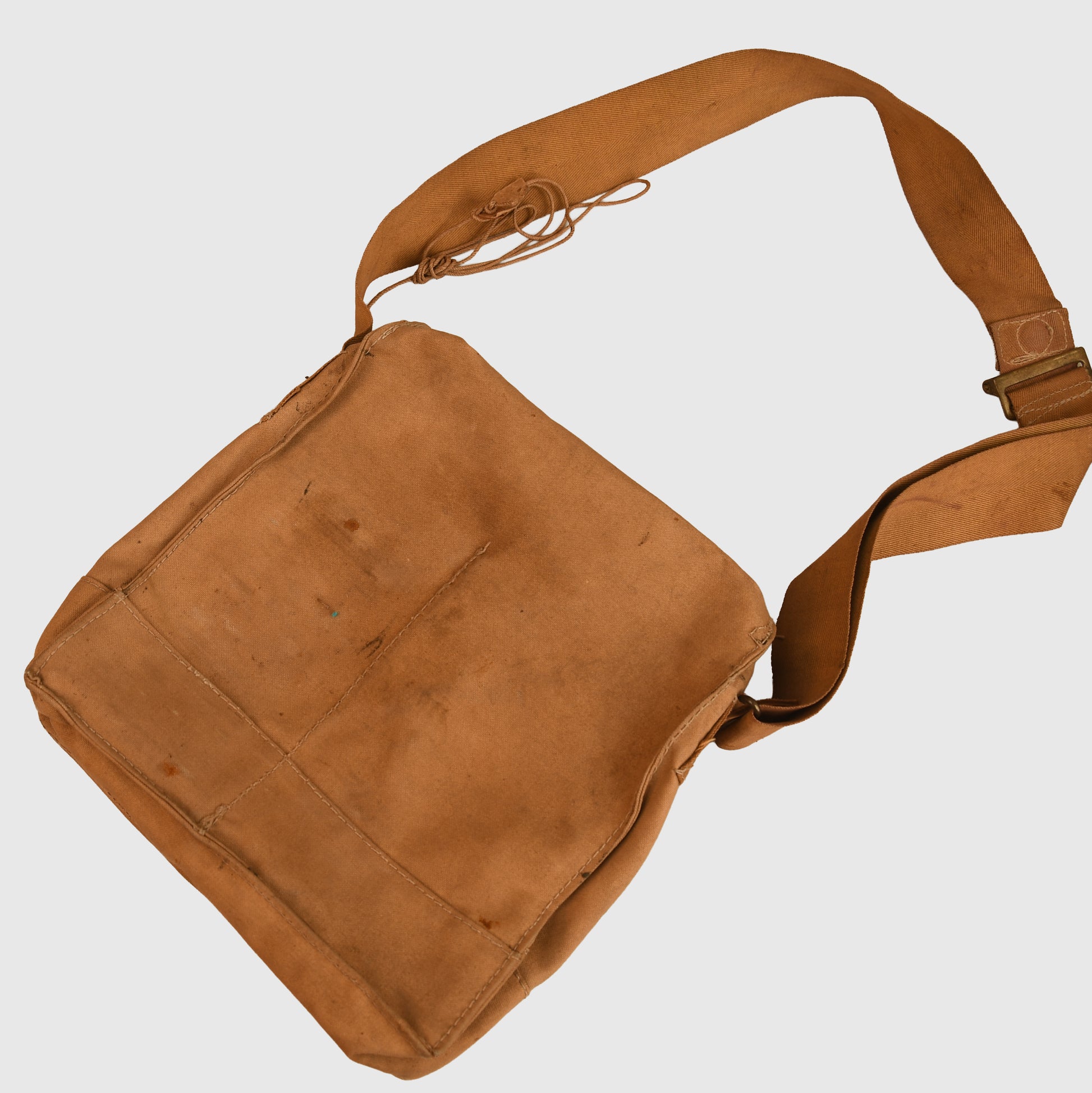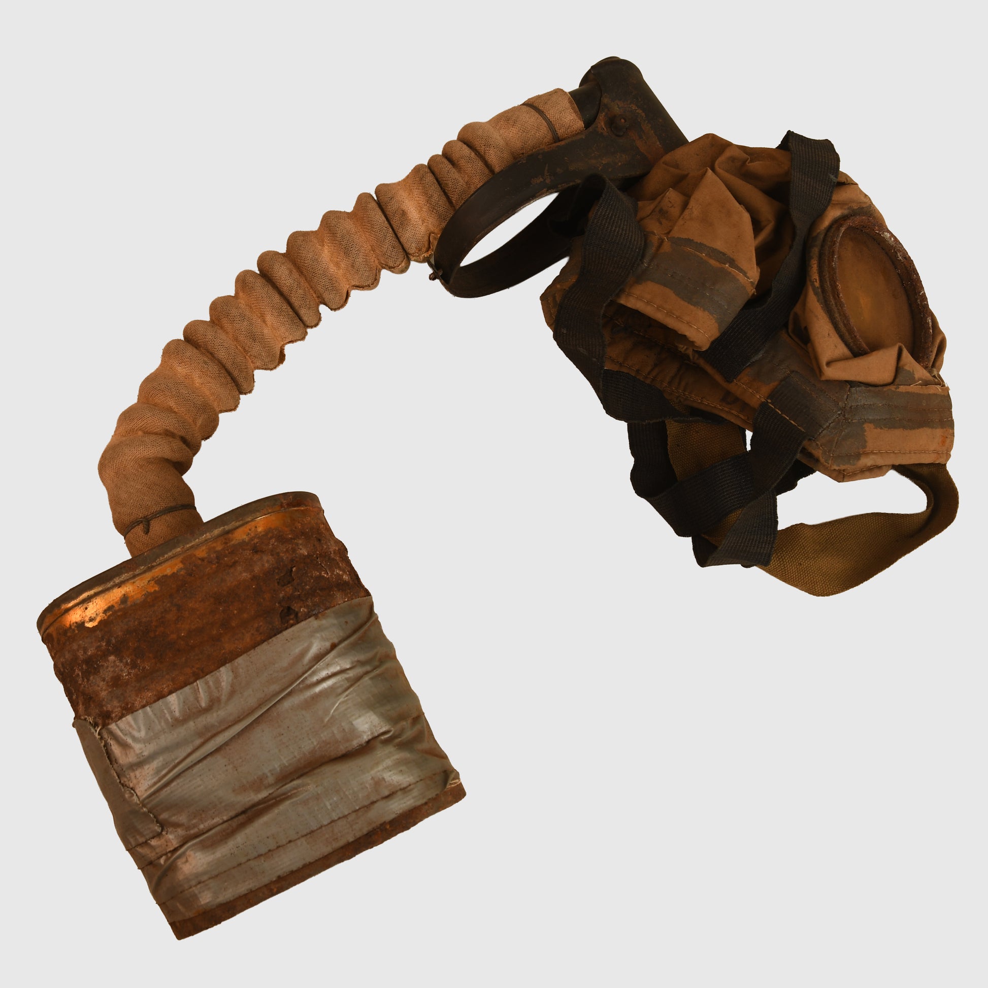 A good example of the standard issue British WWI small box respirator. The facemask remains in sound condition with unbroken lenses and all original head straps present. The front of the mask is marked ‘K2’ and retains its original respirator tube and filter box. As commonly seen, the filter box has suffered from rust deterioration, with the base now reinforced with duct tape for stability. The exterior carrying bag is excellent, complete with its full-length shoulder strap. Clearly maker marked ‘Waring & Gillows 1917’ to the inner closure flap, with a faintly stamped large number ‘2’ and broad arrow over ‘50’ to the exterior flap. An original owner’s name has been hand-applied to the front of the bag.