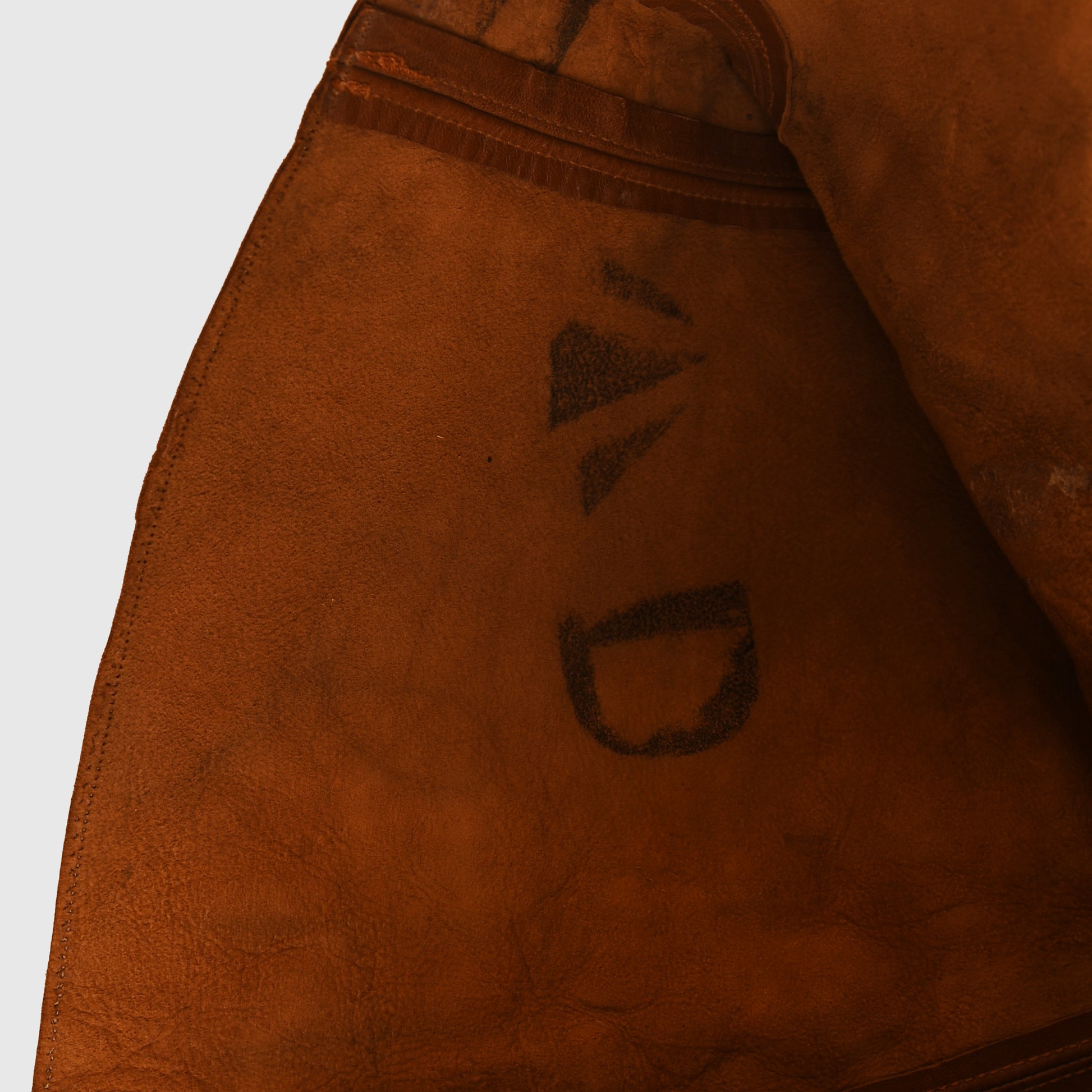 While the helmet is generally good and strong, exhibiting excellent potential for display, there are some signs of age and wear. Specifically, the stitching is slightly loose on the forehead area and there is some roughness along the back seam. Overall, it is a scarce surviving component of a critically important WWI flying helmet.