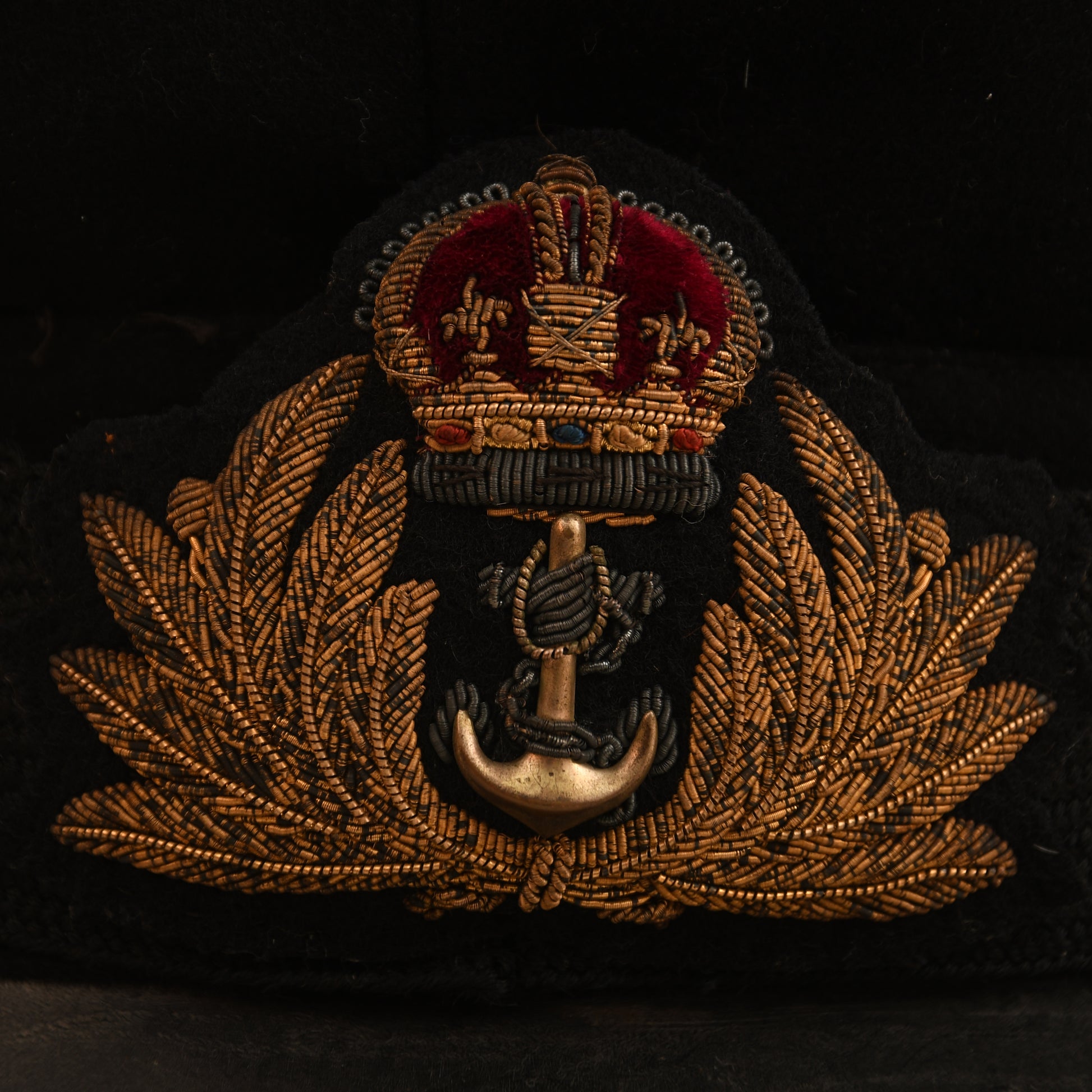 A wonderful and personal Royal Naval Air Service grouping from WWII, centred around a beautifully preserved naval cap featuring a superb bullion, metal, and velvet cap badge. The cap retains its WWI-style narrow chinstrap, shows no moth damage, and is approximately size 56. The interior displays a well-preserved tan lining with excellent colour and the classic multi-stitched crown typical of WWI construction. The maker’s details, from Luton, Bedfordshire, are gilt-blocked beneath a King’s Crown.
