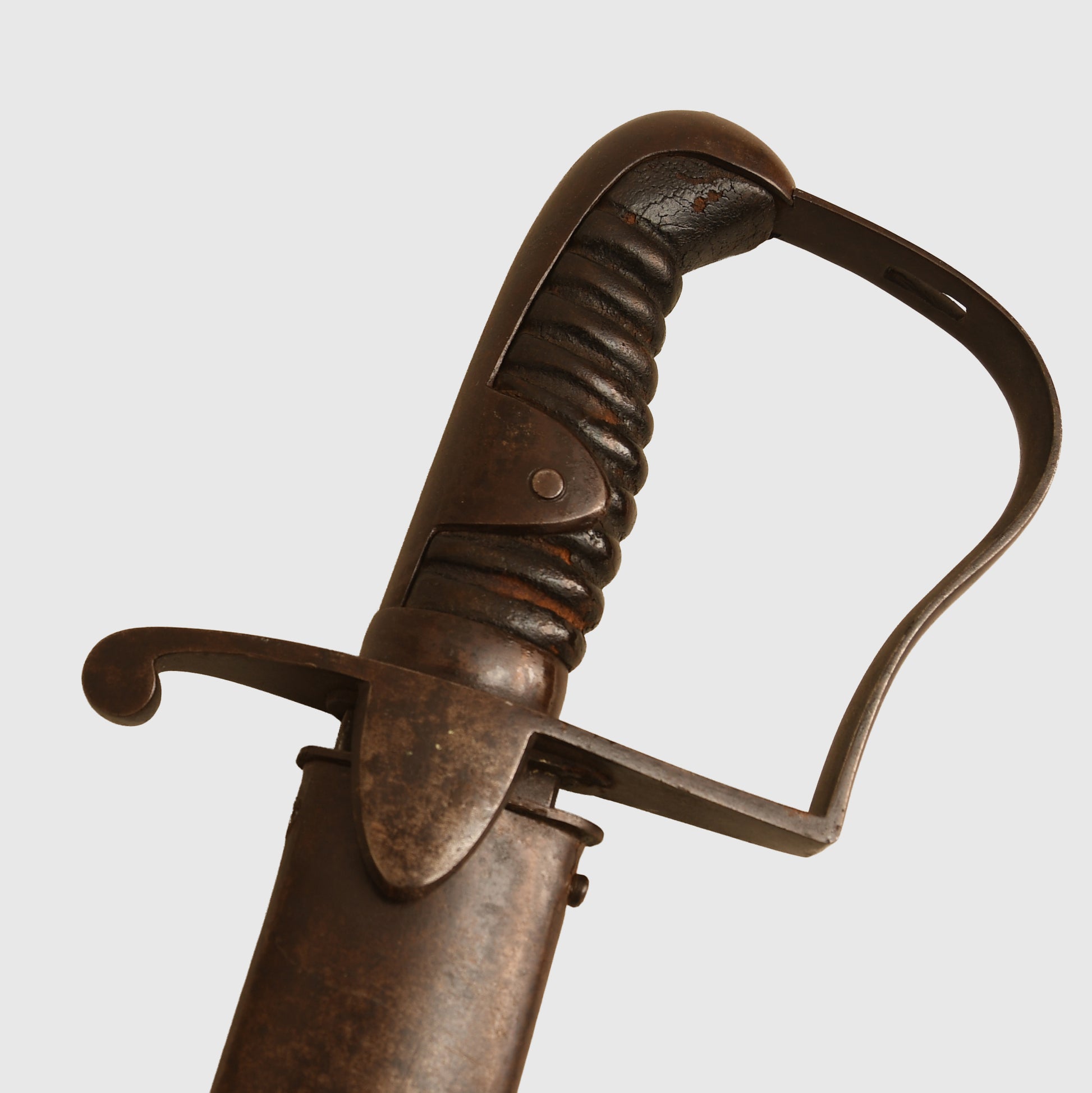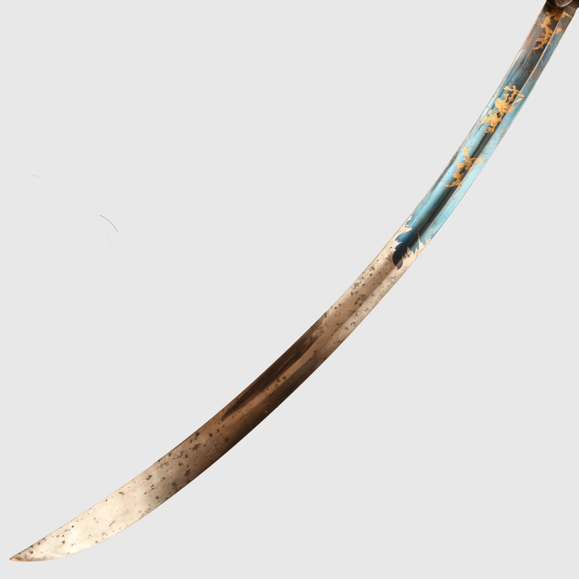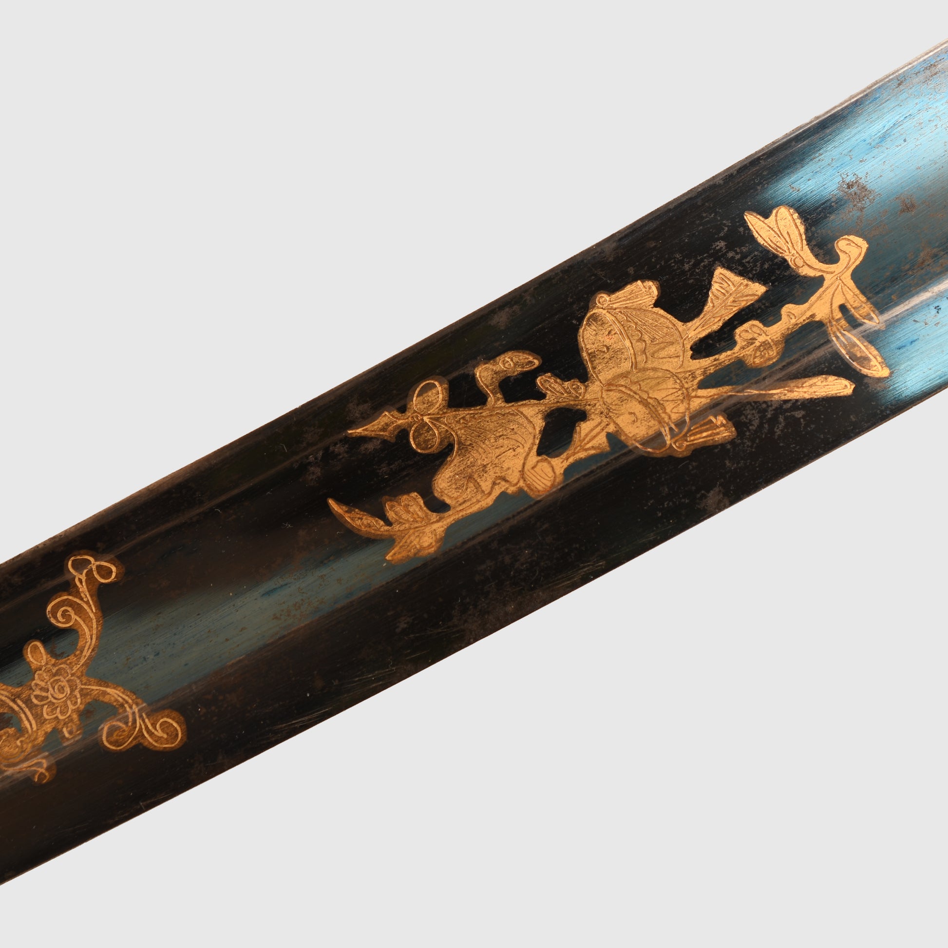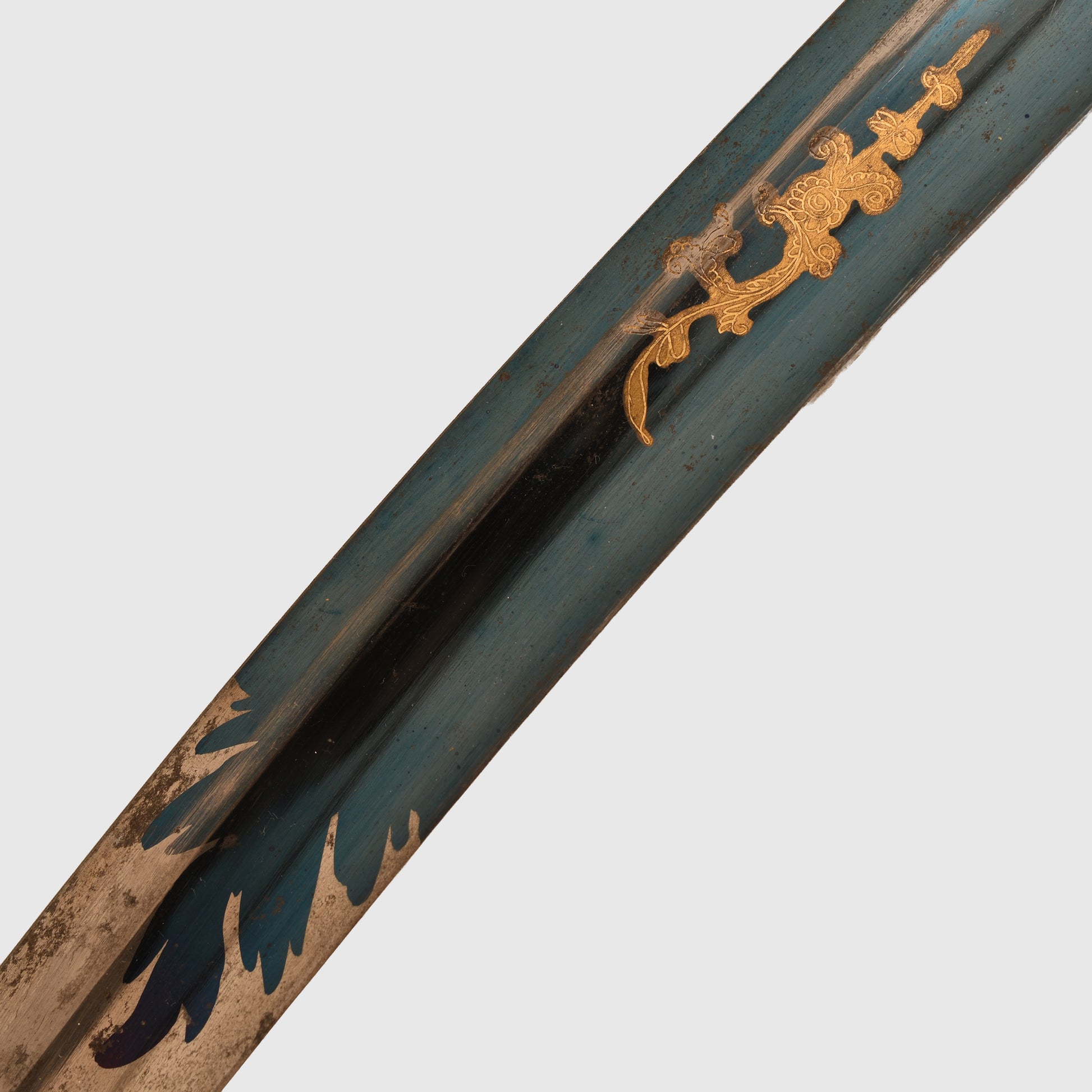 A superb late 18th-century officer’s example featuring an 83.5 cm blade exquisitely decorated on the upper half with blued and gilt scrollwork and stands of arms. The blueing remains vibrant, with only light fading near the standard 1796 steel hilt. The grip is fully intact and well preserved.