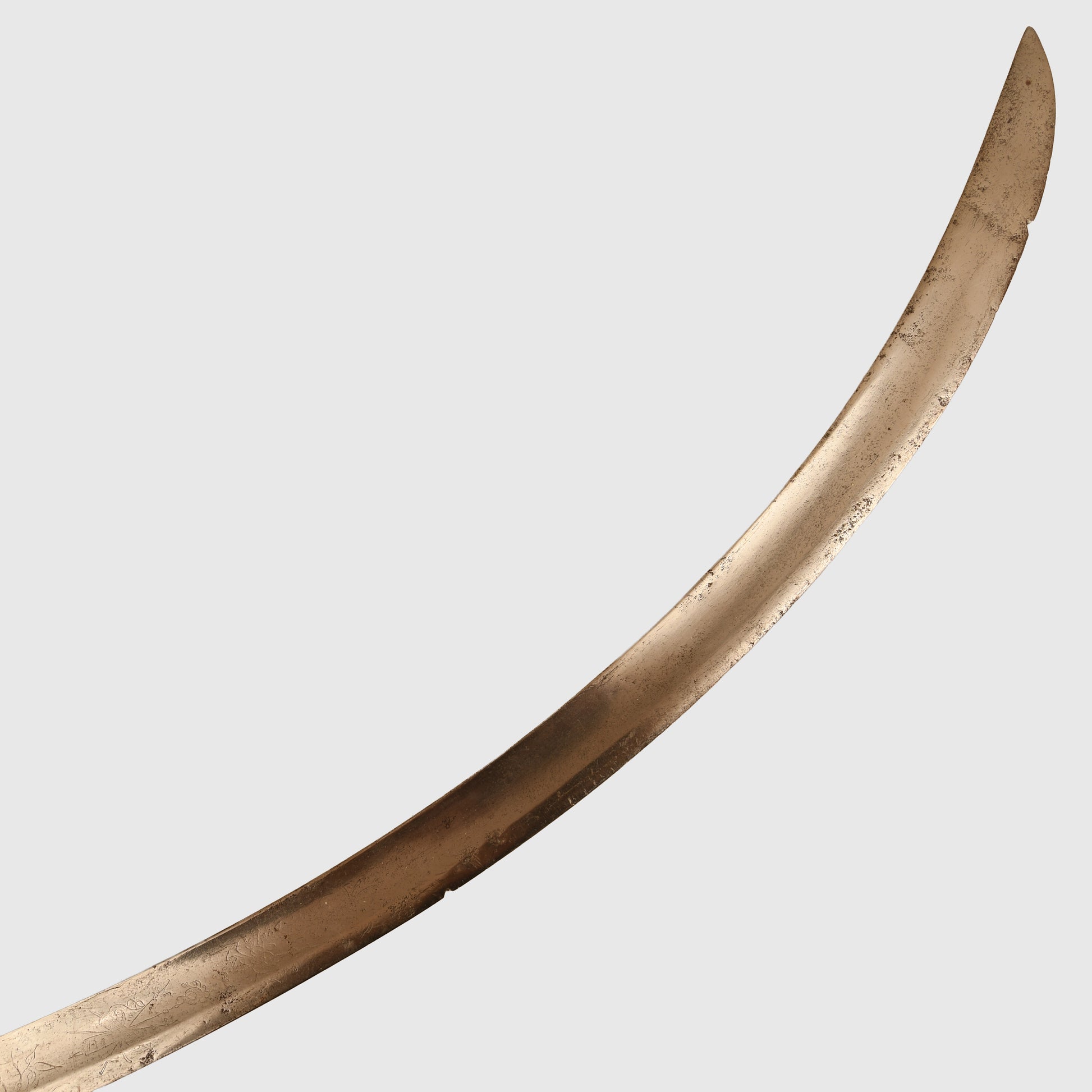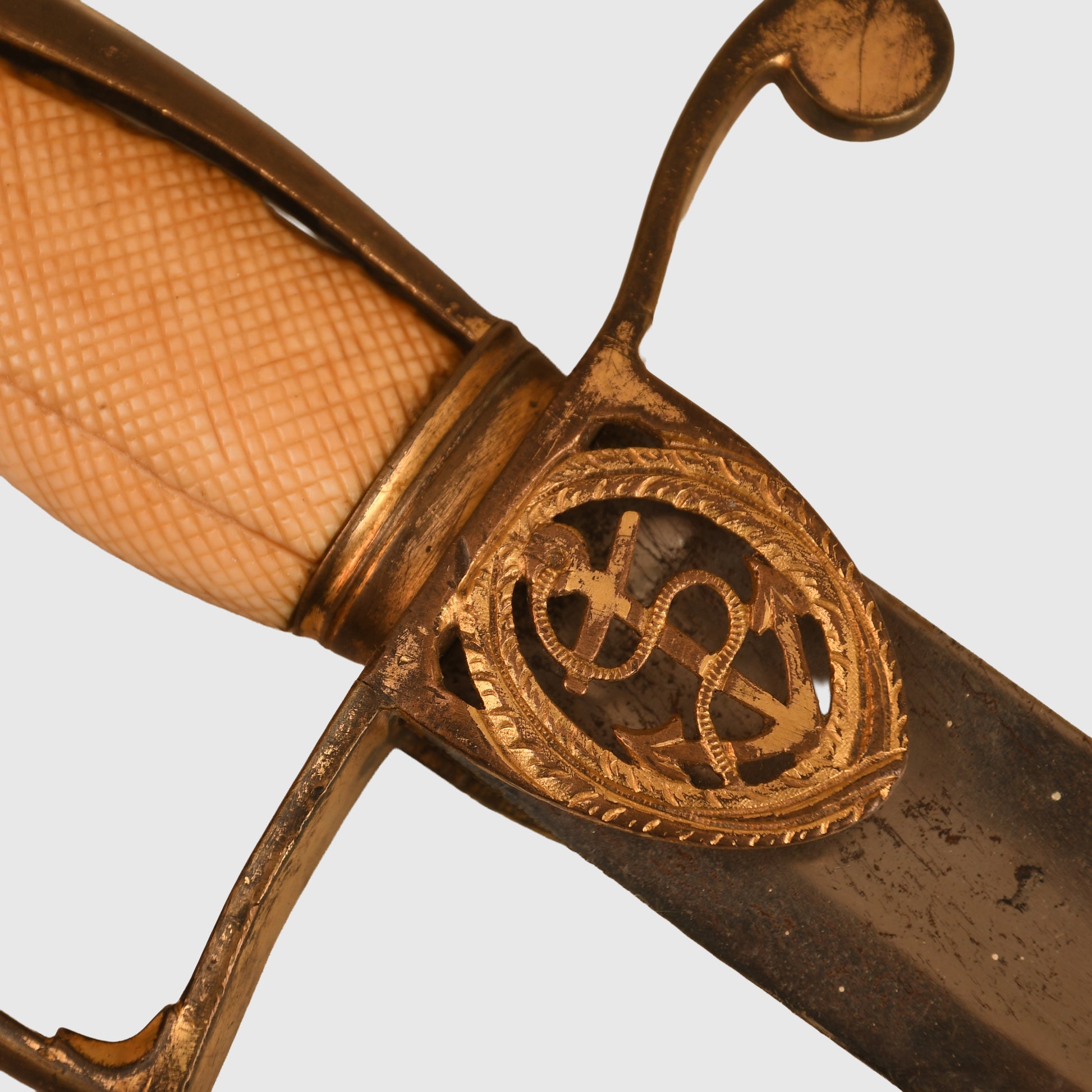 A fine Georgian naval officers display piece, offered without scabbard. The surface shows faint traces of original etching, with a lion’s head D-guard hilt featuring fretted anchor langets on both sides. The ivory grip is intact, with one small chip and two minor cracks.