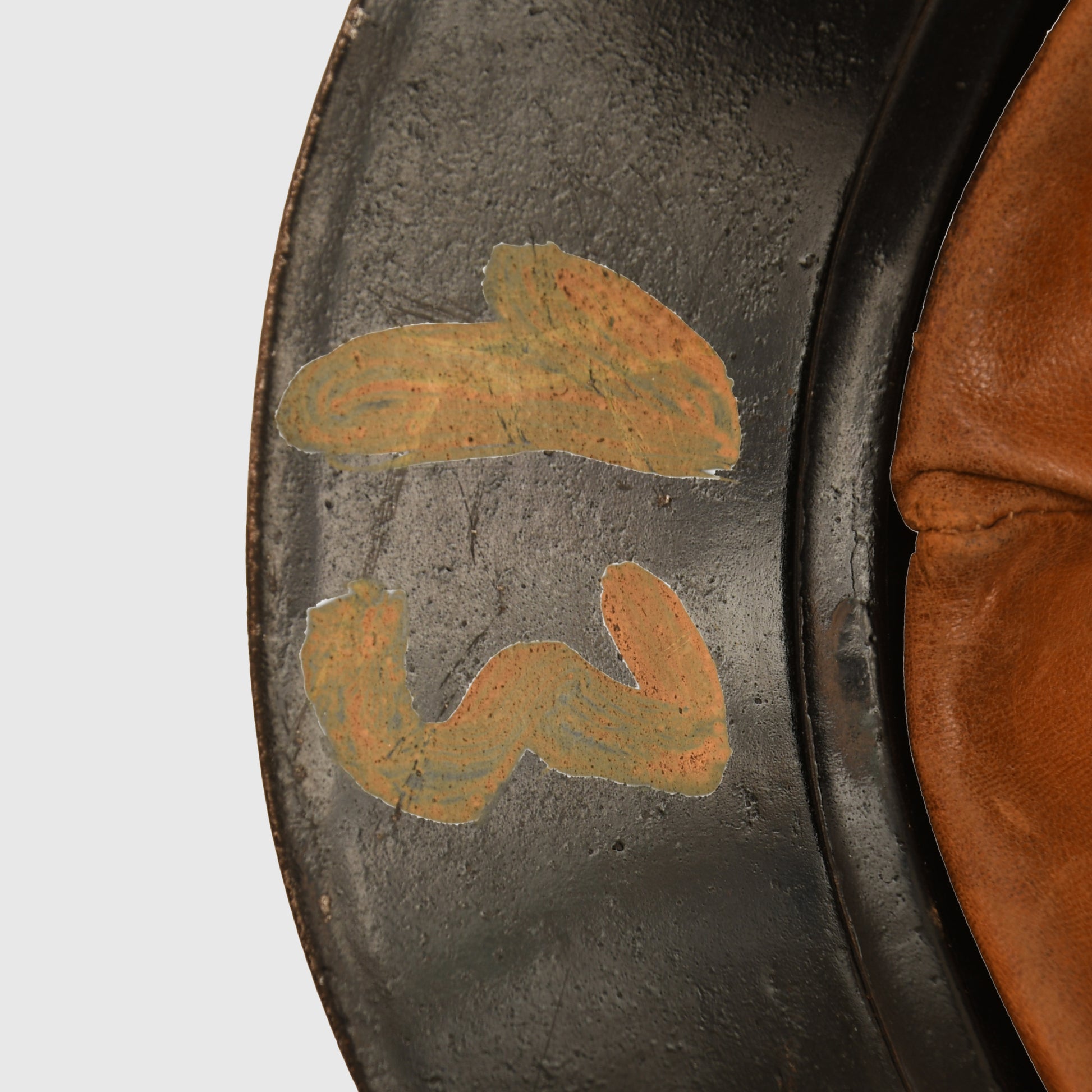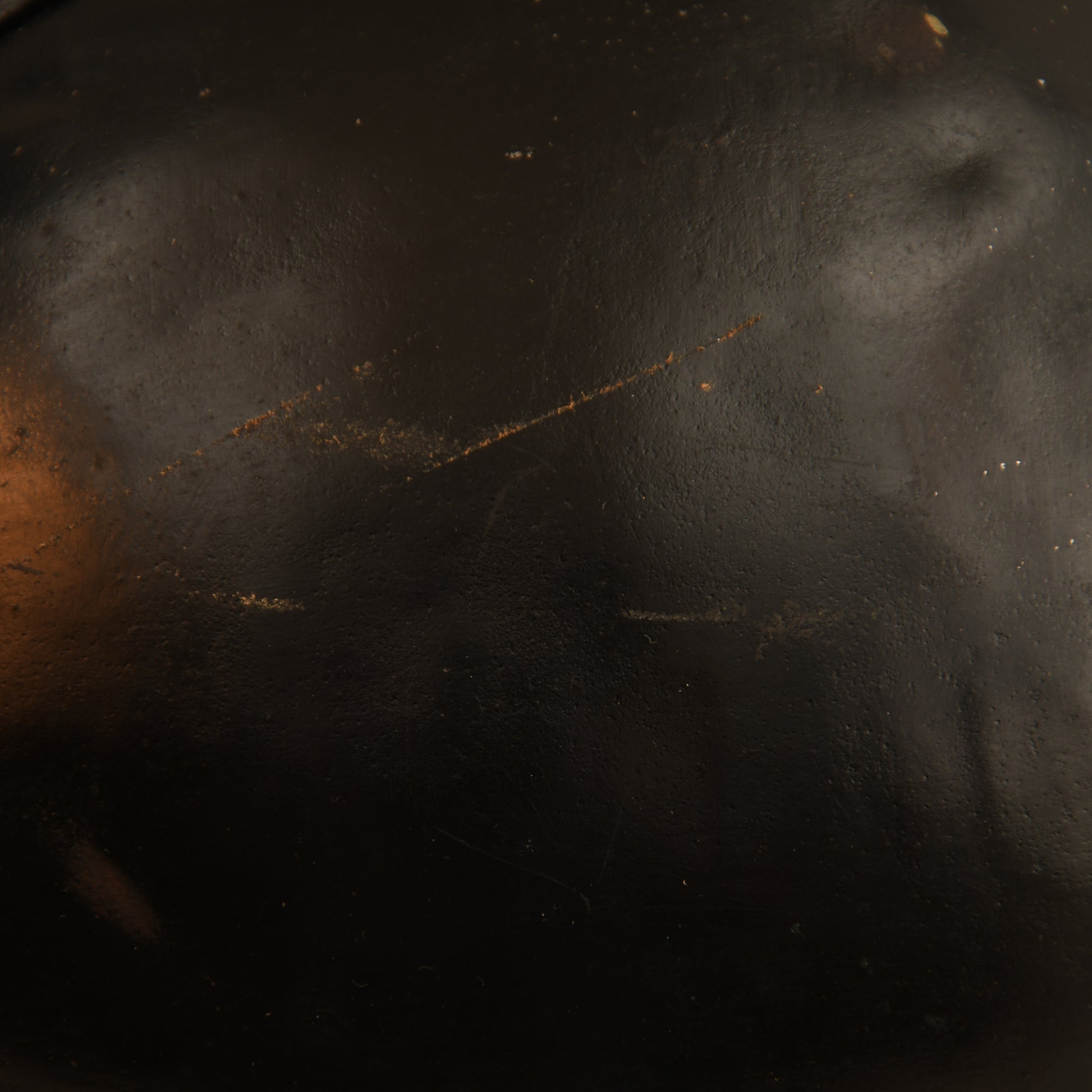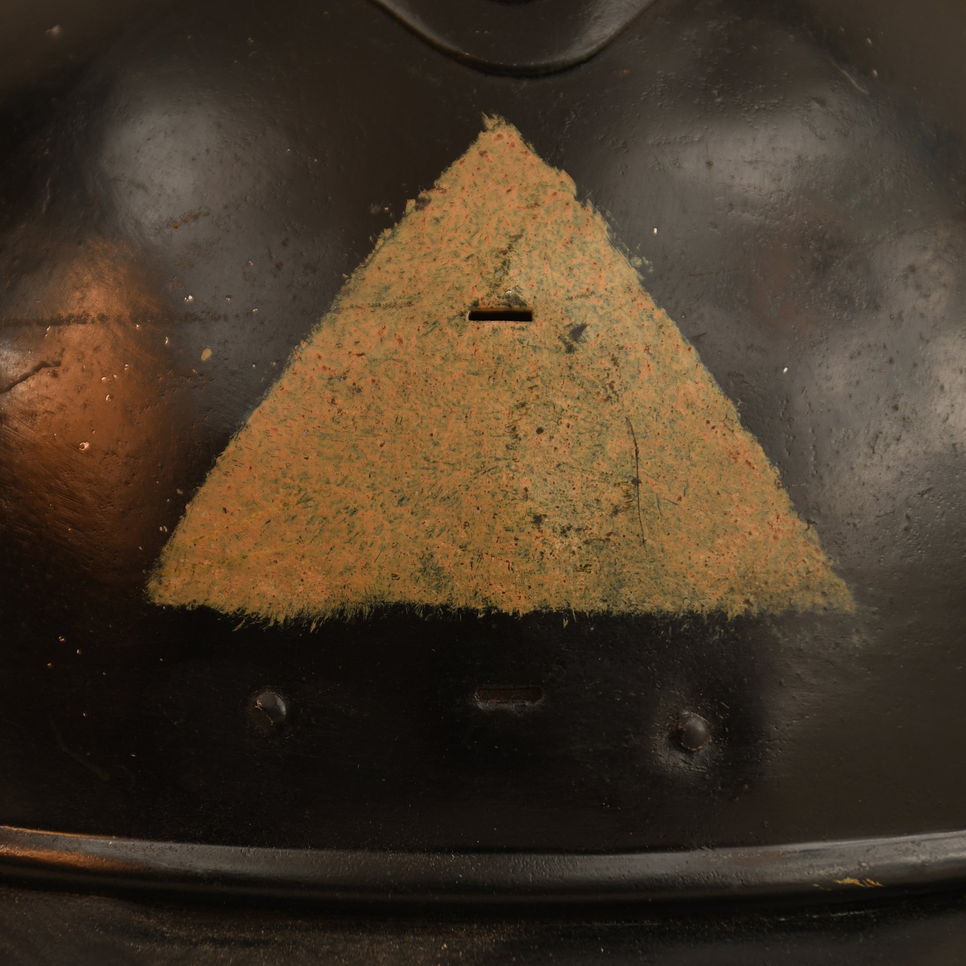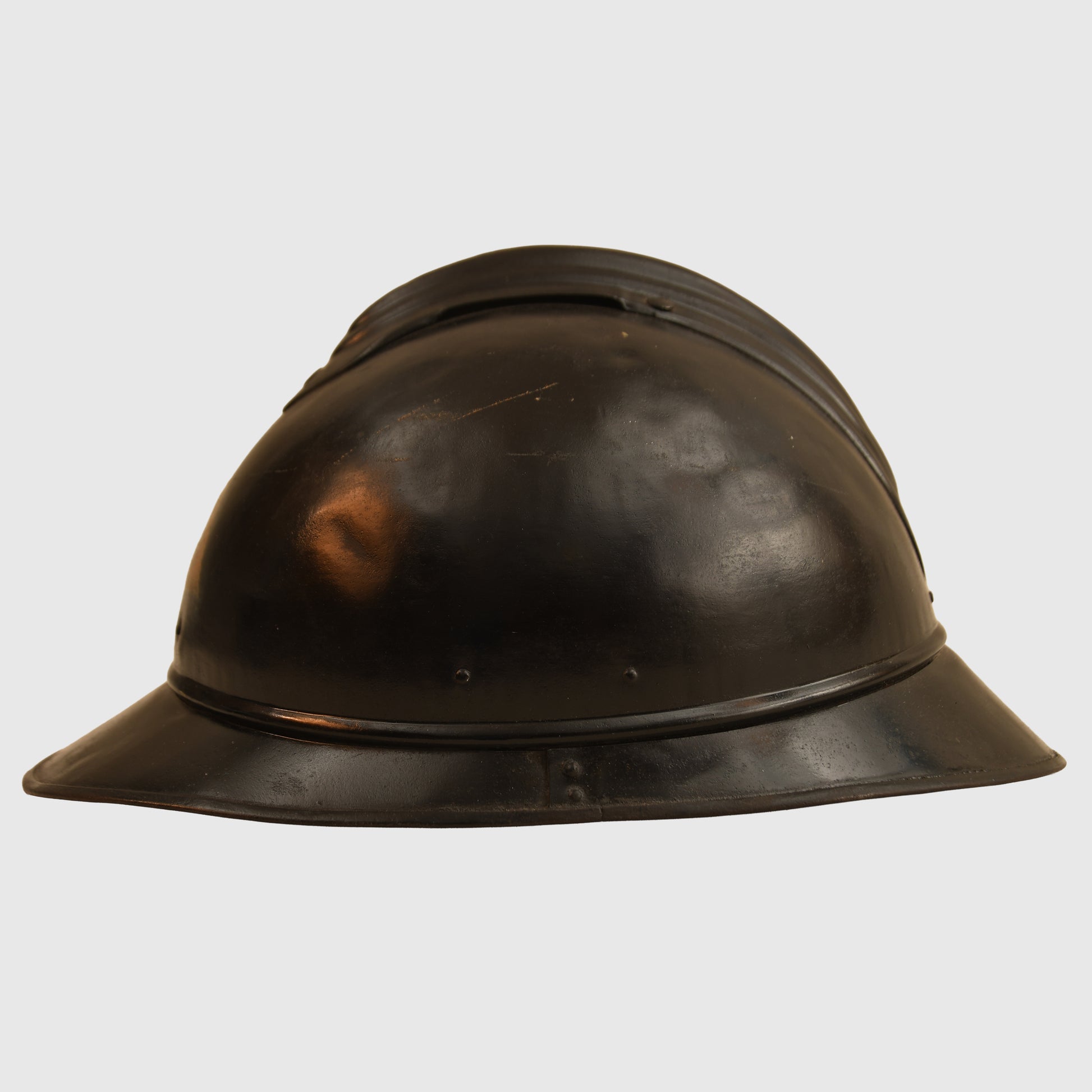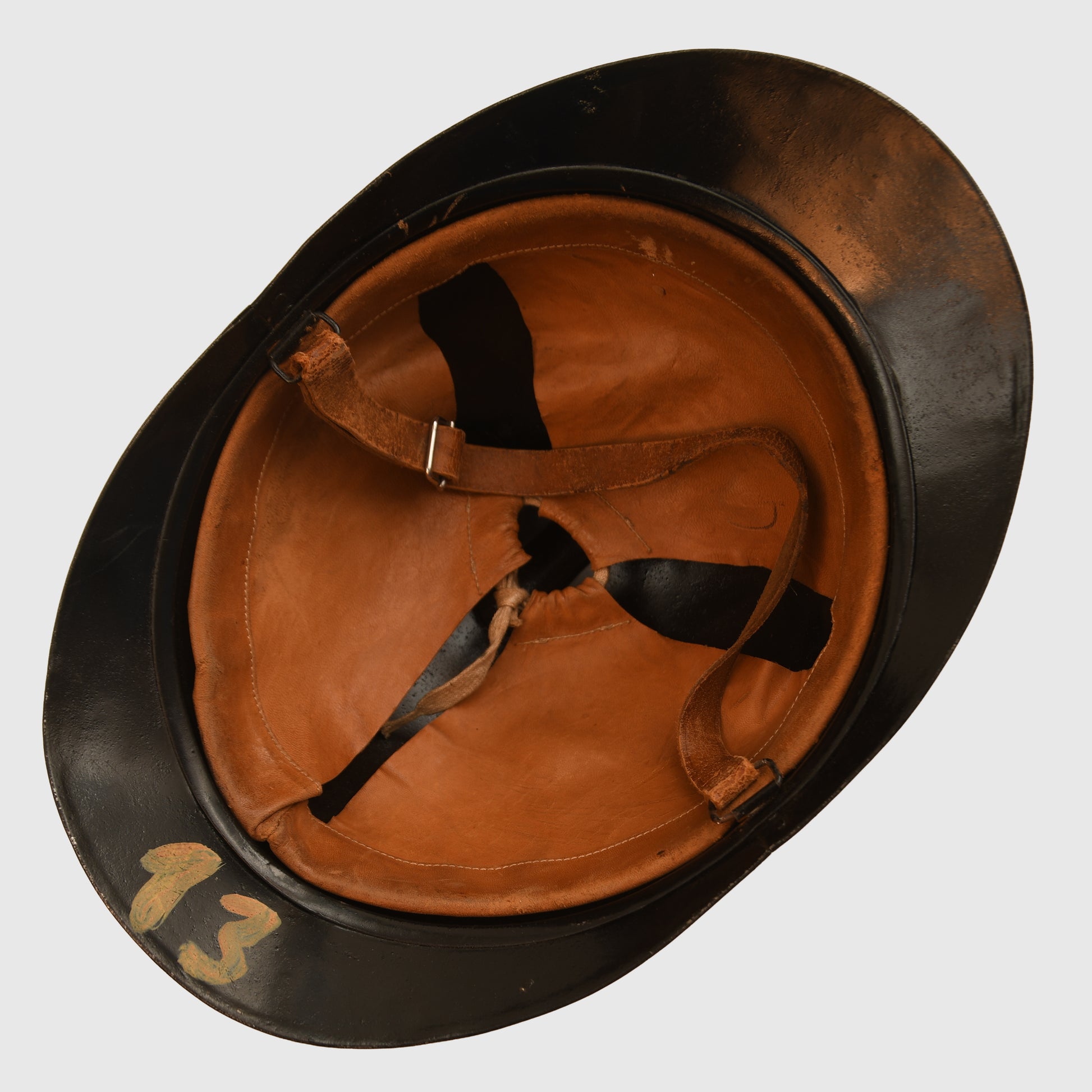 A well-preserved example of a French First World War Adrian pattern helmet, reissued to the Finnish Home Guard. Refinished in black with a white triangle to the front, it features an excellent three-pad Finnish-made leather liner and complete chinstrap. The number 13 is hand-painted on the rear inner skirt. Likely a refinished captured Russian helmet from World War I.