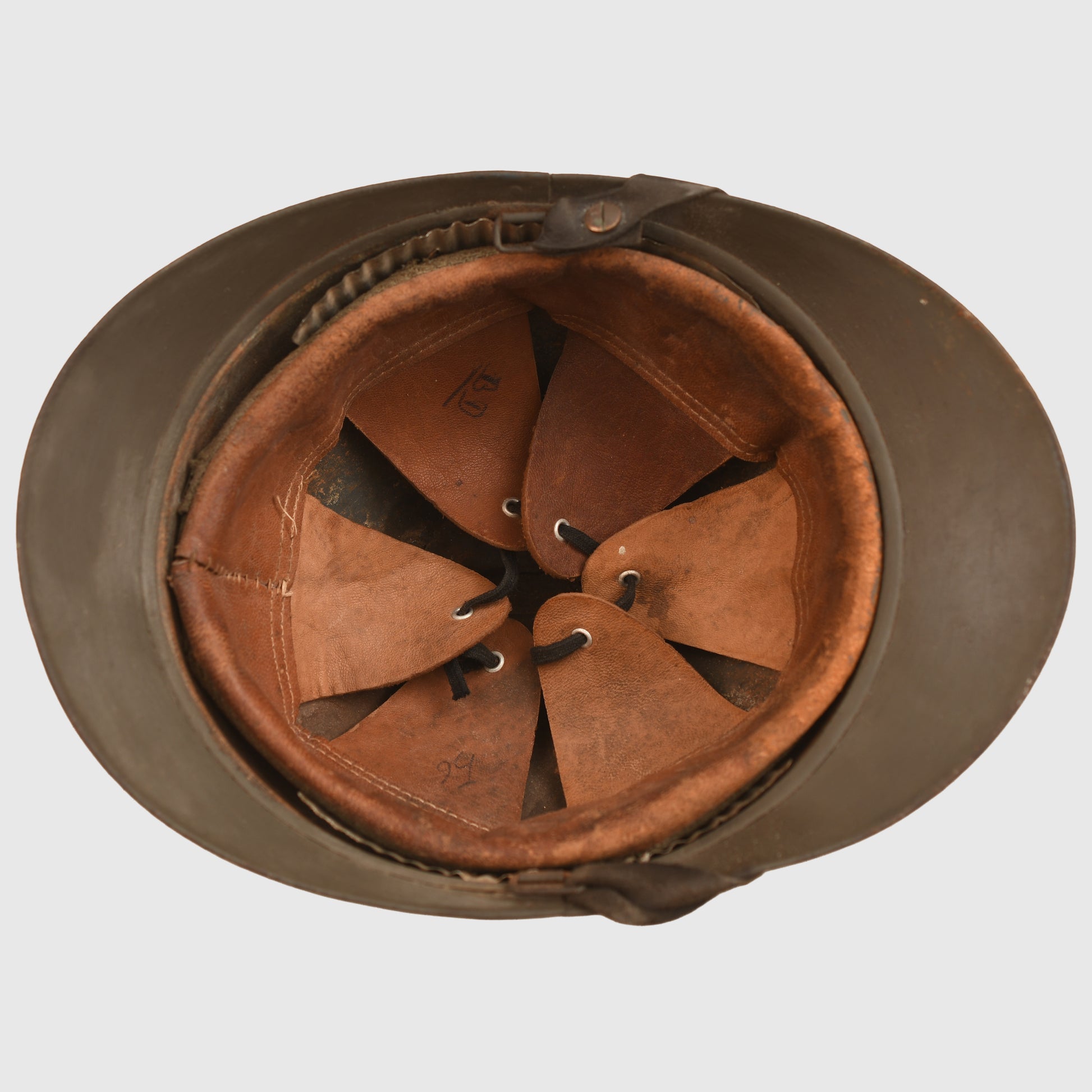 A WWI French Adrian helmet with the 1940 pattern Administration Services badge attached. Any helmets whether they be with the larger First War Administration badge or the re-issue 1940 badge are considered scarce in the Adrian series of helmets Good paint finish overall with original black chinstrap and a complete and undamaged liner all in good colour.