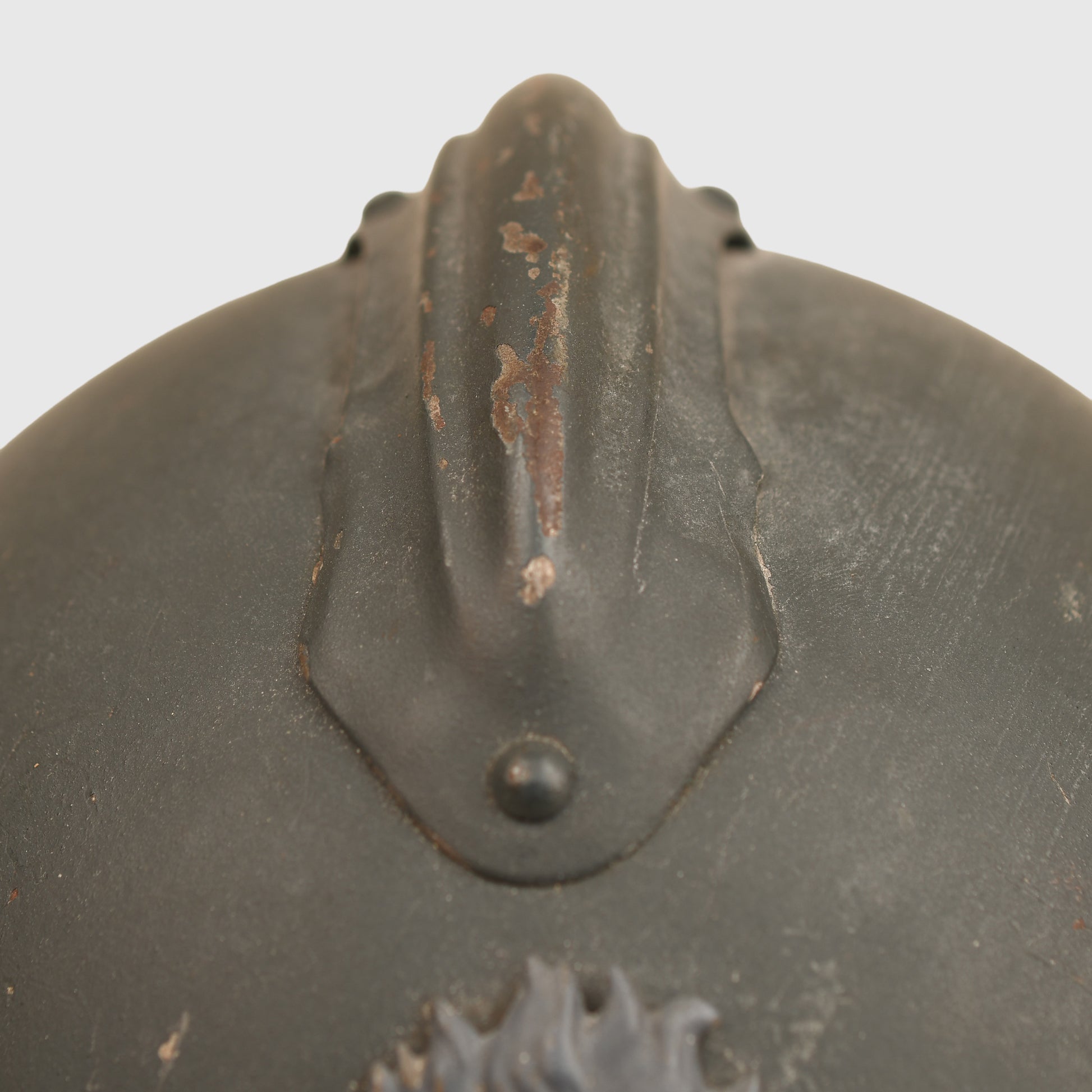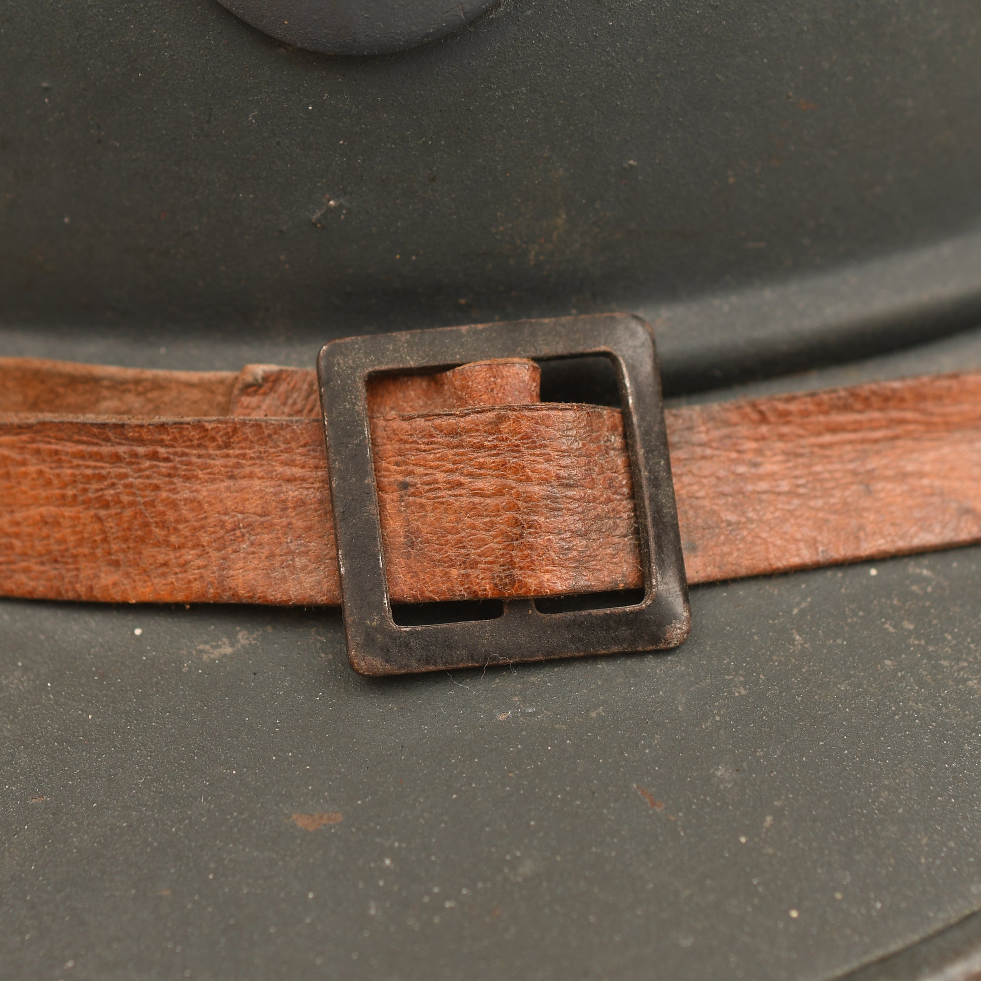 Probably one of the best Adrian Horizon blue helmets we have had for a long time. Minor chips to the paint, mainly on the comb. Complete with its RF flaming grenade infantry badge. The interior six-tone liner with all original colour, with very minor wear and use showing on the lower, darker coloured leather band. Complete with its tan chinstrap.