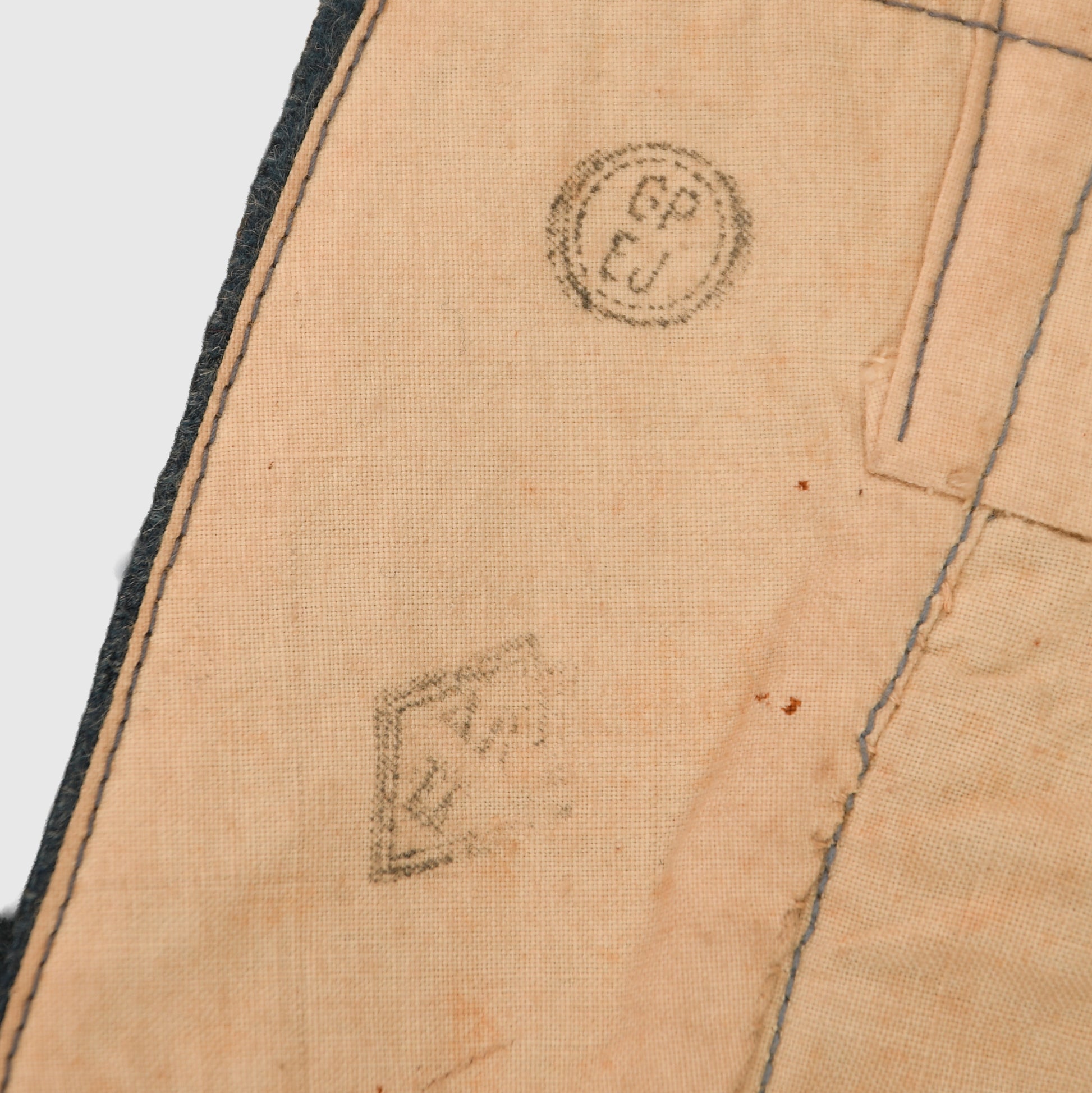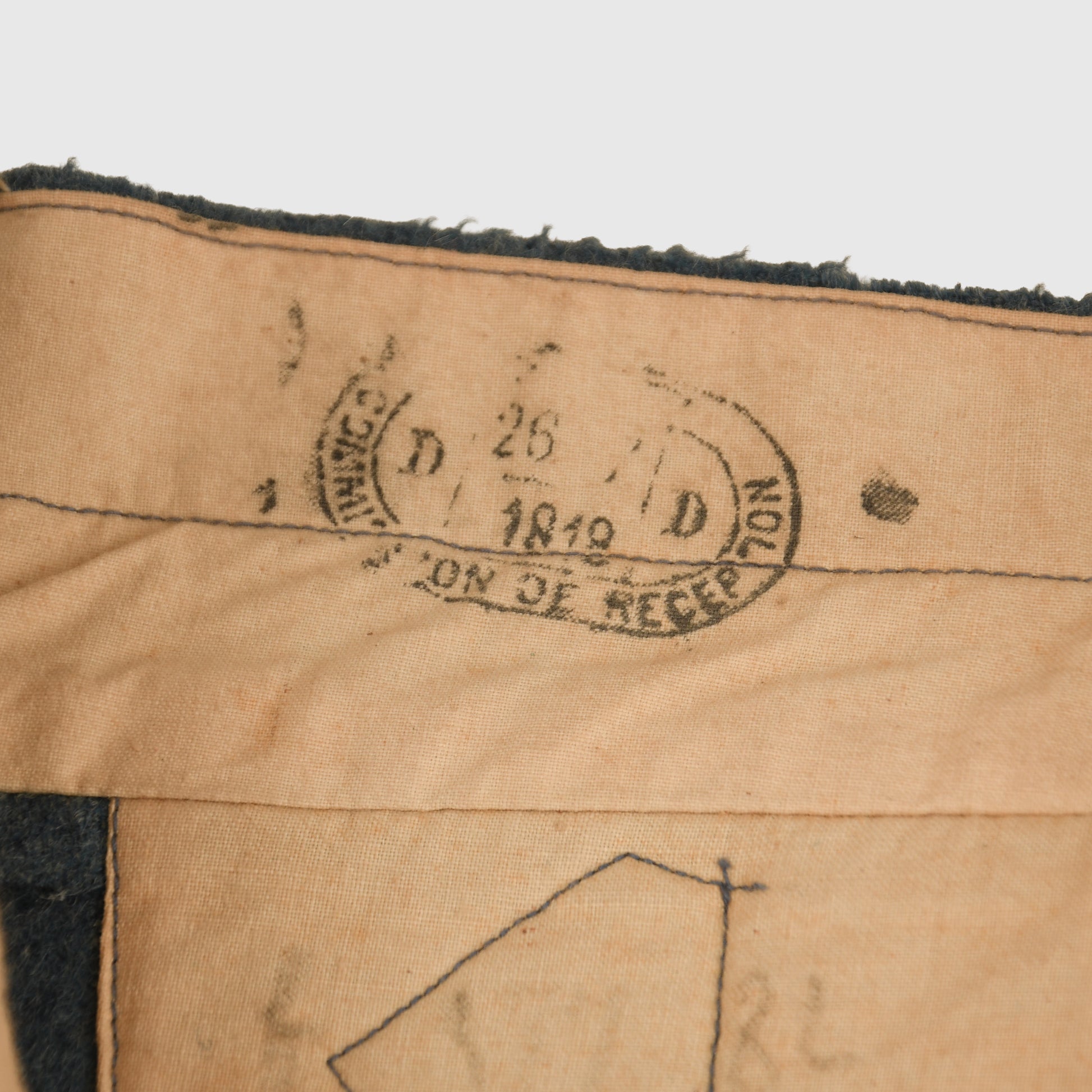 An excellent pair of horizon blue breeches for an artillery enlisted man, with red piping to each side. Nicely dated ‘1918’ and maker marked to the cotton lining. The cloth retains good nap, and, unusually for French WWI clothing, shows only minor moth nips around the crotch area. All original galvanized zinc buttons are present.