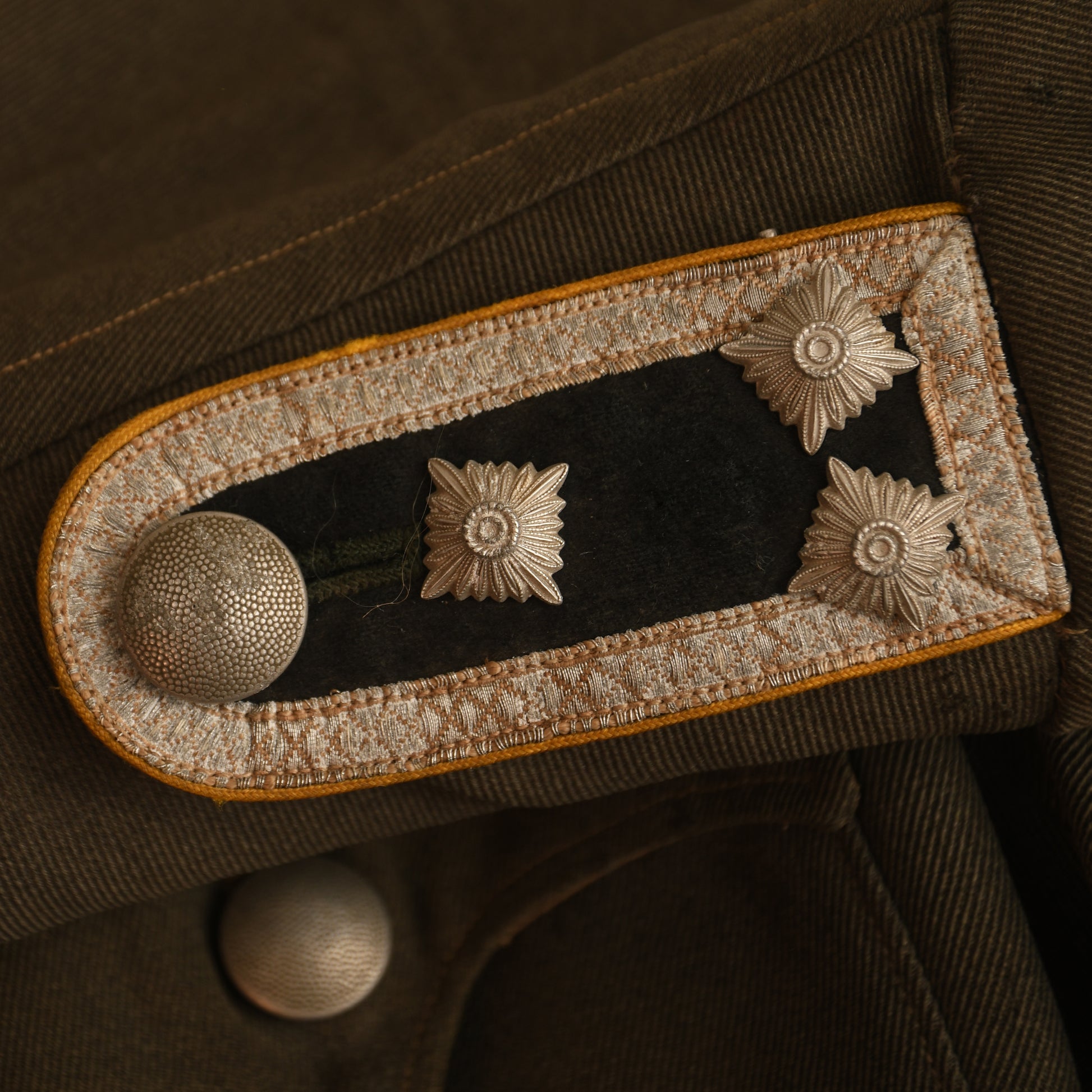 Constructed in the classic Austrian four-pocket style with five-button front closure, it features deeply scalloped pocket flaps with individual pleats and a dark green collar fitted with Bevo-woven cavalry collar patches. The senior NCO shoulder boards are beautifully detailed—dark green centred with deep yellow piping, three rank pips, and surrounded by oxidised silver tress, which continues onto the collar. Each lower sleeve displays two Der Spiess pips.