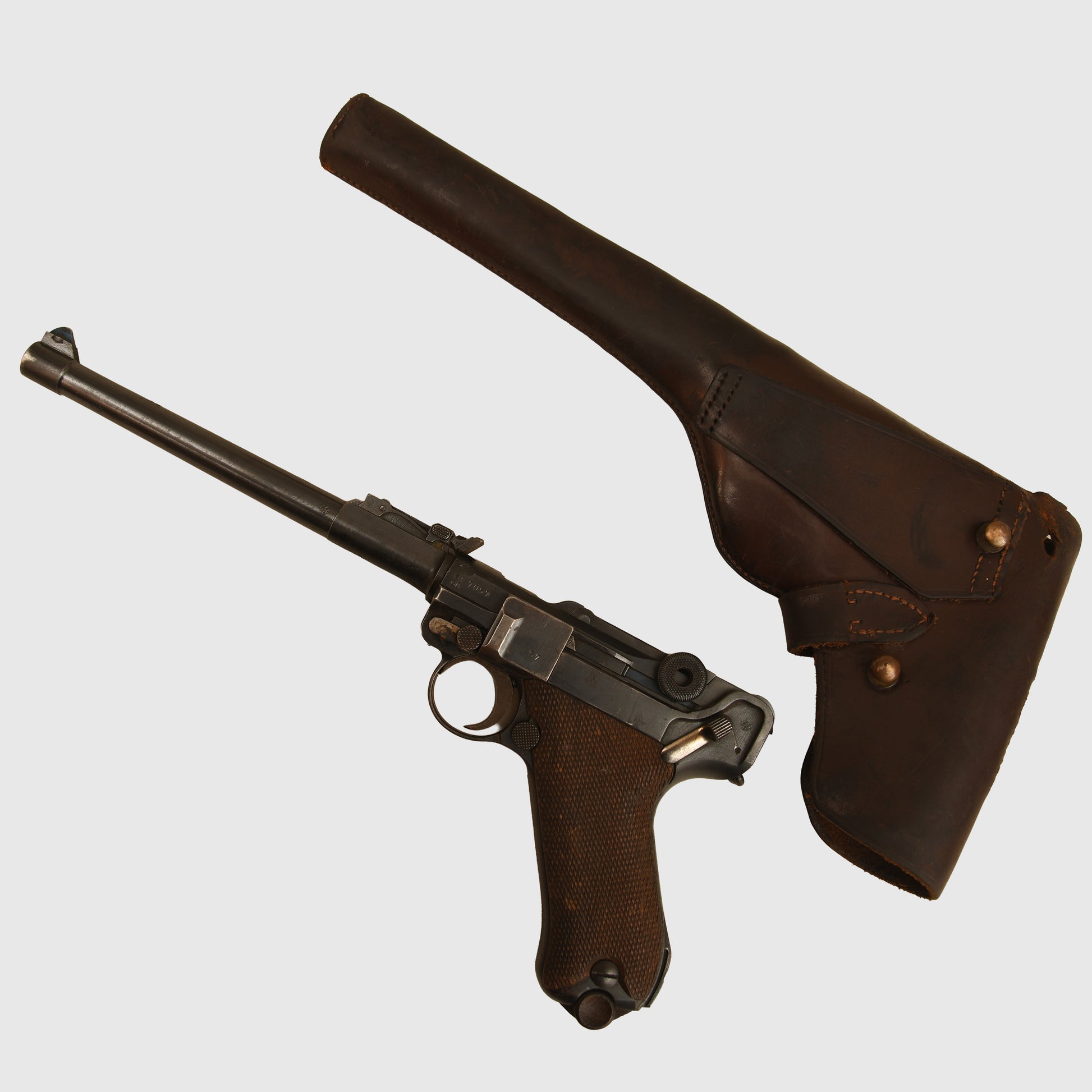 Fitted into its British-made artillery pattern holster, this is clearly a captured example, most likely taken by a British officer who then had a holster made specifically for it. The holster itself is extremely rare. There is a small hole to the upper front section caused by contact with the raised toggle ring, and a further hole to the rear of the front of the closure flap caused by the semi-sharp upper left-hand rear edge of the display piece. The belt loop remains intact, although the stitching to the lower part of the belt loop is frail. All other stitching remains good and strong, with the closure tab present. The holster alone is valued at over £400.