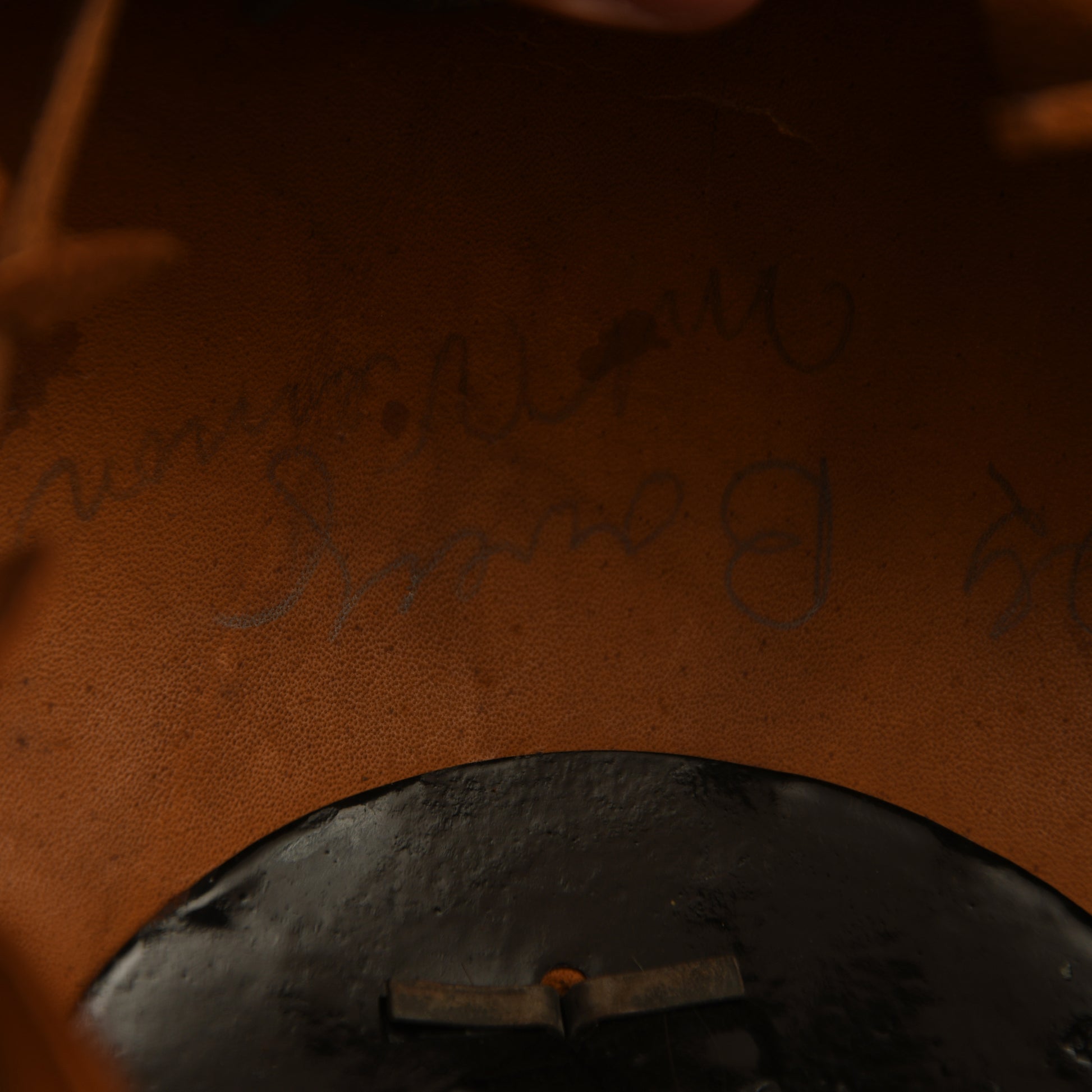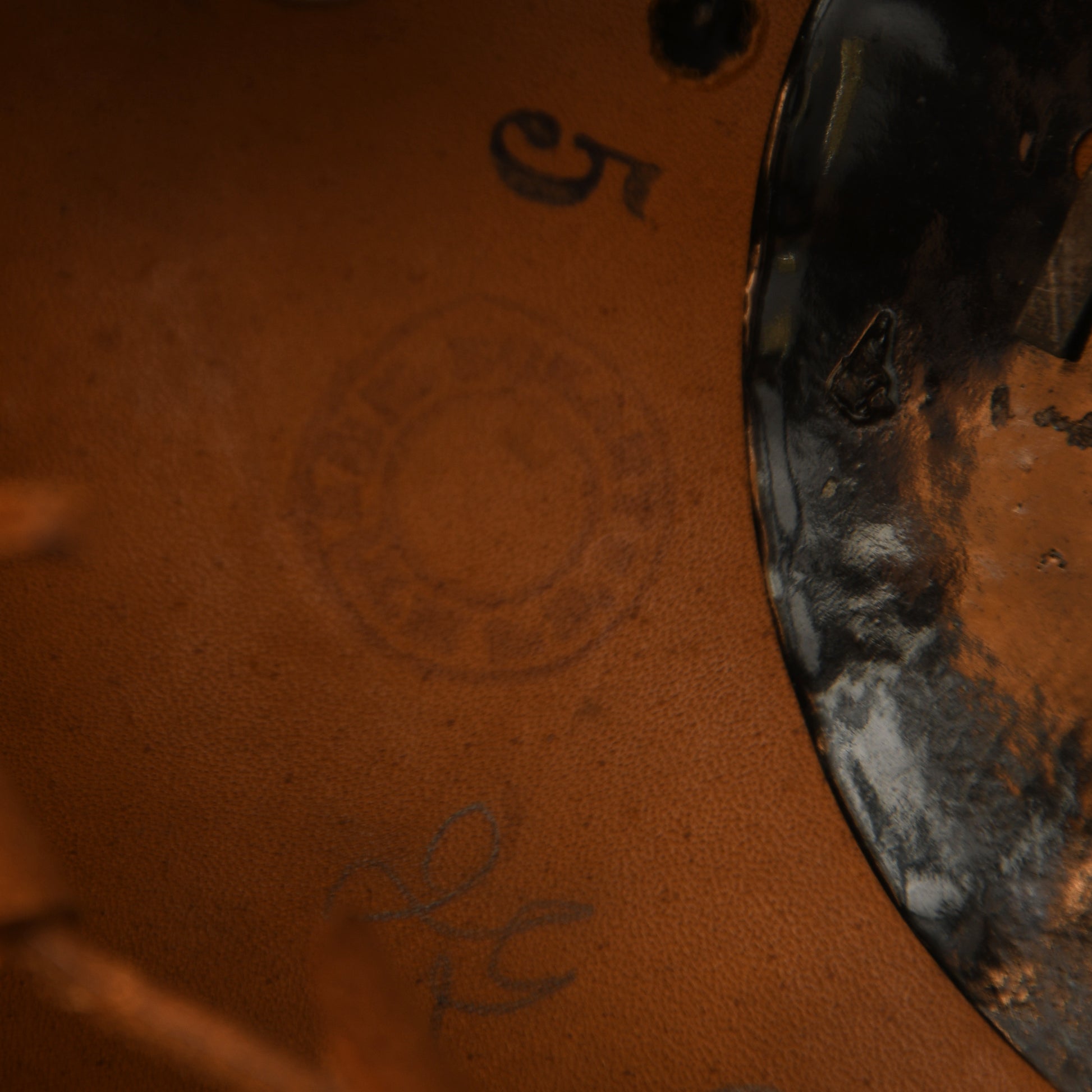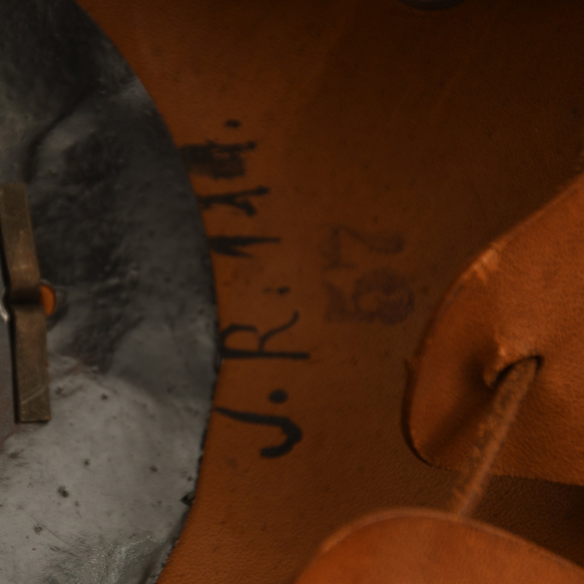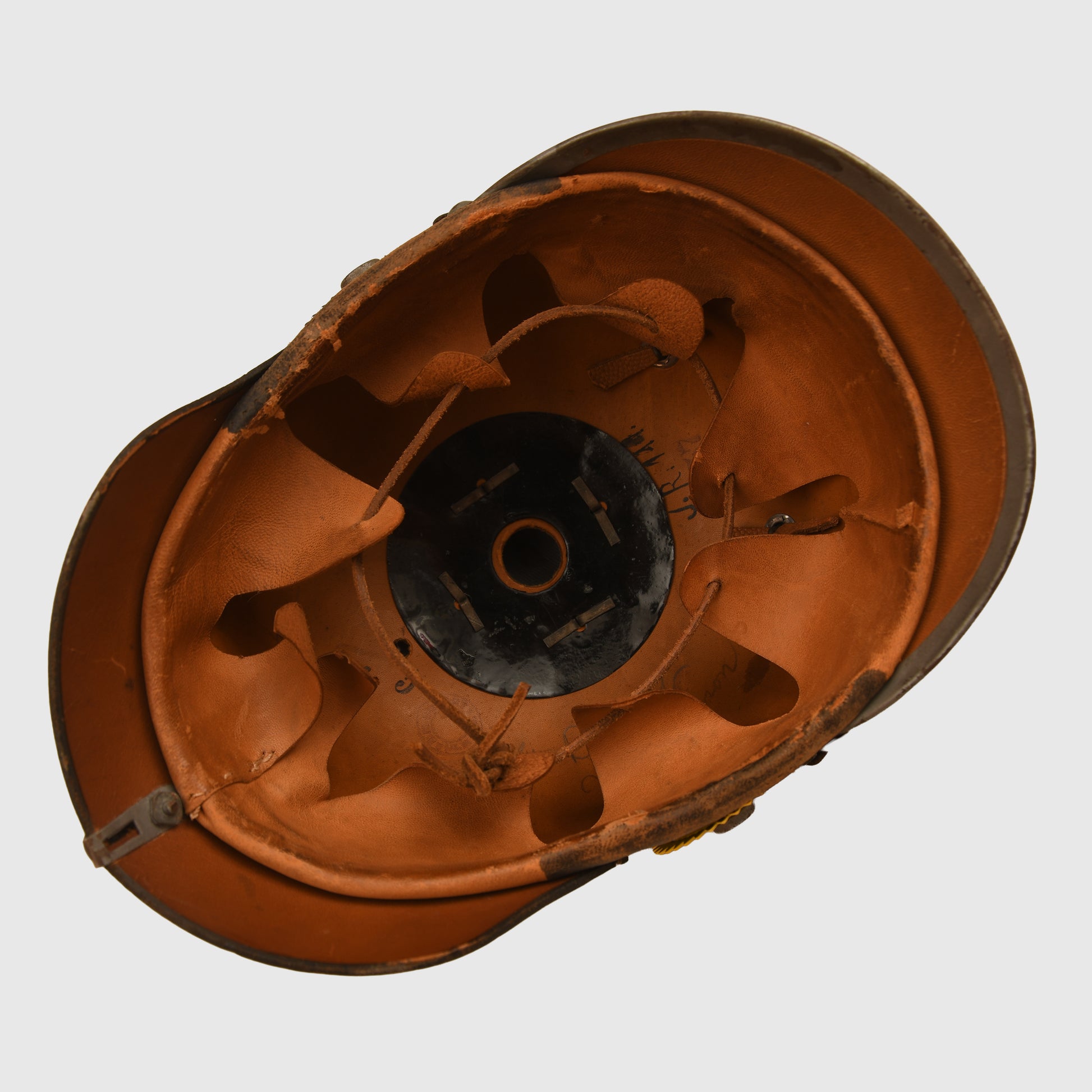 The interior is equally impressive, with the skull and eight-tongue liner in matching light tan, showing only minor scuffing to the lower inner edges. The original leather drawstring remains intact, and the helmet is hand-applied with the regimental marking ‘JR111’. A faint manufacturer’s circular stamp and pencil-applied original owner’s name are visible on the skull. This is an exceptionally rare pickelhaube in near-perfect condition.