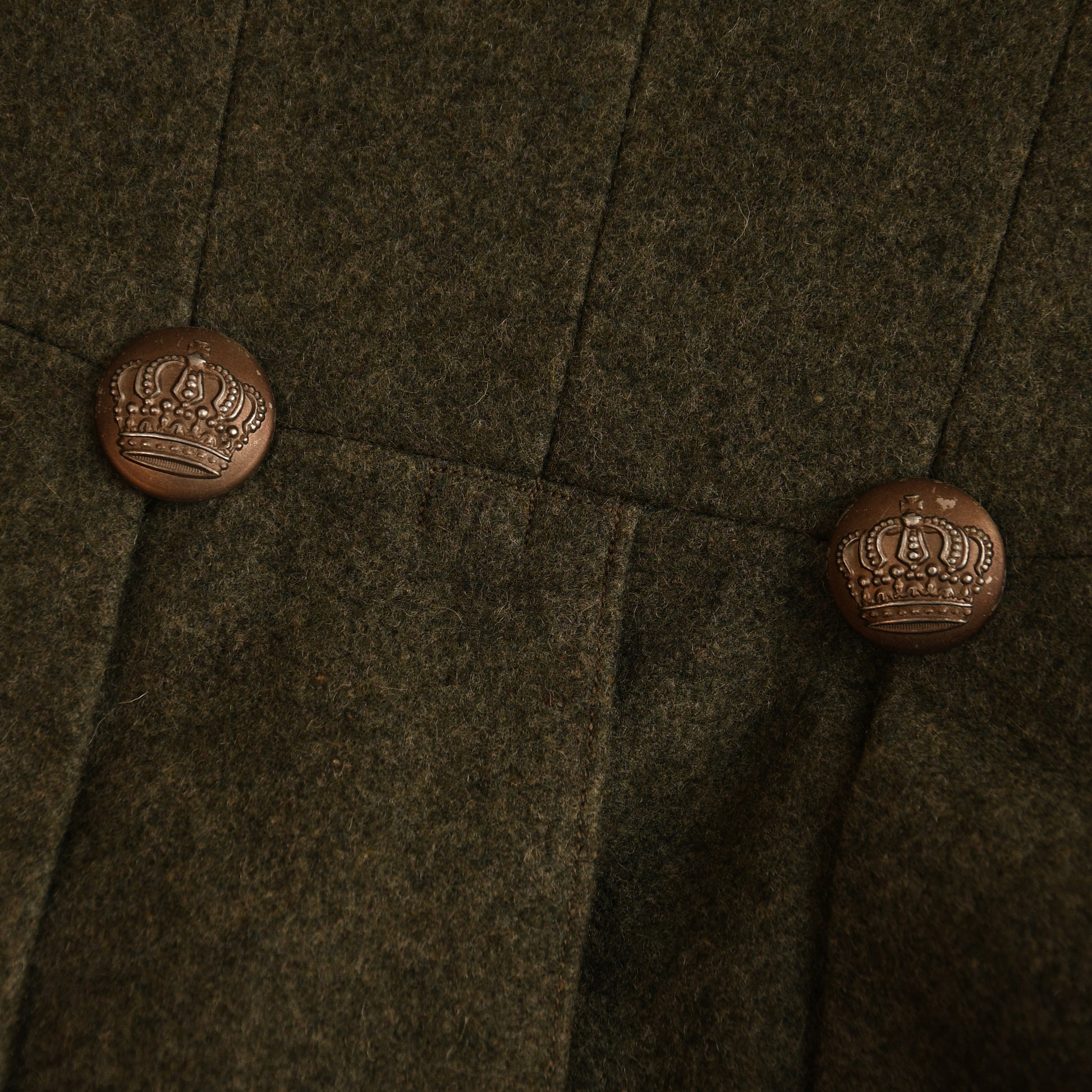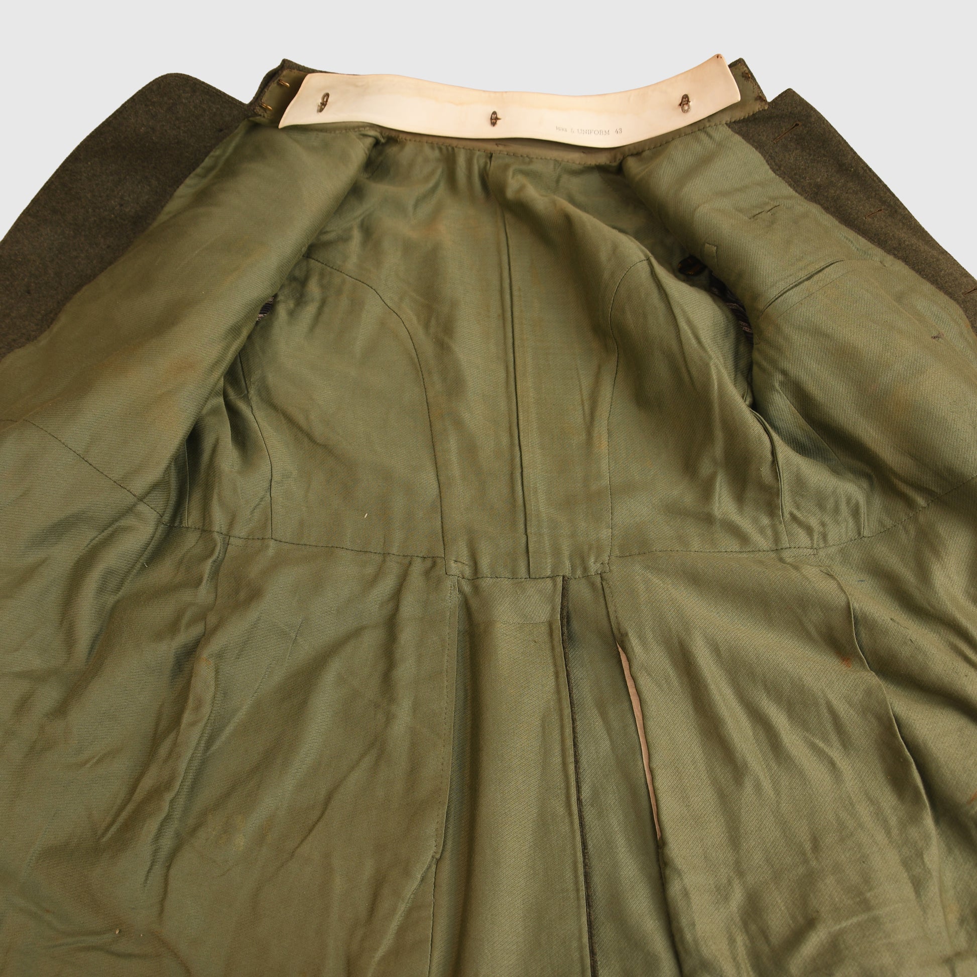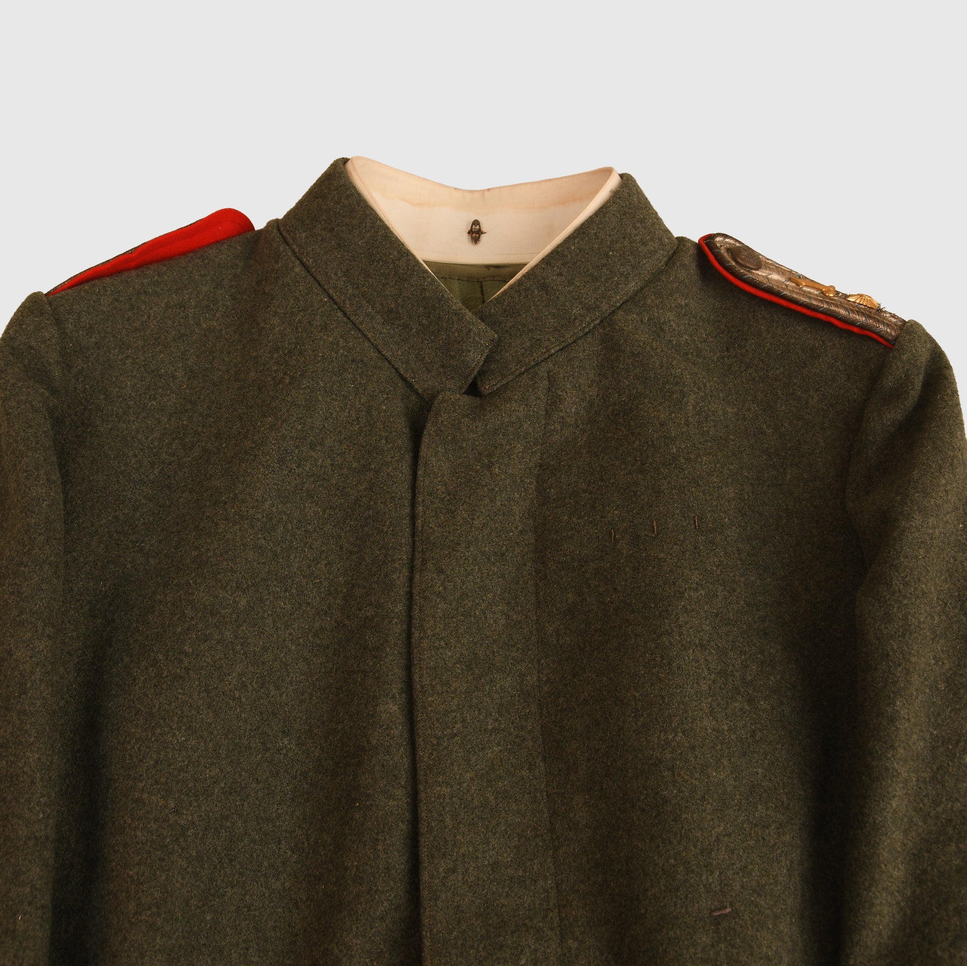 A superb large-size Model 1915 bluse with modified stand collar, worn by an Oberleutnant of the 1st Bavarian Artillery Regiment. The field-grey cloth retains excellent nap throughout and shows no moth damage. It features the correct 1915 deep barrel cuffs, skirted back, and all Bavarian exterior buttons, with matching horn fly-closure buttons. The silver bullion shoulder boards, flecked with Bavarian blue, are fitted with gilt rank stars and the gilt numeral ‘1’. Inside, the tunic has a private-purchase lining with a full tailor’s label from ‘Schmidt of Neu-Ulm’. Hidden within one of the rear skirt pockets were the remains of a Feldpost letter dated February 1918 to an officer named Frickhin of Munich, along with a telegram from February 1923, suggesting the tunic may have seen further wear during the Freikorps period. An excellent and highly atmospheric Bavarian officer’s uniform.