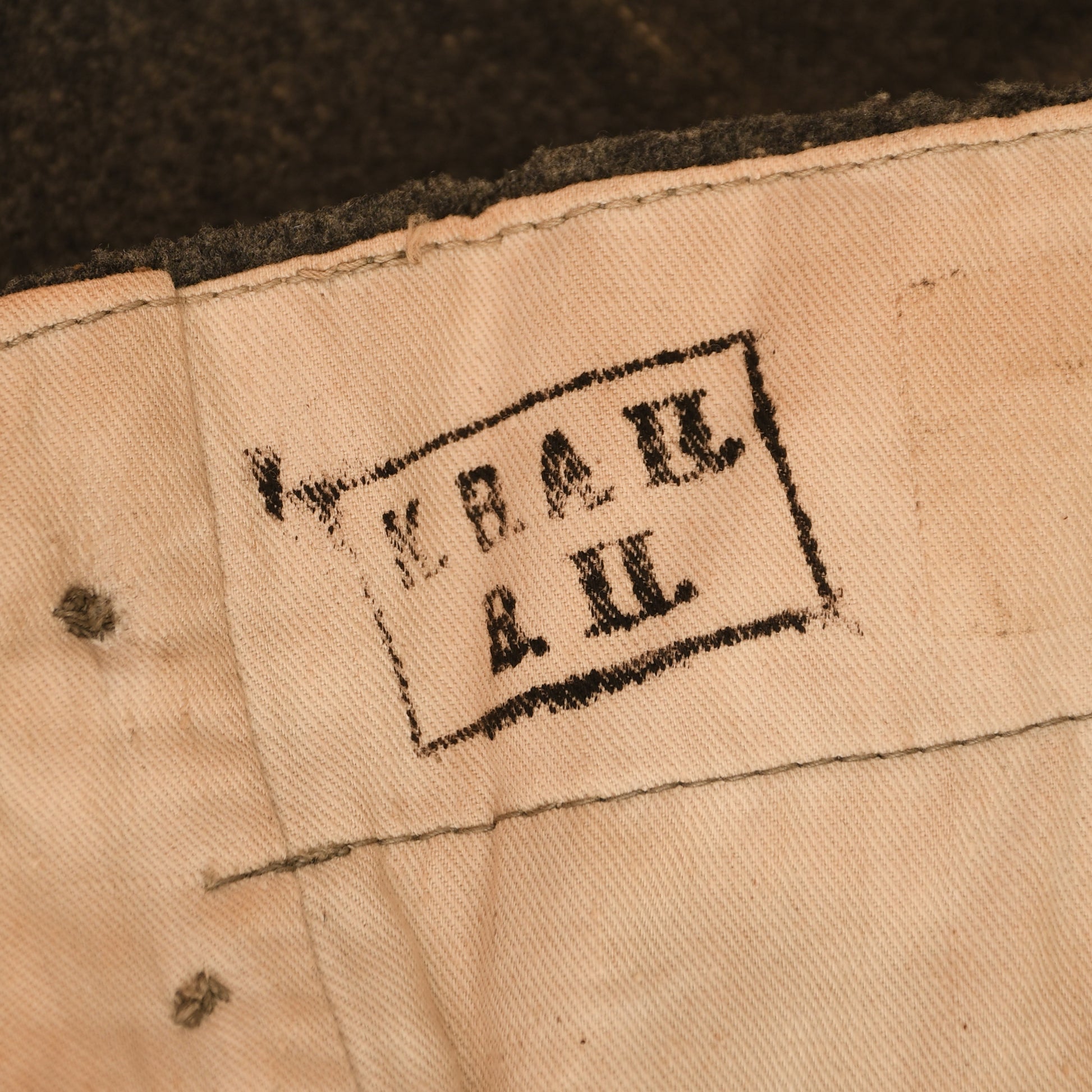 A rare set of steel grey breeches, typically worn by mountain troops and assault pioneers. The trousers show minimal wear with a small moth hole on the inner thigh, another near the left-hand pocket opening, and a further tiny hole at the rear near the V section of the waistband. Designed in the correct WWI configuration, they feature straight legs or breeches with the long adjustment belt on the reverse and a double-pronged buckle. All zeltbahn type buttons are present, with two upper side pockets secured by closure buttons. Fully lined in lightweight brushed cotton from the waistband to the lower breech, these breeches are marked within a rectangle ‘K.B.A.II B.II’, indicating the Bavarian 2nd Army Corps. A superb and historically significant set.