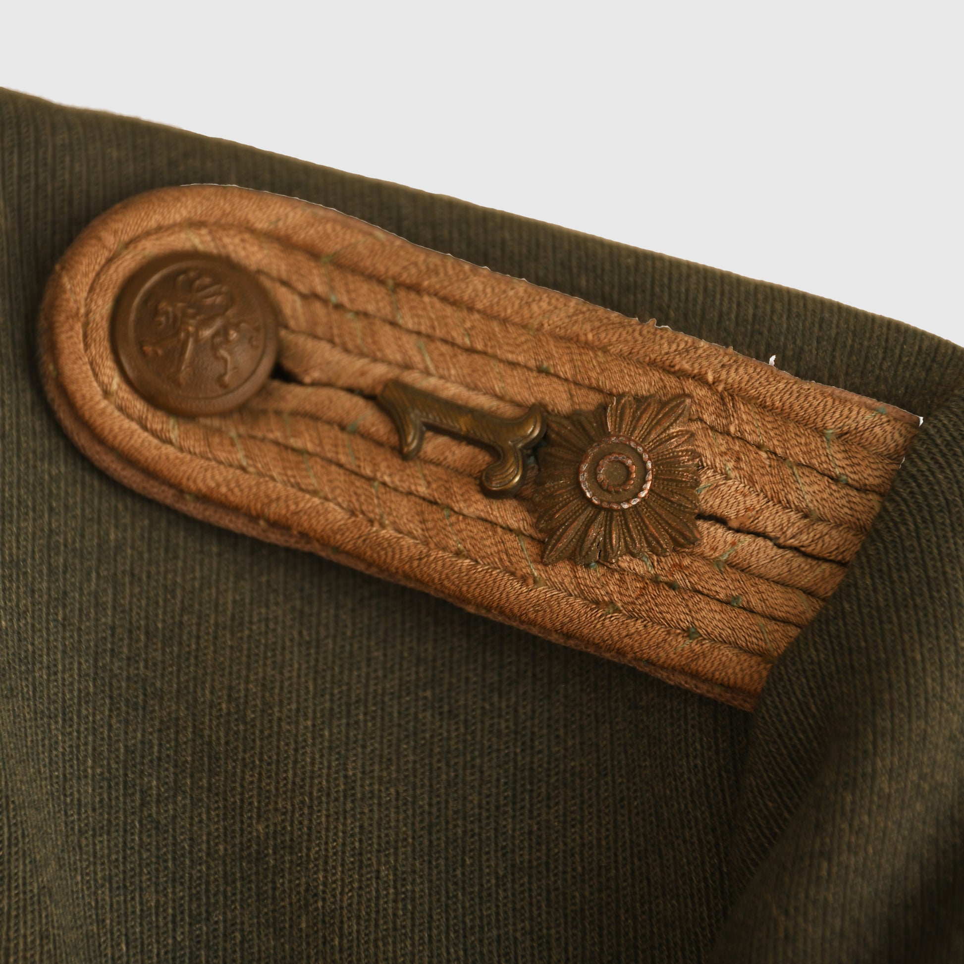 The insignia includes a very faded pair of Oberleutnant shoulder boards in silver lace, showing faint traces of Bavarian blue fleck within the lace, with a light blue underlay that has faded to grey at the edges and regiment number ‘1’ attached. Ribbon loops to the second button hold the Iron Cross 2nd Class and a blue, white, and black Bavarian Order ribbon.