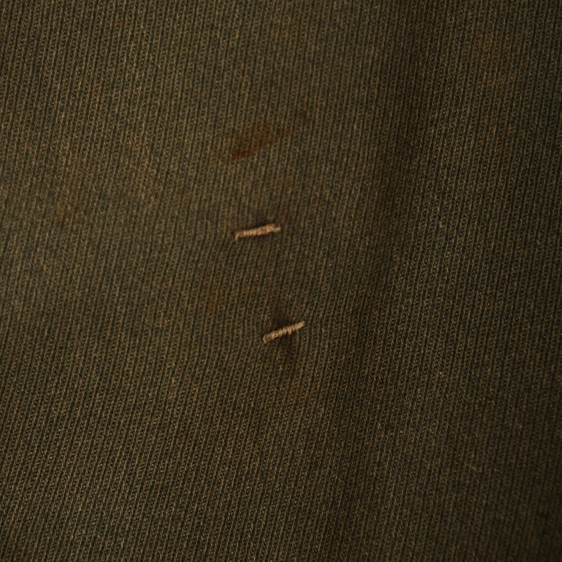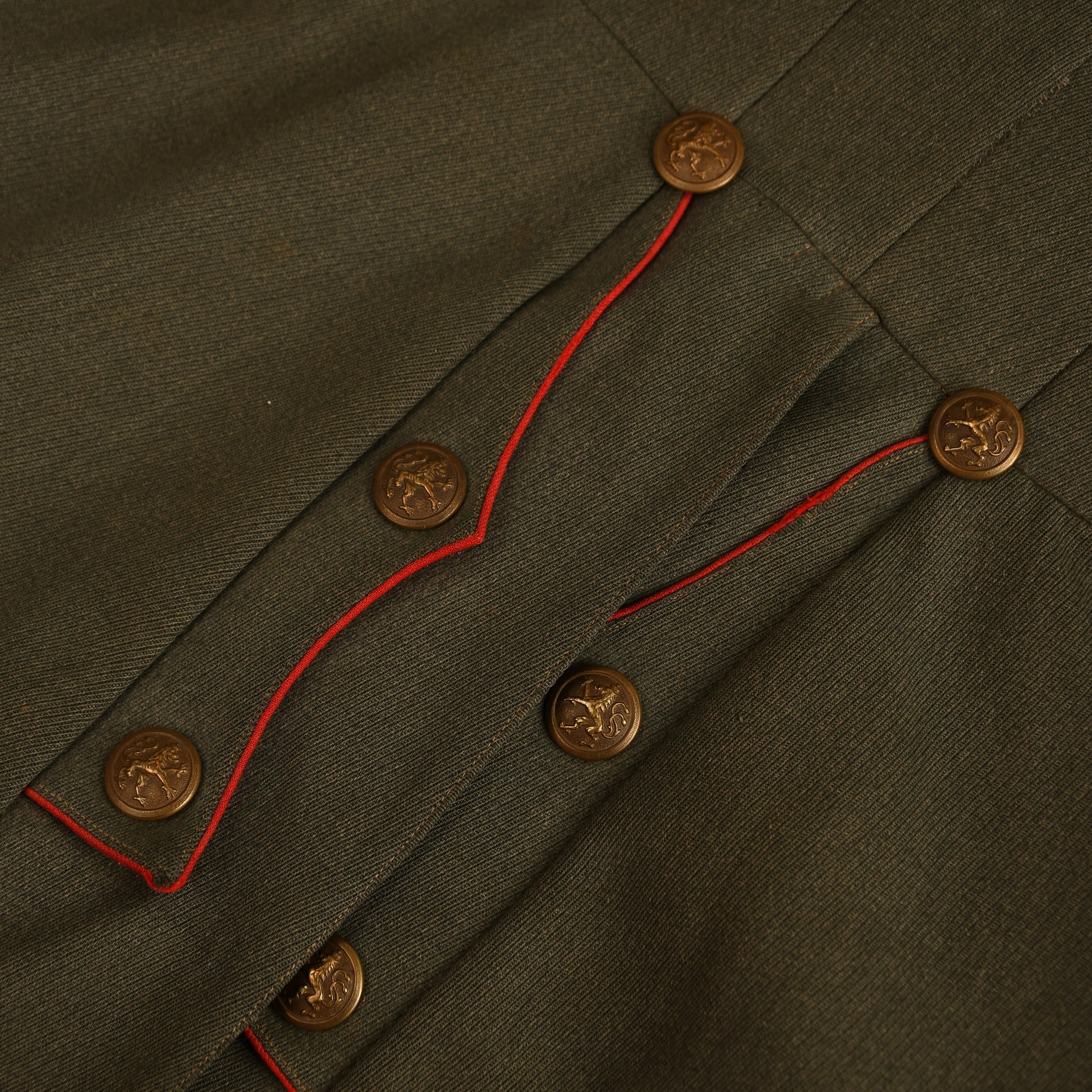 A service-worn tunic in nice overall condition with light staining from storage and use. No moth damage is present, aside from one repaired tear just below the stand collar on the left side. Correctly configured for technical troops, it features a black-piped collar, red-piped front skirt, black-piped Swedish cuffs, and red-piped Prussian rear skirt. All Bavarian buttons are fitted, with two angled lower pockets also retaining Bavarian buttons.