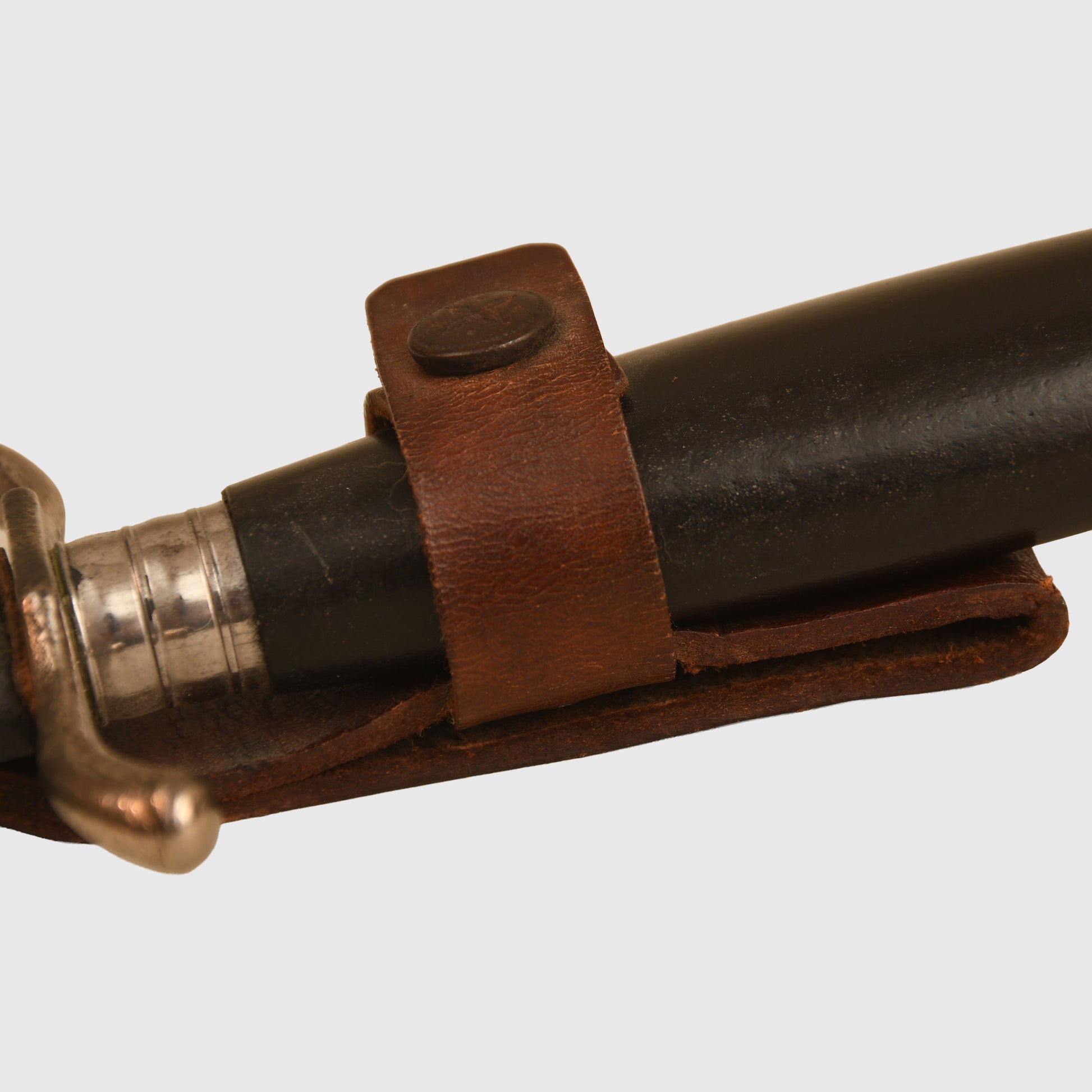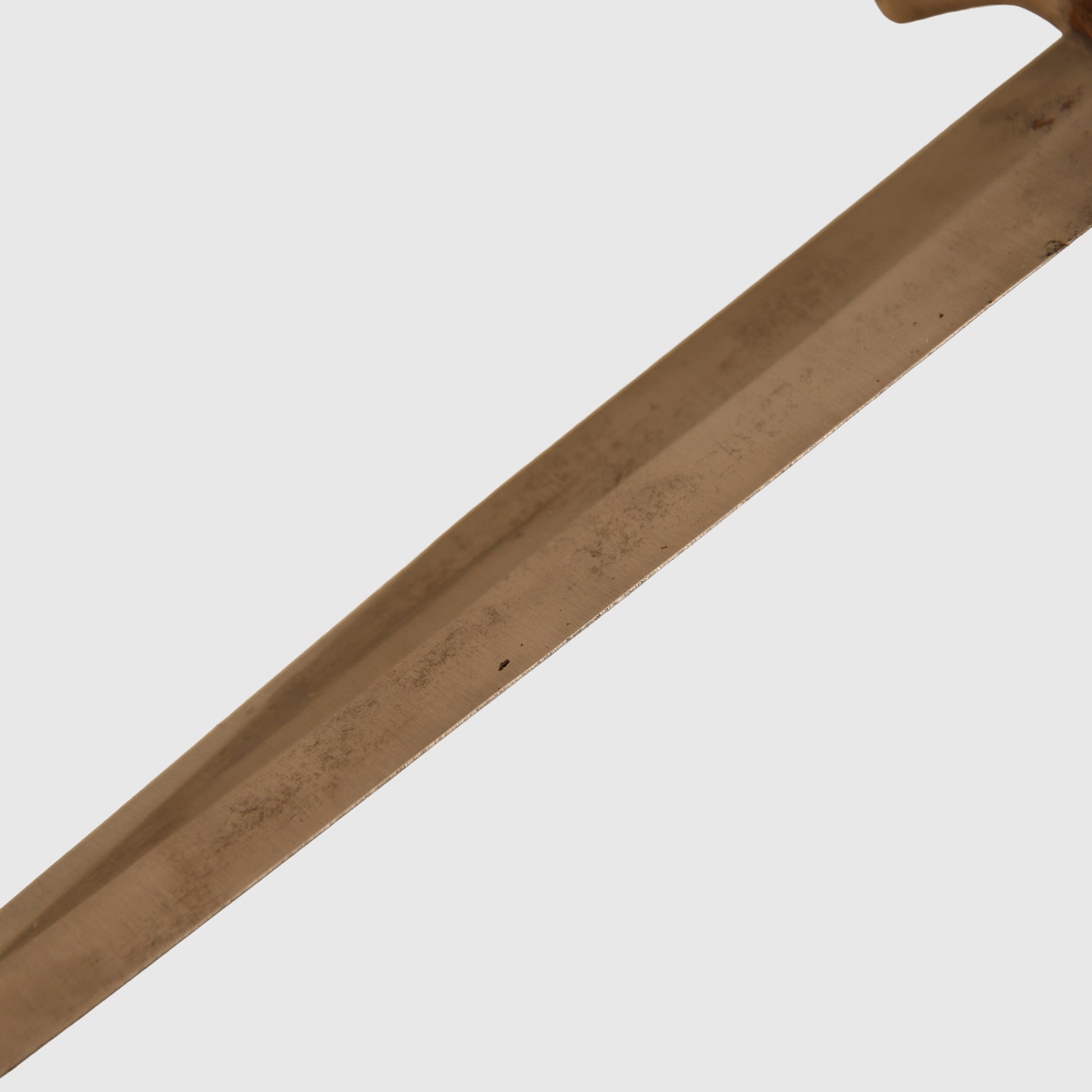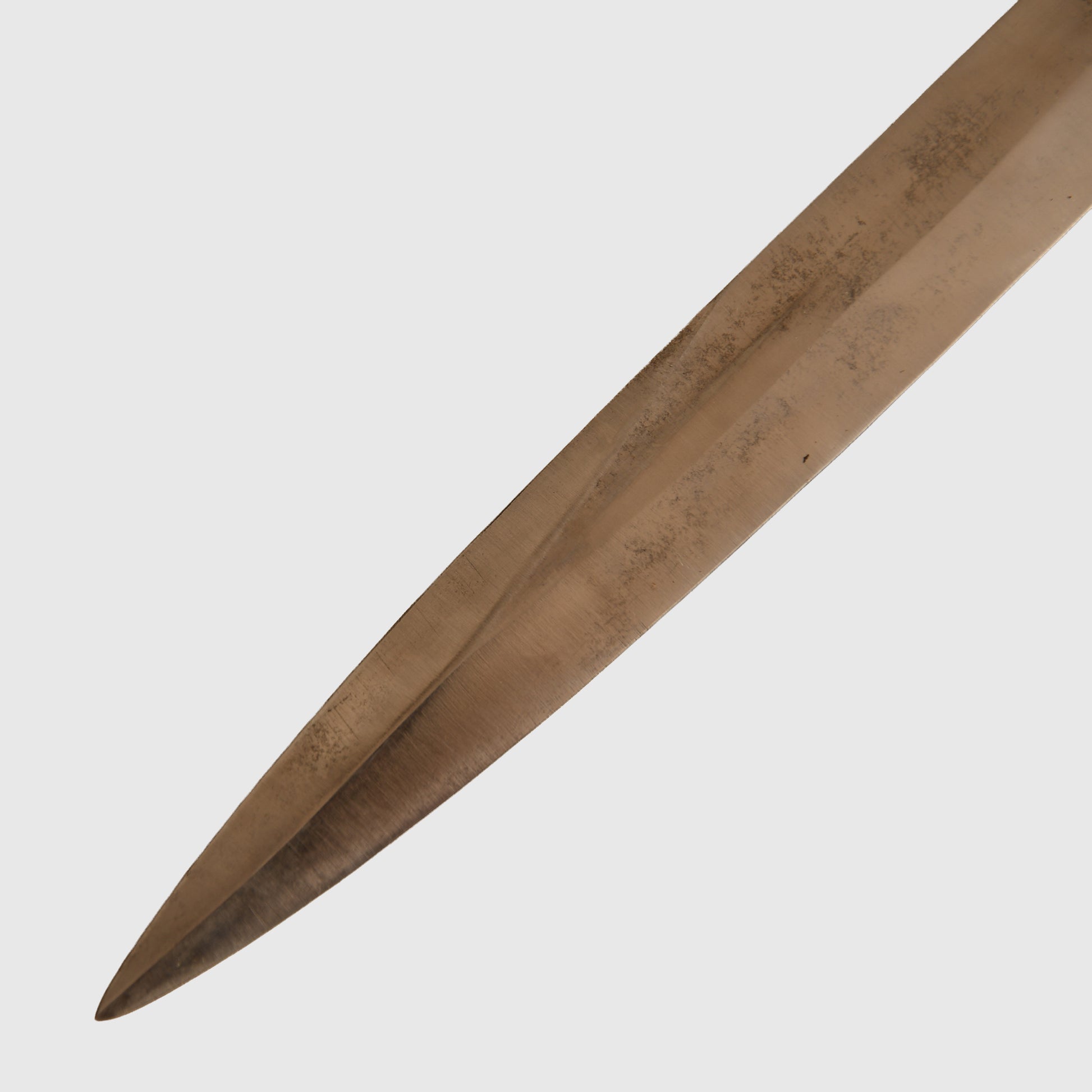 A 29 cm display piece, widely used by German military personnel. Excellent condition with much of its original cross grain finish remaining. Features an S-shaped nickel-plated cross guard, undamaged oval wooden grip, and white metal upper pommel. Fitted into its original all-leather scabbard with white nickel bottom chape and contrasting brown leather belt loop. The hilt retaining strap is complete with a fully functioning male/female closure stud.