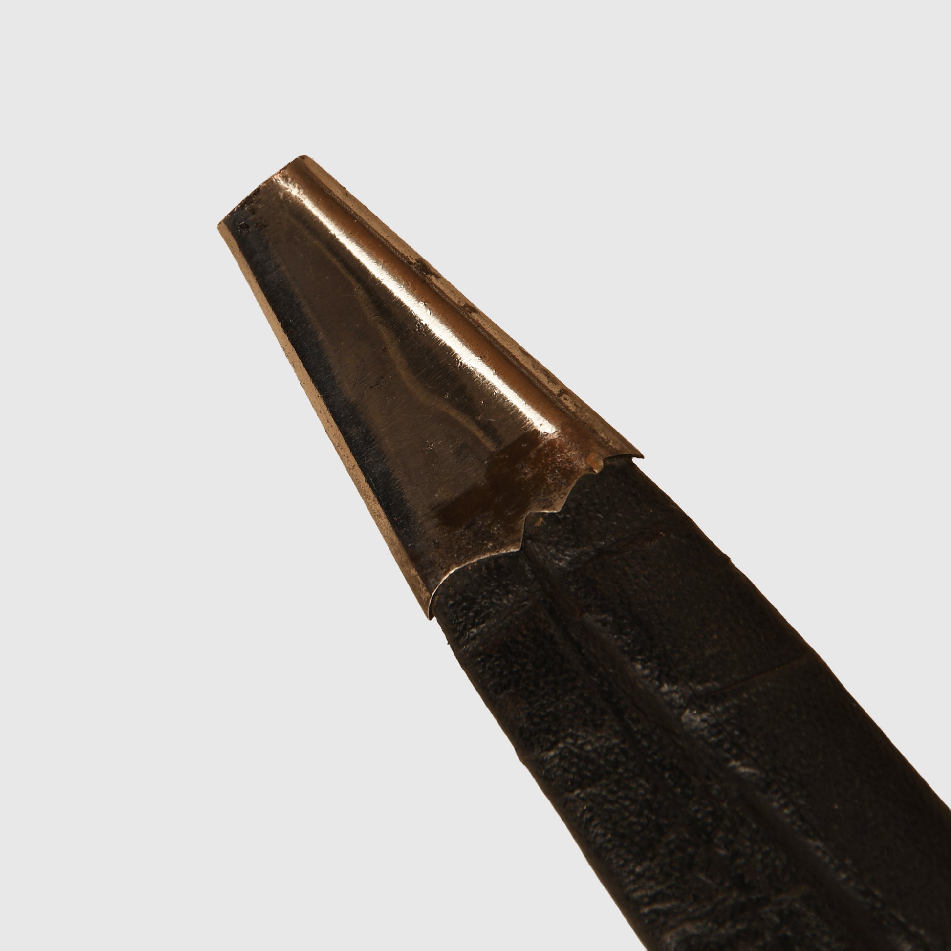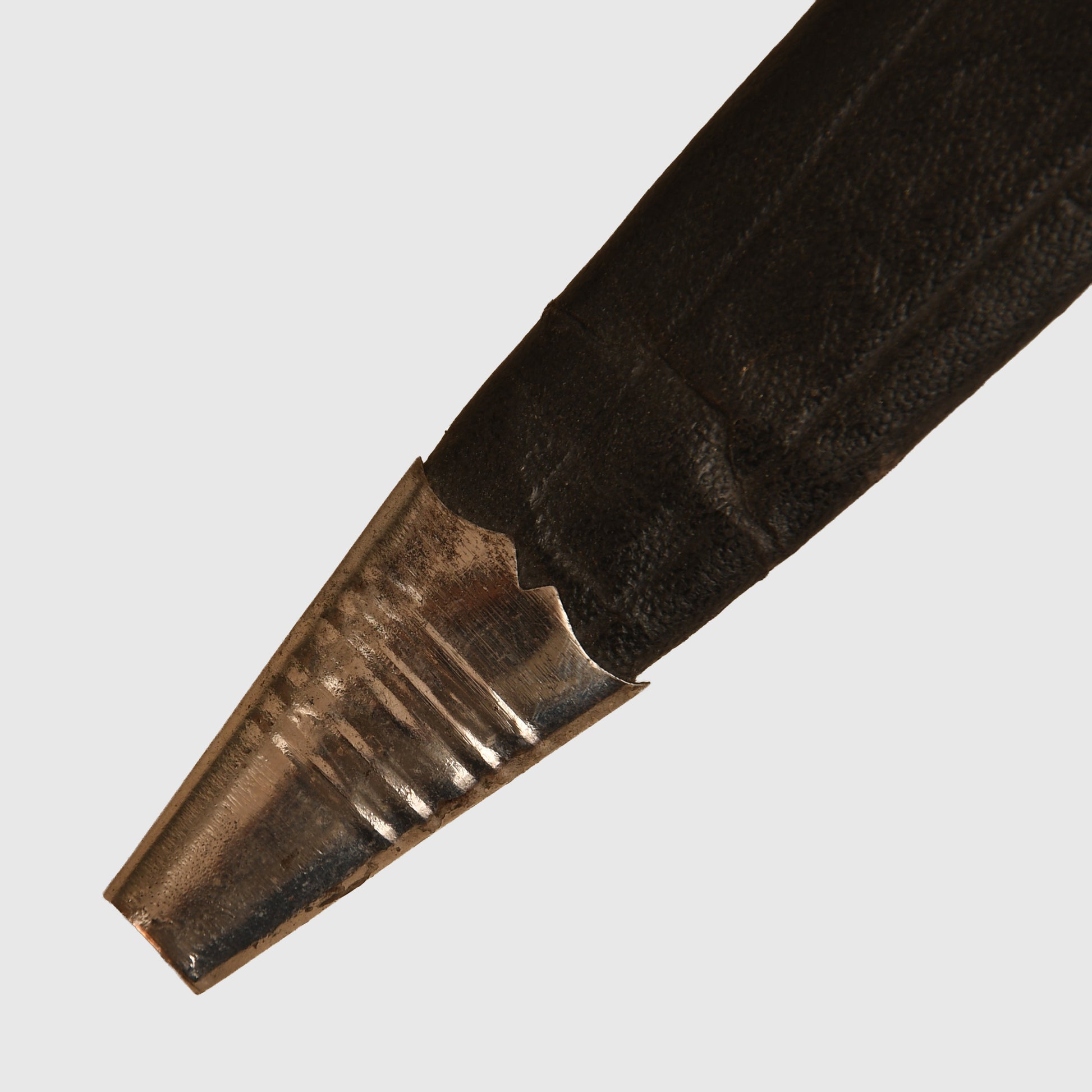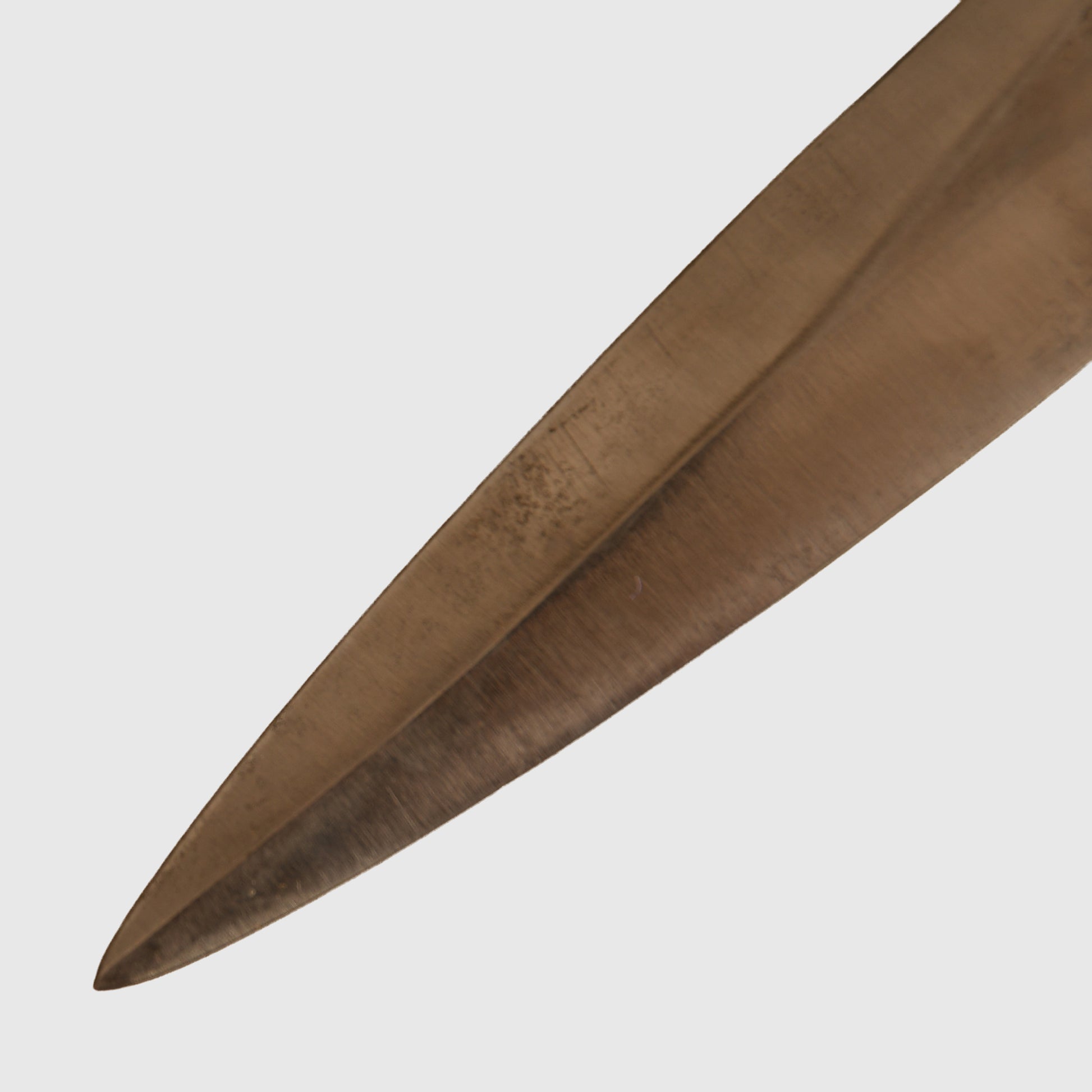 A 29 cm display piece, widely used by German military personnel. Excellent condition with much of its original cross grain finish remaining. Features an S-shaped nickel-plated cross guard, undamaged oval wooden grip, and white metal upper pommel. Fitted into its original all-leather scabbard with white nickel bottom chape and contrasting brown leather belt loop. The hilt retaining strap is complete with a fully functioning male/female closure stud.