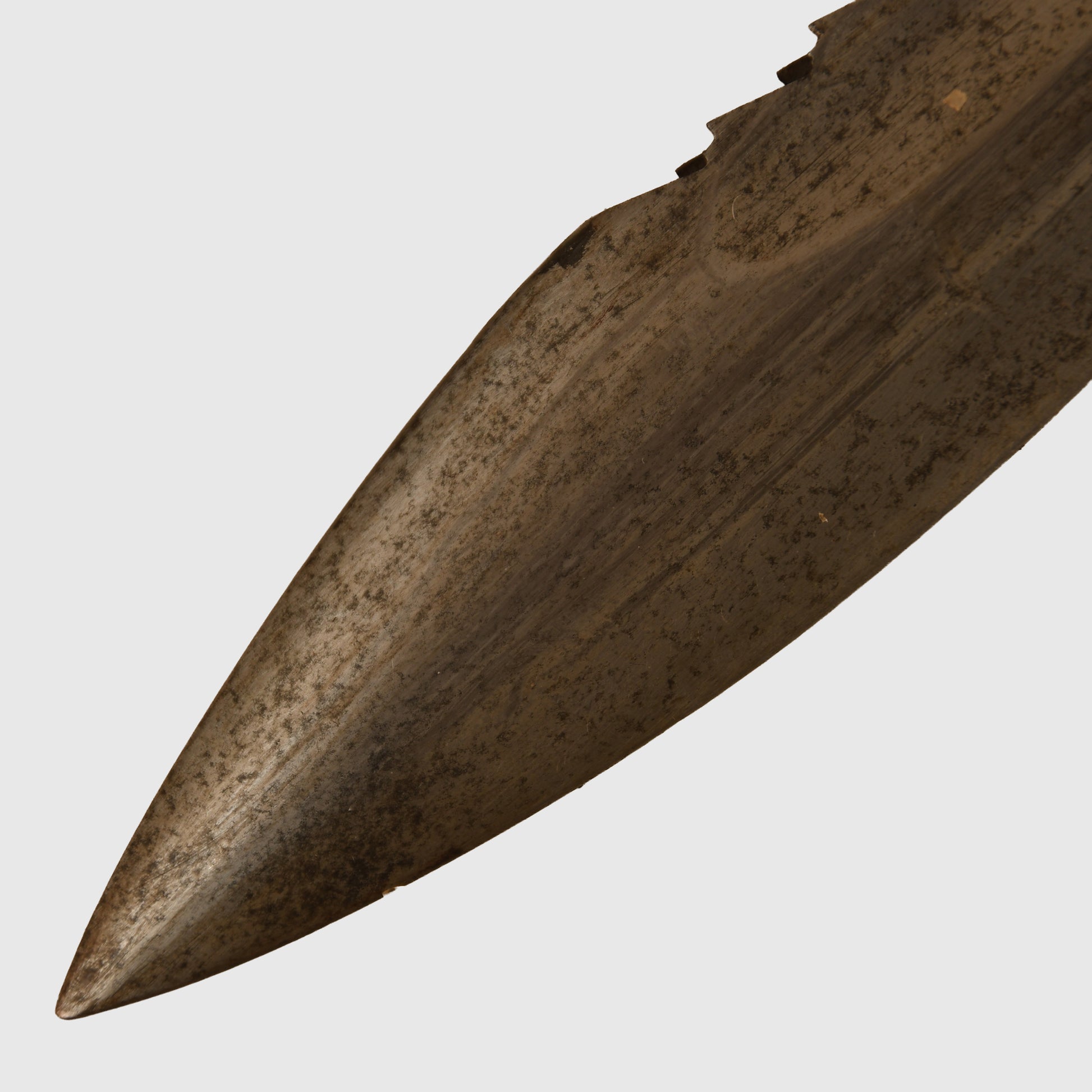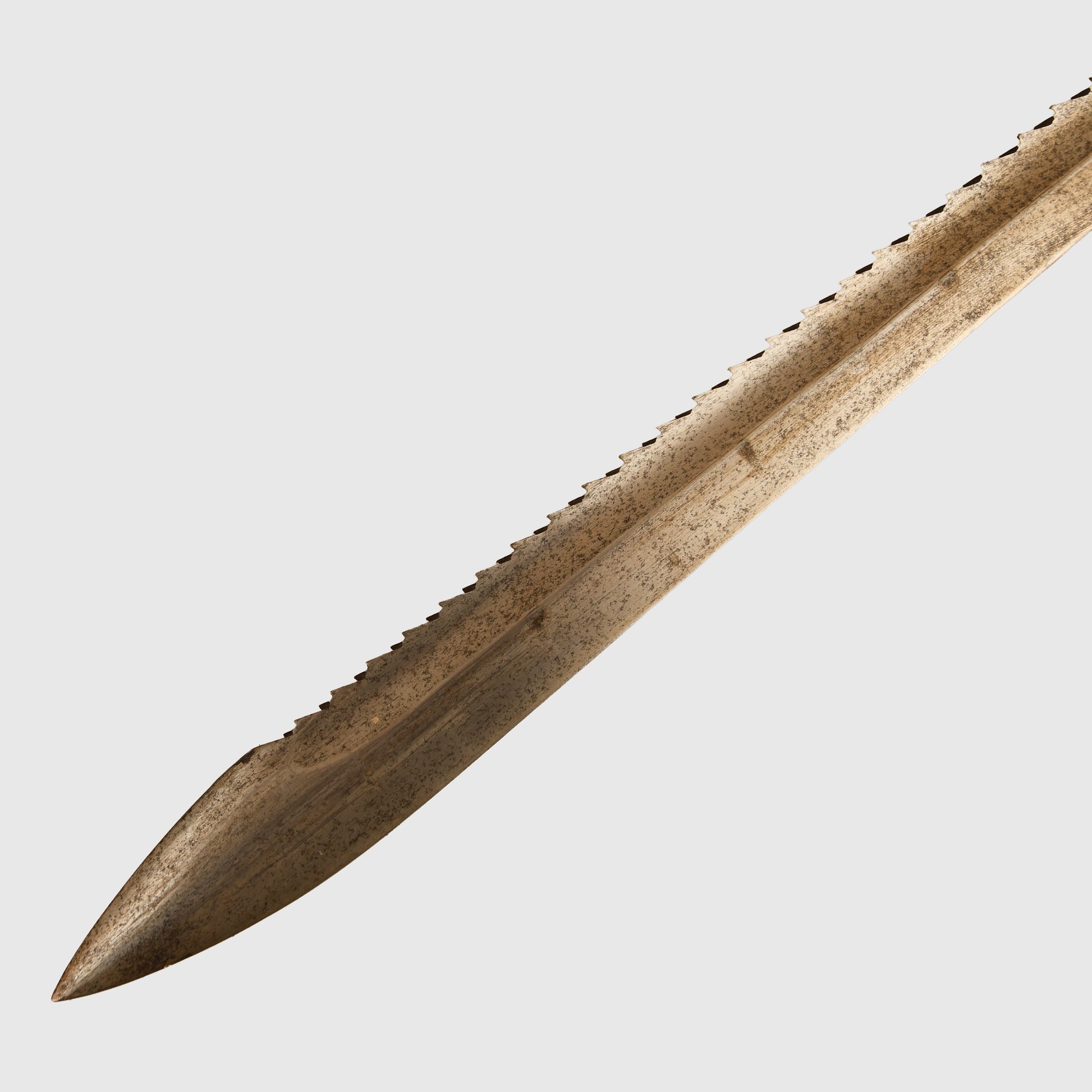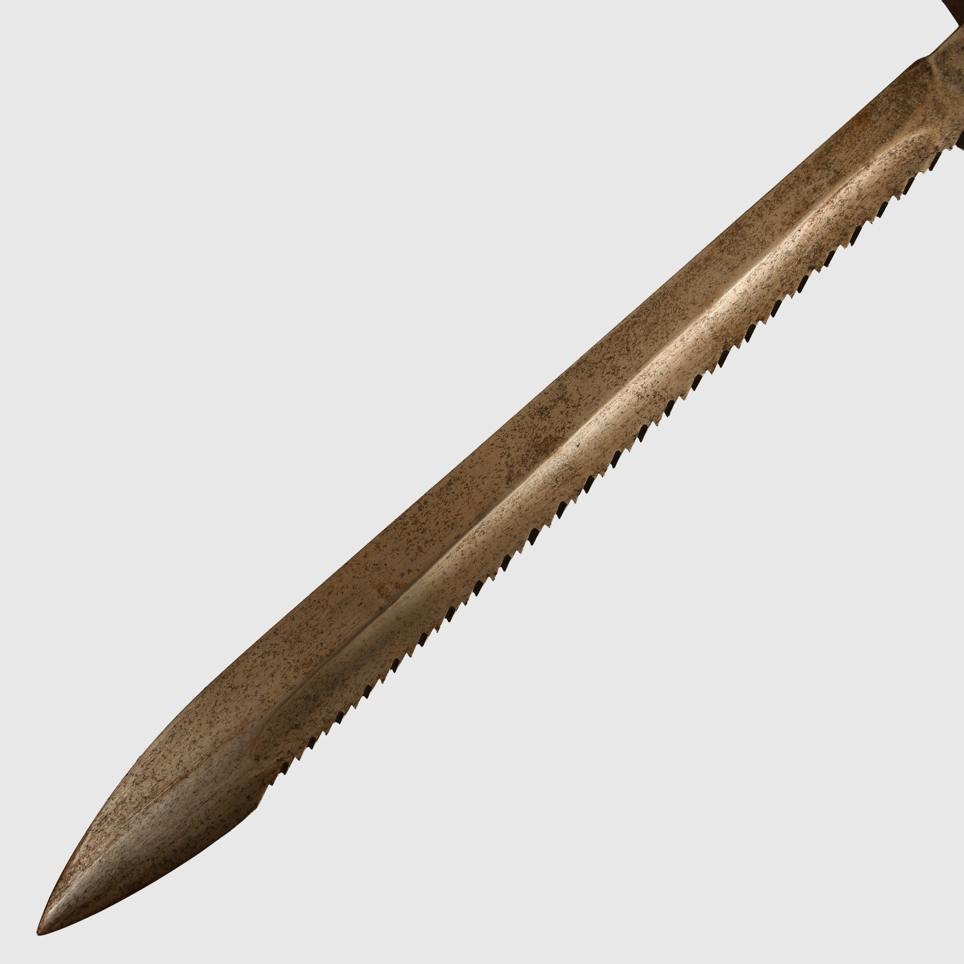 A rare and fascinating First World War example of the all-steel Ersatz pattern, produced for the Mauser 98/05 series. This late-war emergency model features a one-piece steel hilt showing light surface patina from age, with the retaining catch mechanism present but currently jammed. The saw-backed edge remains in excellent form, retaining all its original teeth and showing a crisp Imperial acceptance mark along the spine.