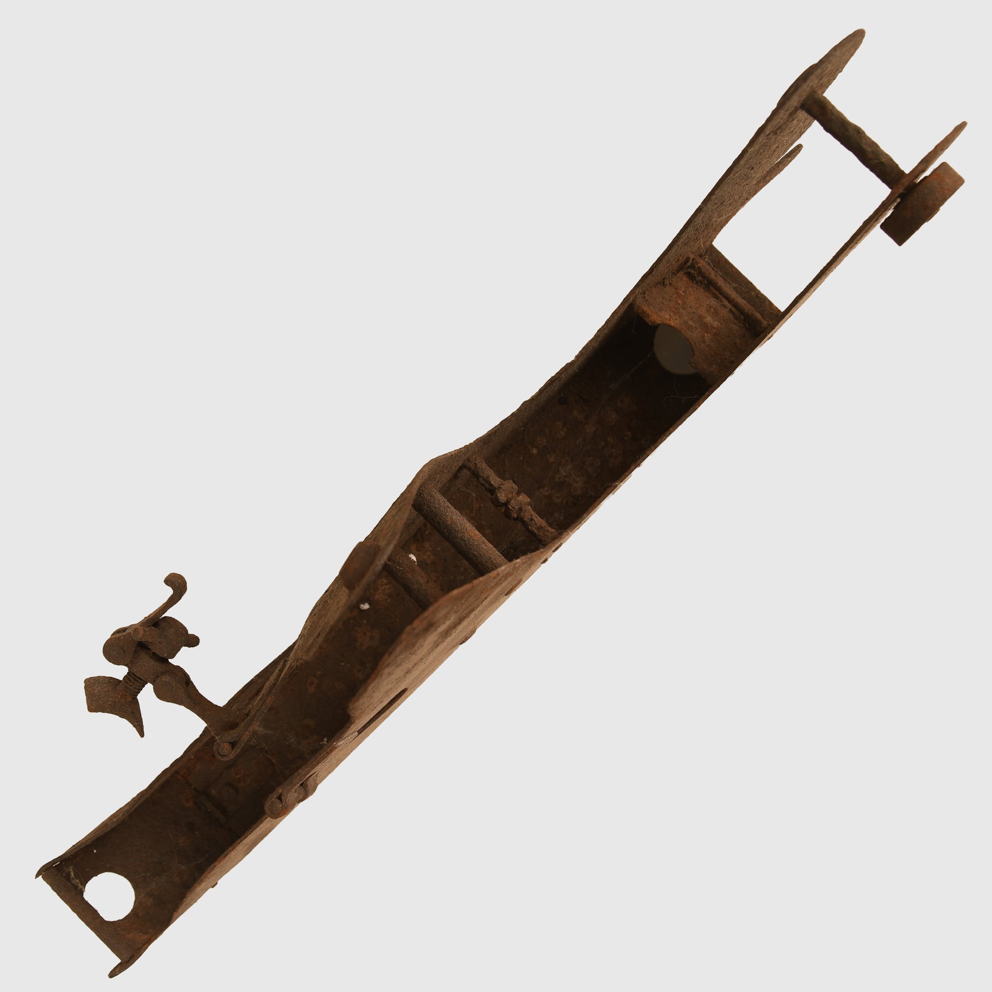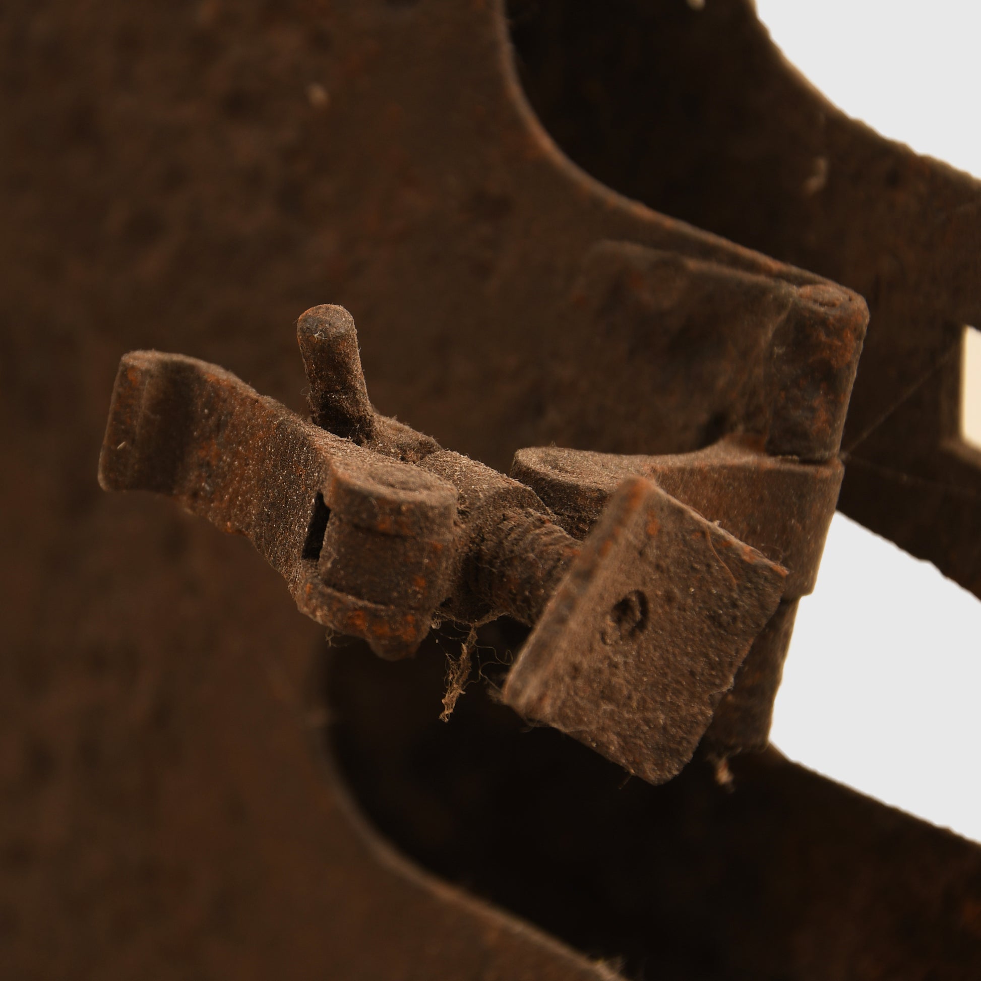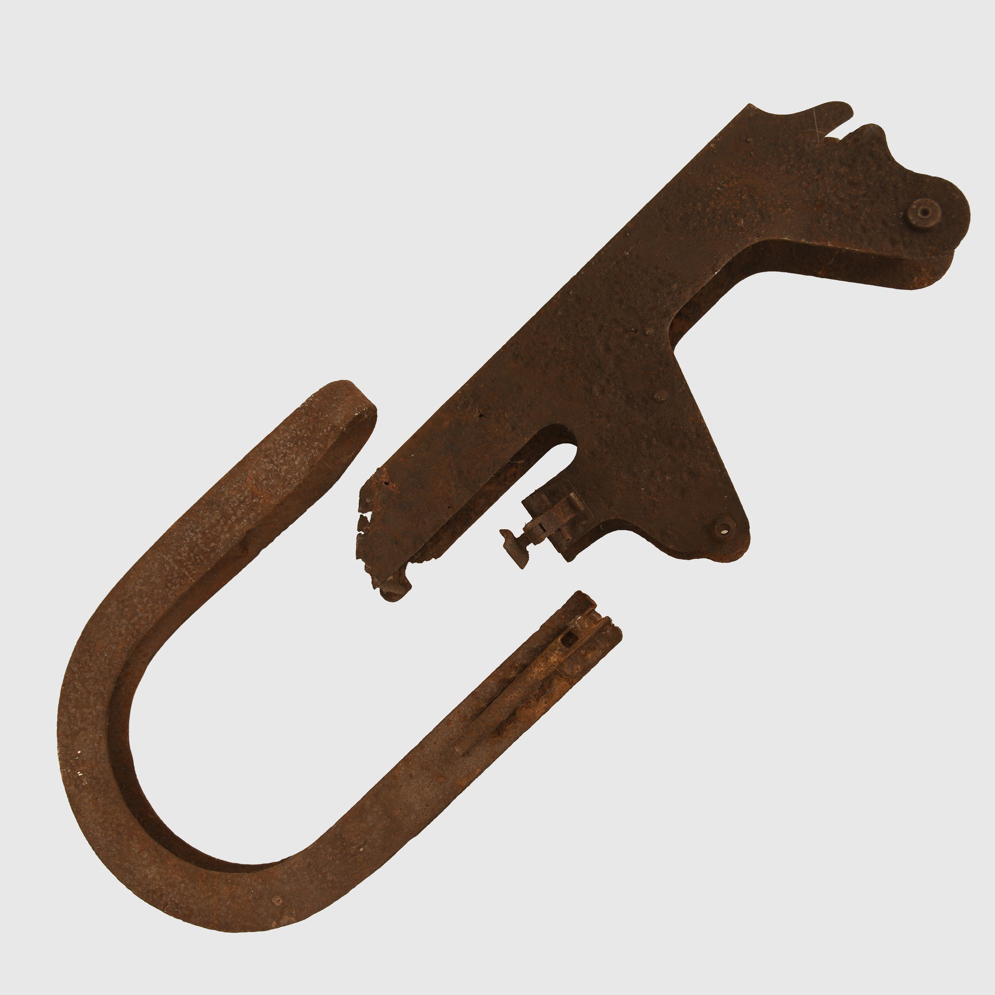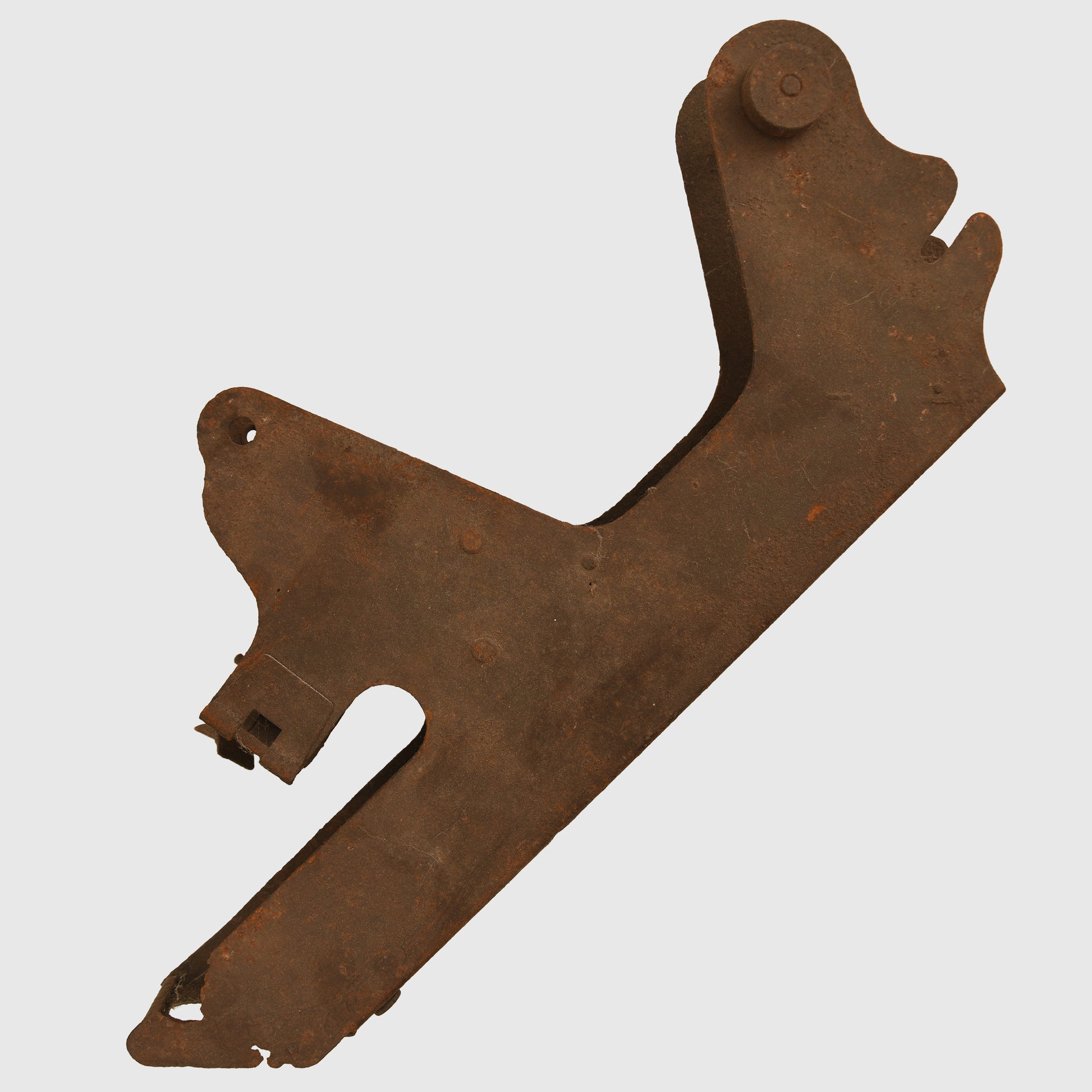 A rare ground-dug example of a GEW98 periscope mount. The main body remains in very good condition, showing surface corrosion on one side and slightly deeper corrosion on the opposite side from ground exposure. The closure fitting for securing the rifle butt is still functional. Minor corrosion is present on the upper section, but the piece is highly restorable and suitable for display. Accompanied by a horseshoe-shaped steel section, possibly associated with the mount, though its connection remains uncertain.
