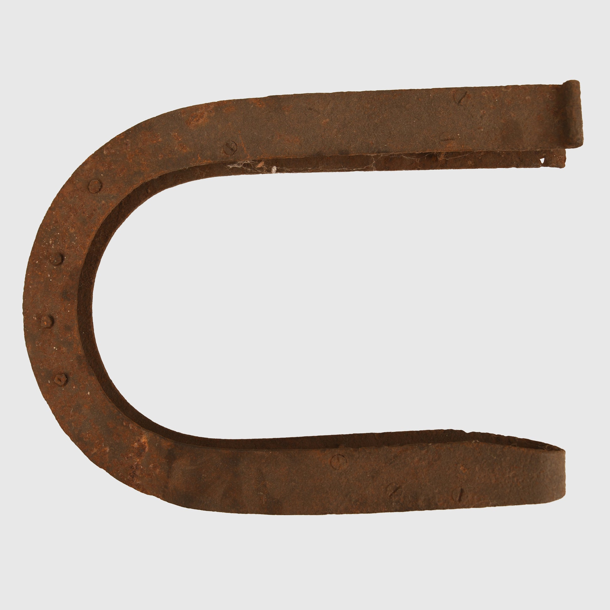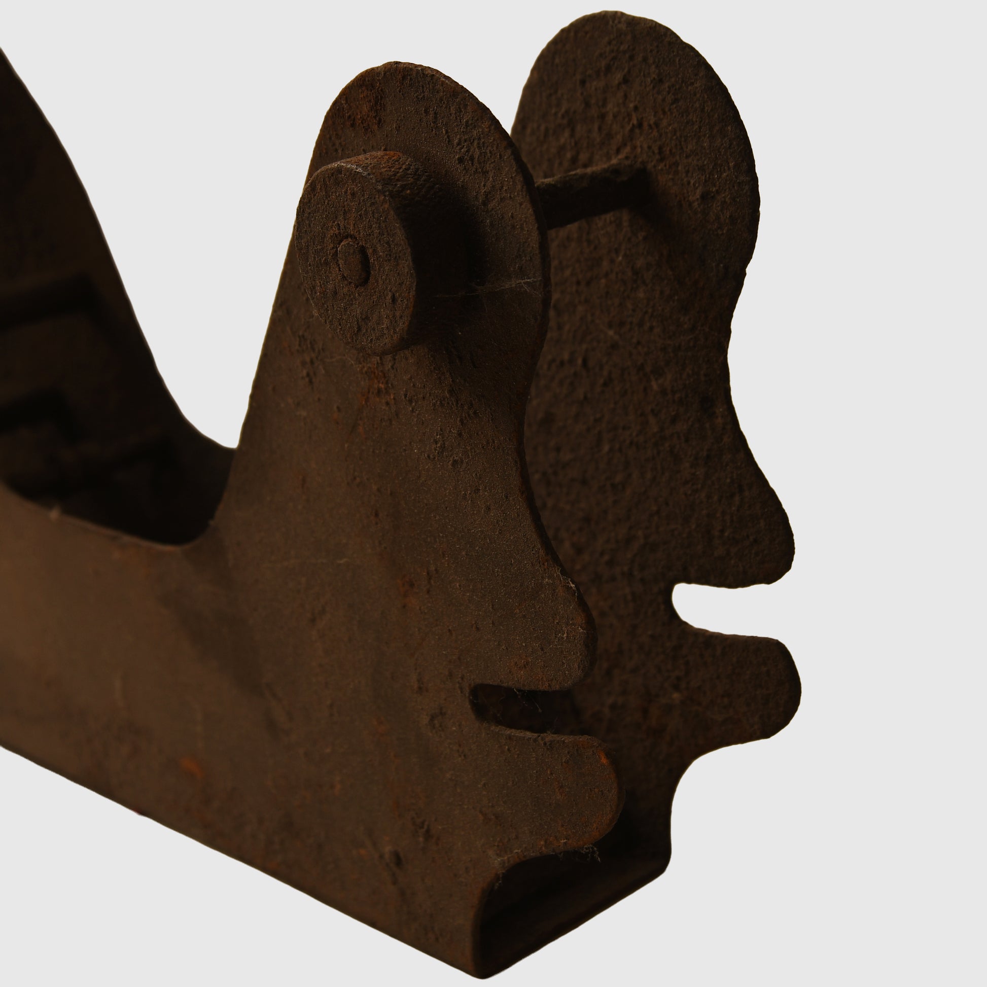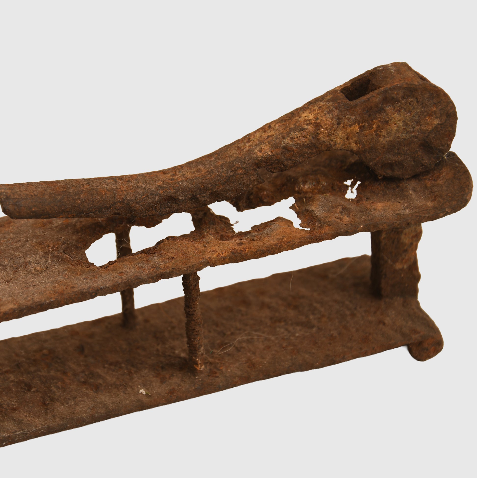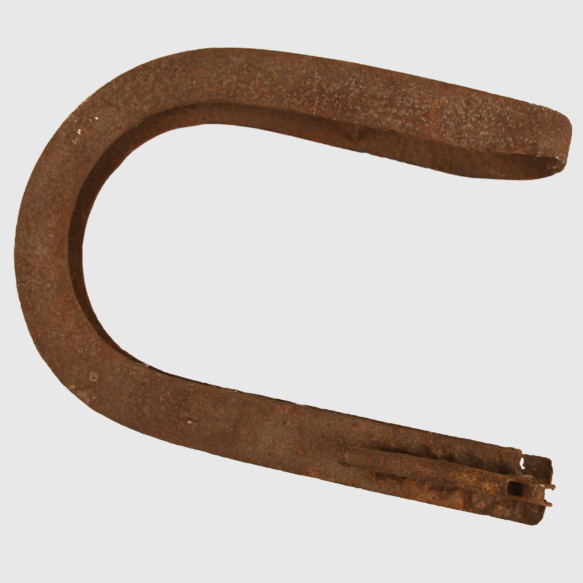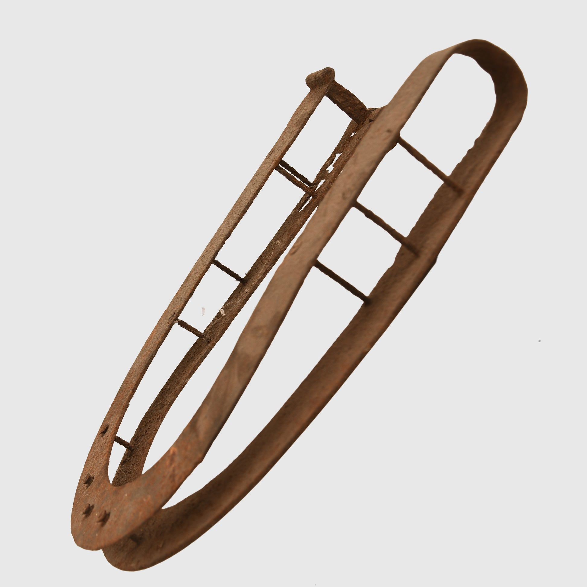A rare ground-dug example of a GEW98 periscope mount. The main body remains in very good condition, showing surface corrosion on one side and slightly deeper corrosion on the opposite side from ground exposure. The closure fitting for securing the rifle butt is still functional. Minor corrosion is present on the upper section, but the piece is highly restorable and suitable for display. Accompanied by a horseshoe-shaped steel section, possibly associated with the mount, though its connection remains uncertain.