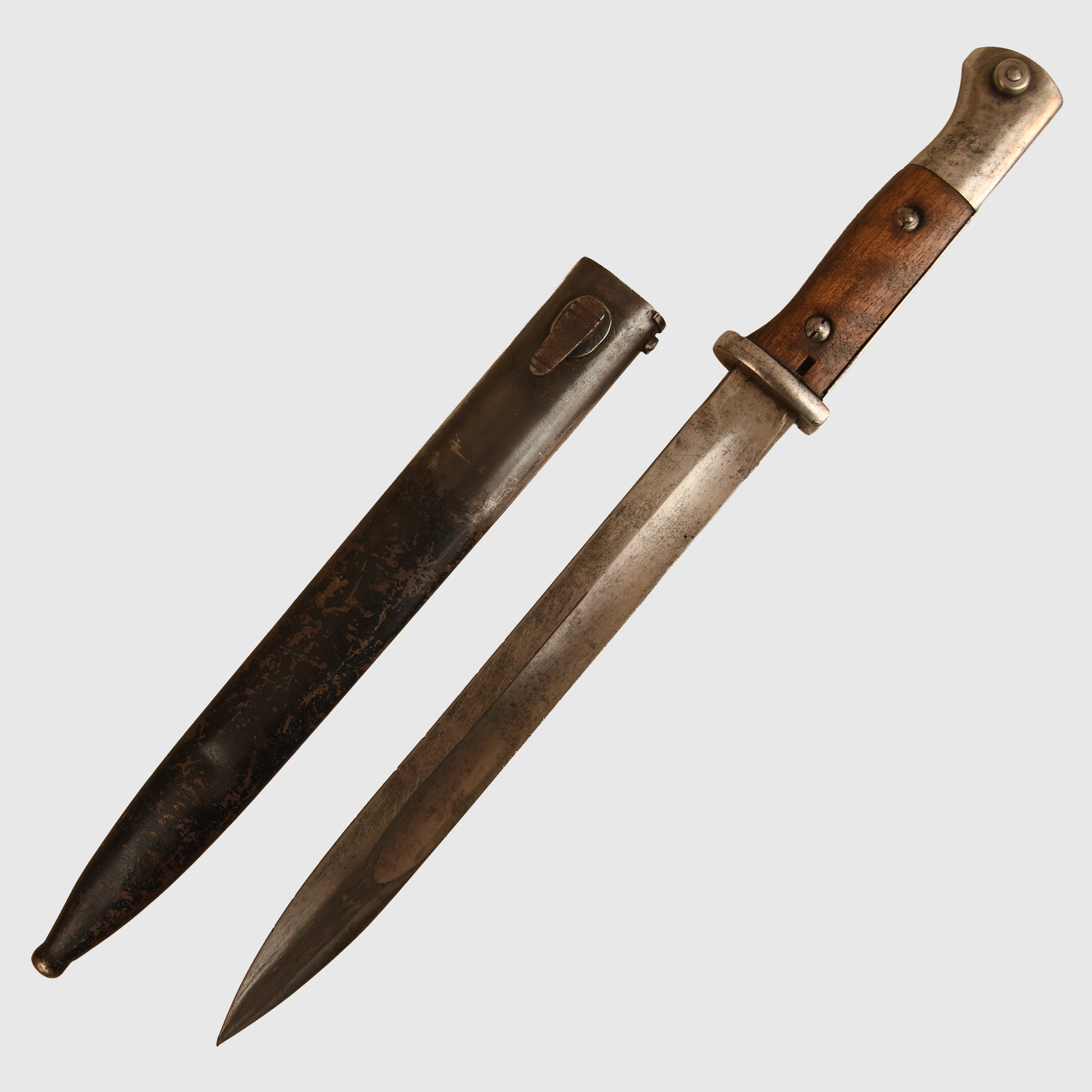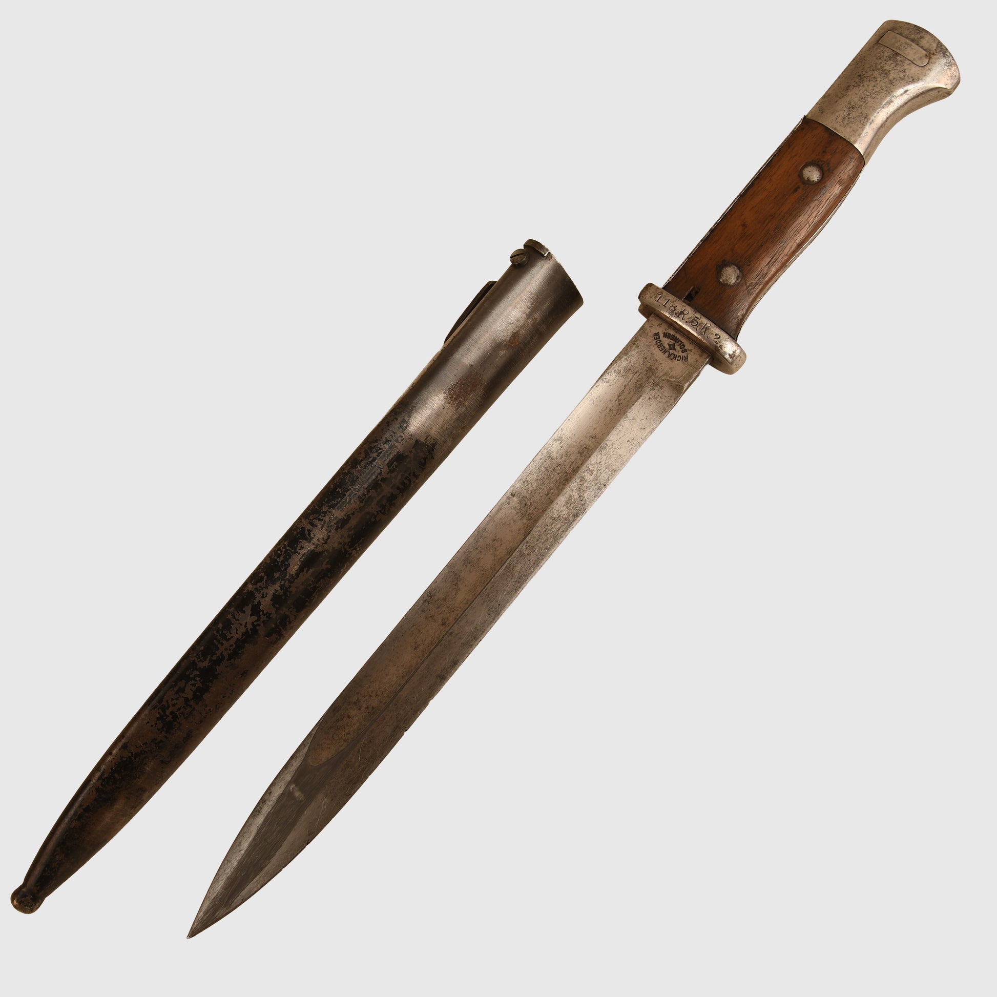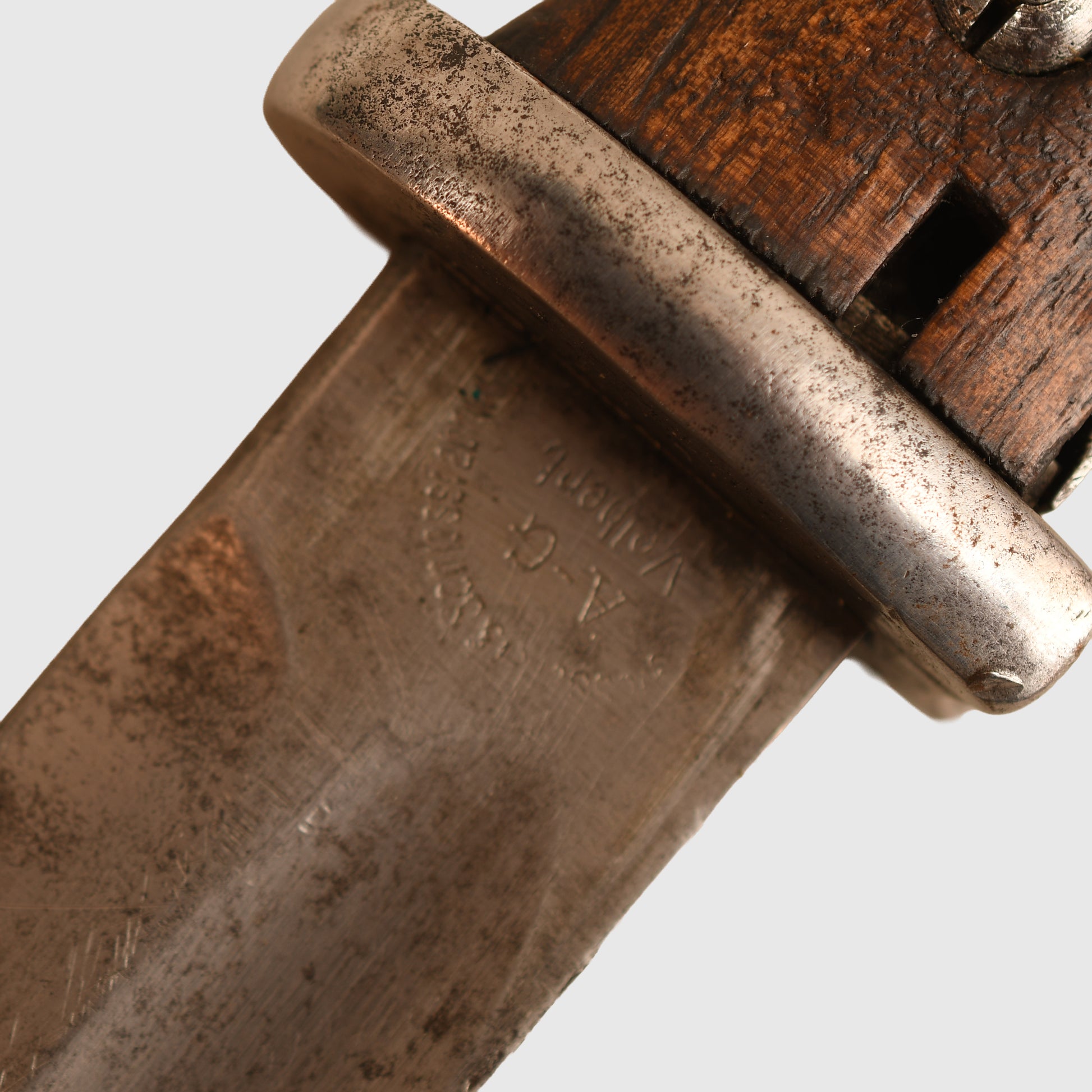 A well-preserved K98 display piece, manufactured by Richard Herder of Solingen. It bears the Imperial acceptance stamp to the flat back, along with regimental markings ‘118.R.5.K.2’. The piece shows only very slight sharpening marks and retains its undamaged wood grips. The upper pommel has a faint acceptance stamp, and the rifle retaining button functions correctly.
