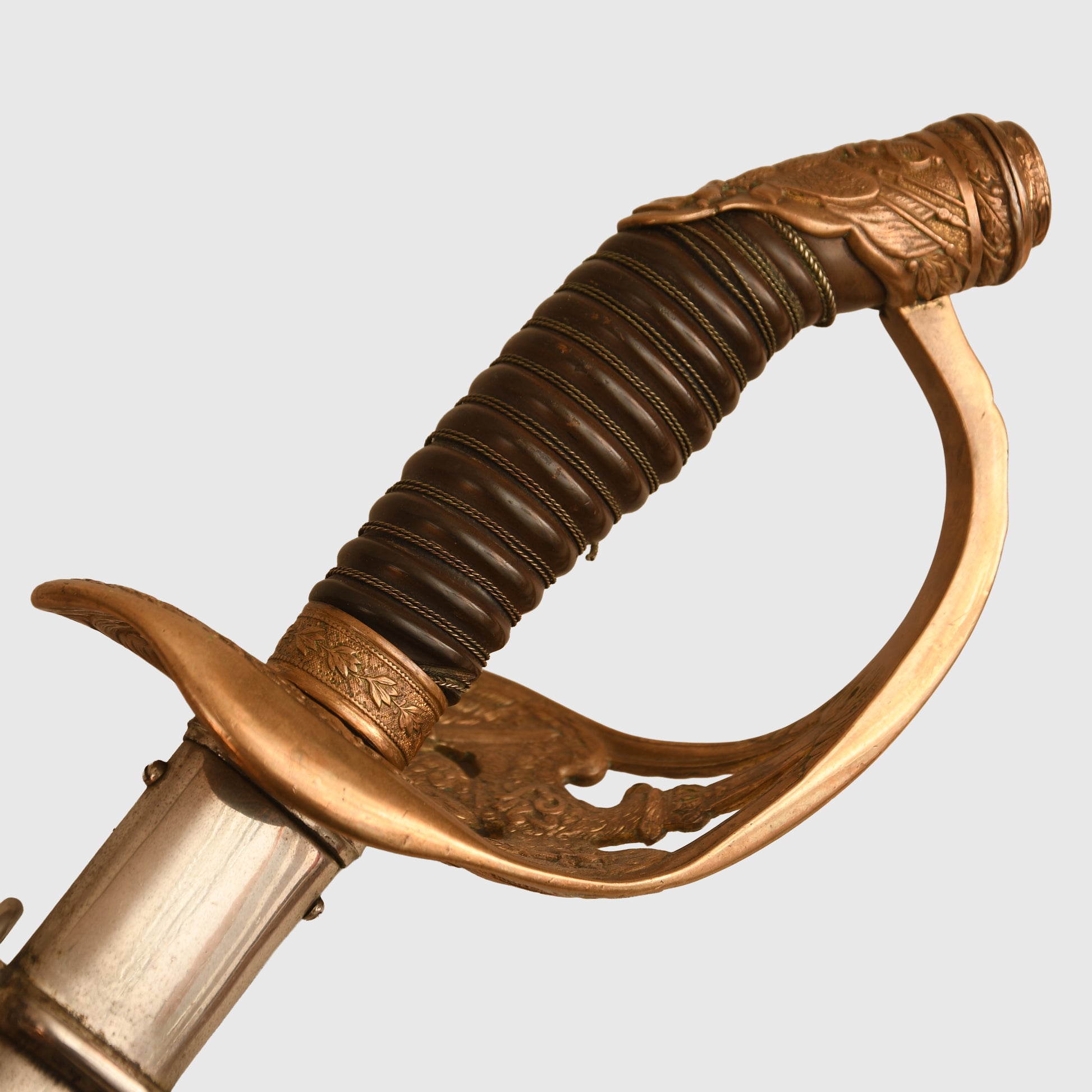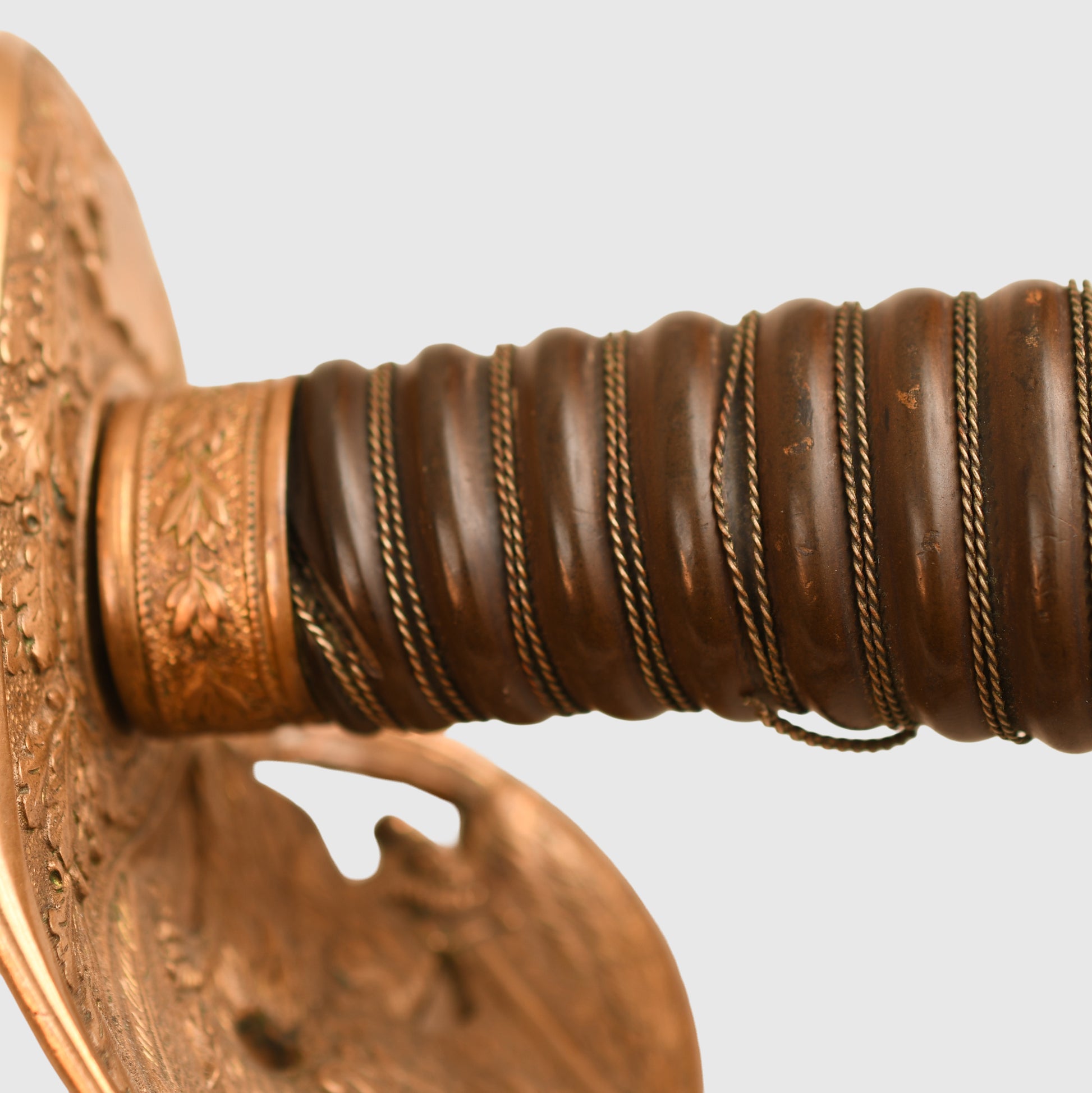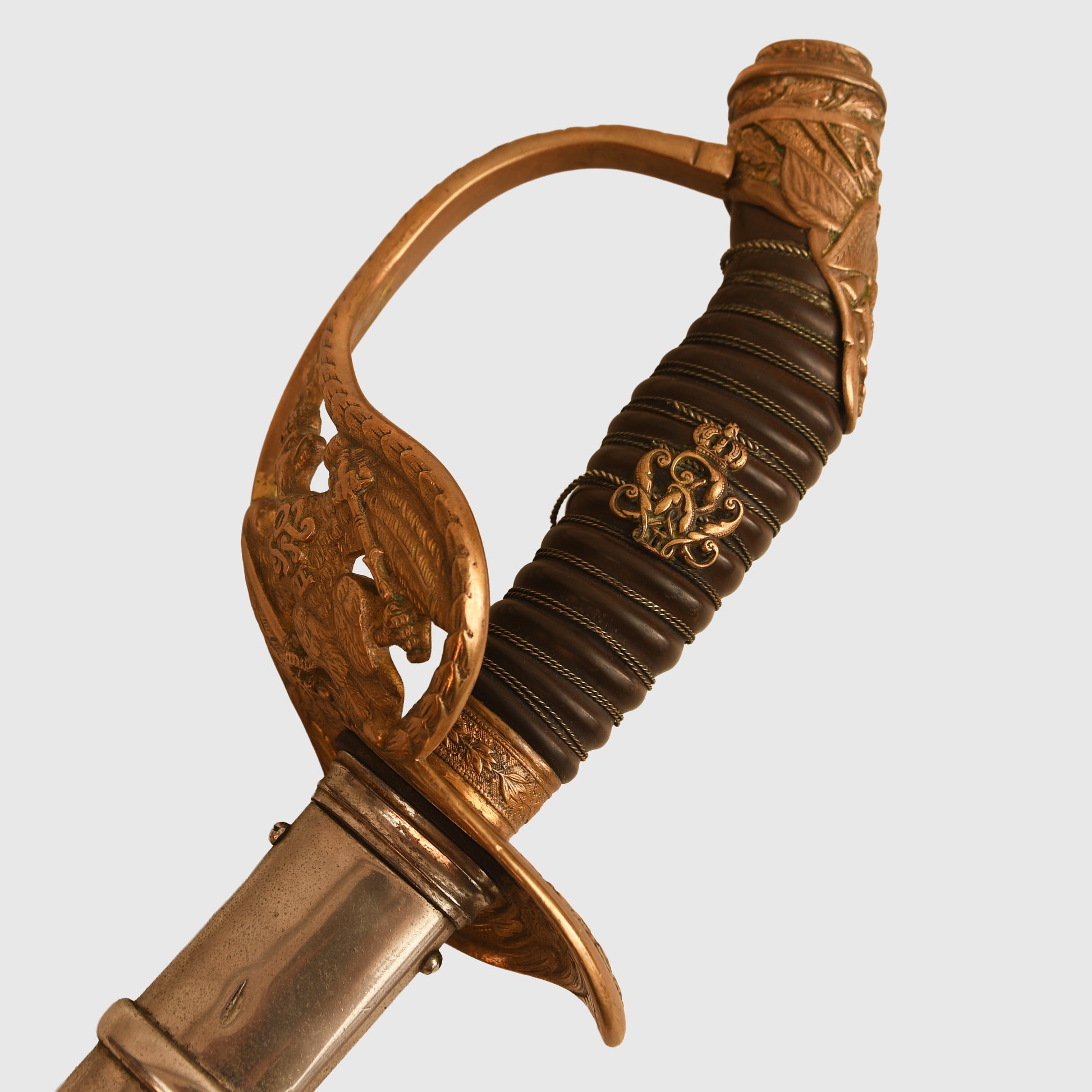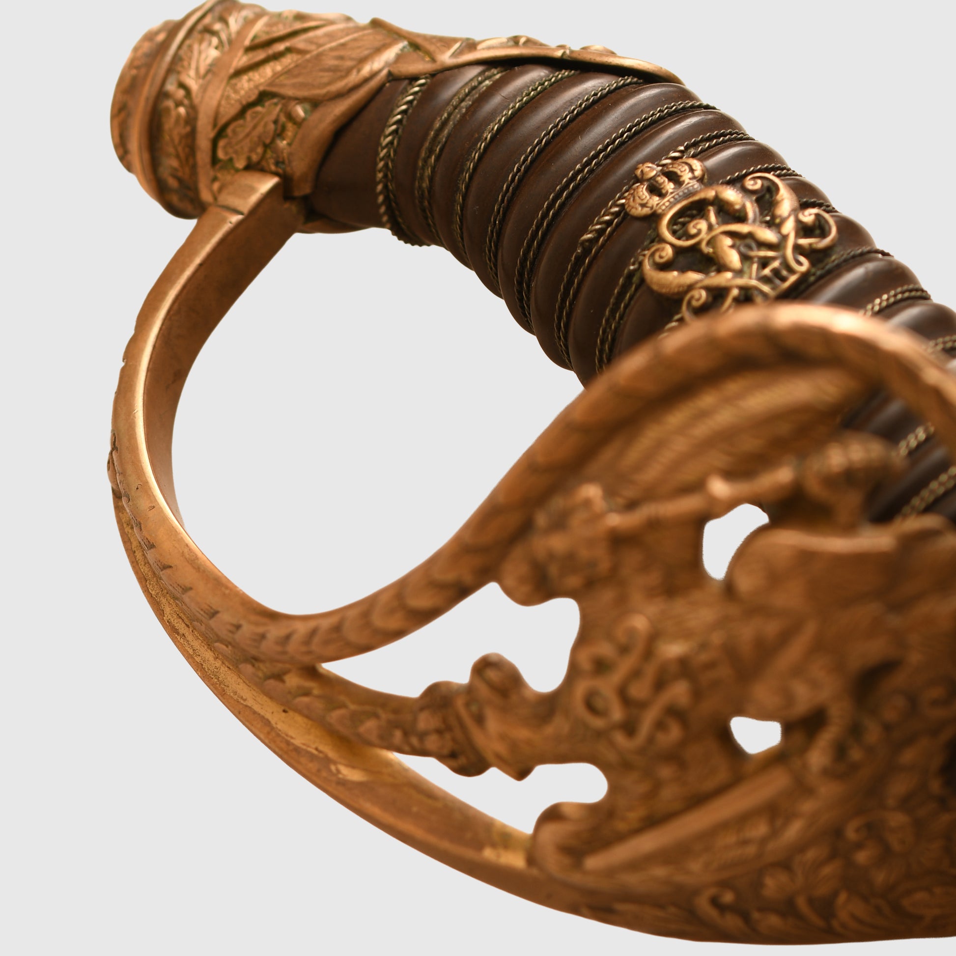 An exceptional and highly detailed example of the 1889 pattern infantry officer’s presentation piece. The hilt features intricate detailing beyond the standard pattern, including a finely rendered Prussian eagle, stands of arms and flags, and floriated motifs mirrored on both sides of the bowl. The composition grip is undamaged, with slightly loose wire and FWR motifs still in place.