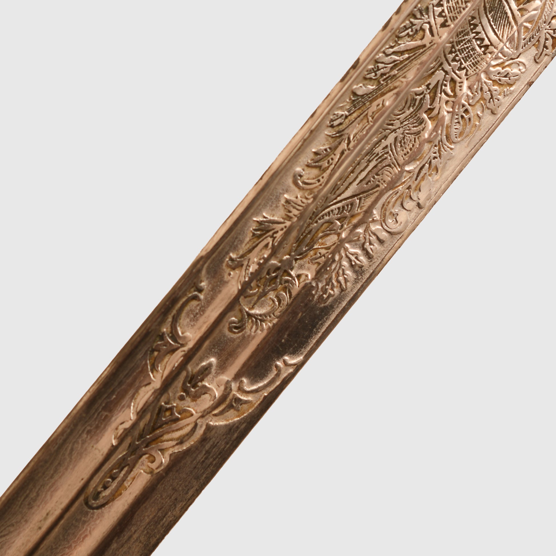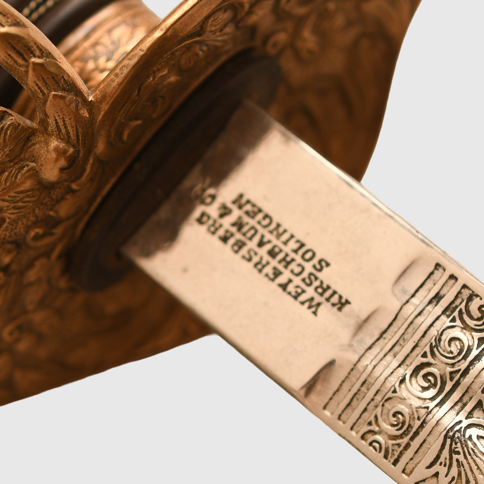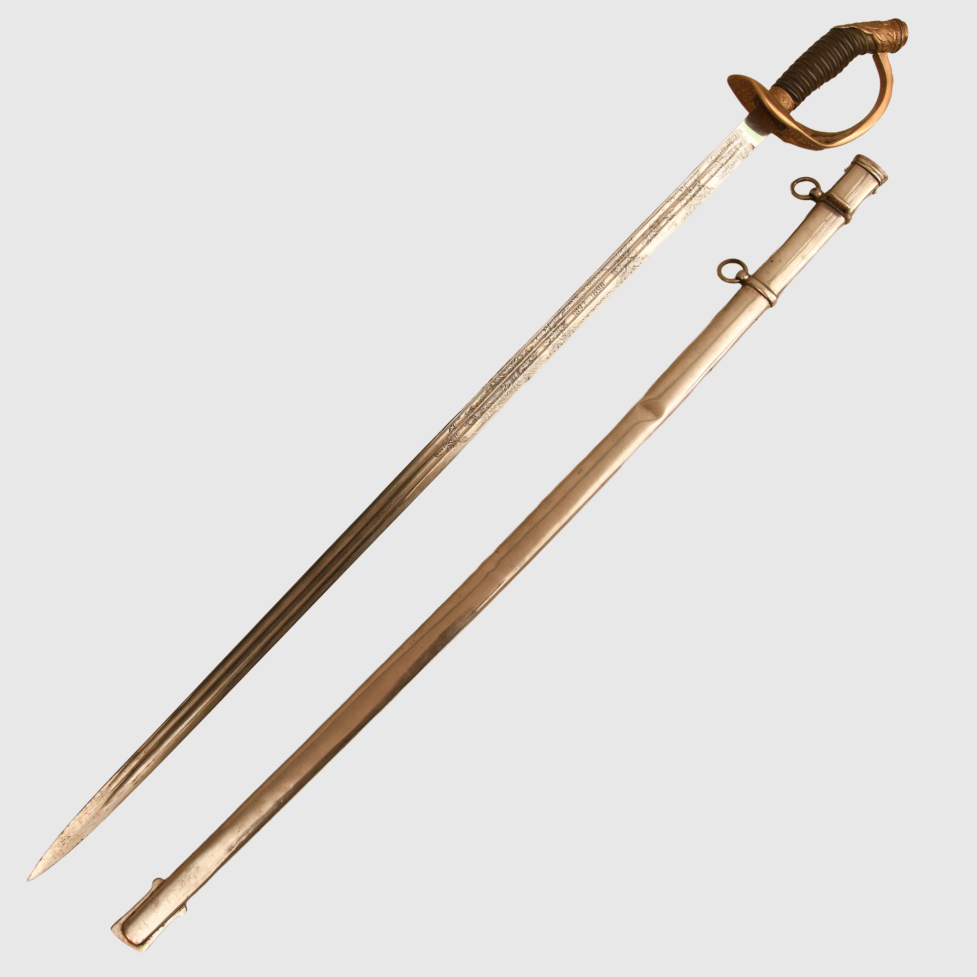 An exceptional and highly detailed example of the 1889 pattern infantry officer’s presentation piece. The hilt features intricate detailing beyond the standard pattern, including a finely rendered Prussian eagle, stands of arms and flags, and floriated motifs mirrored on both sides of the bowl. The composition grip is undamaged, with slightly loose wire and FWR motifs still in place.