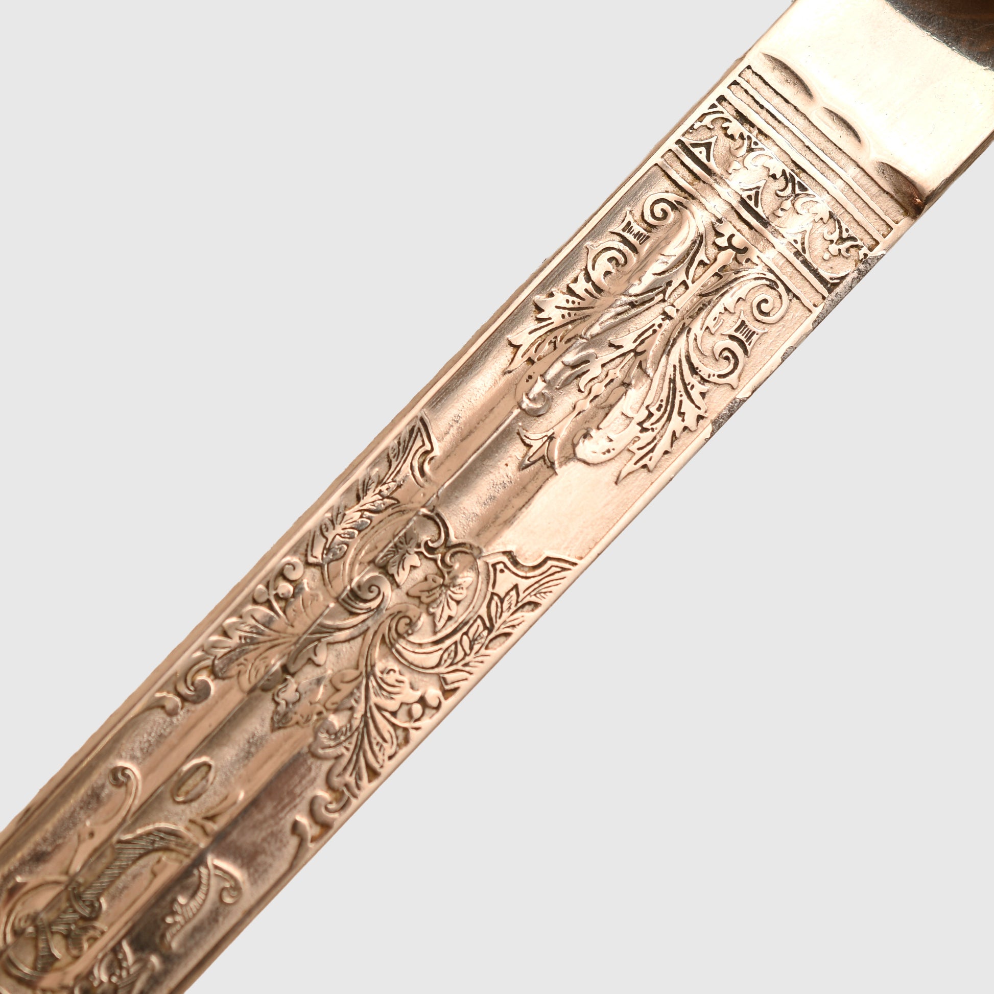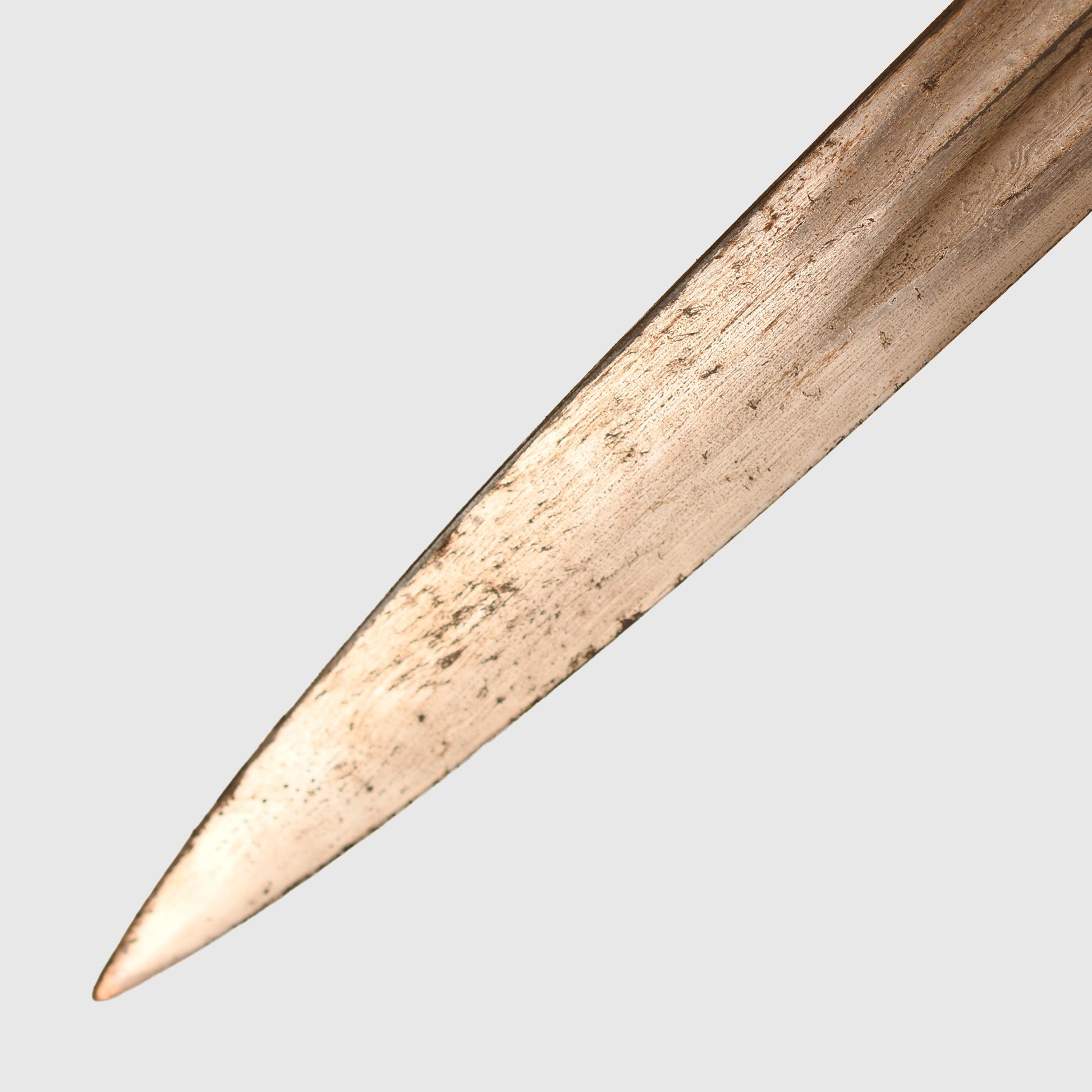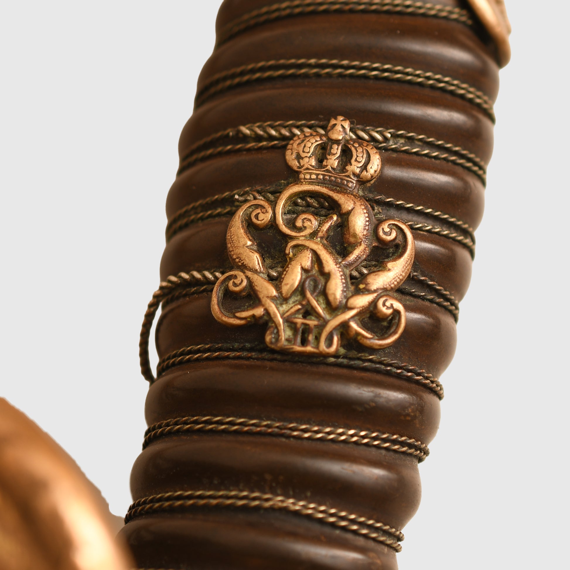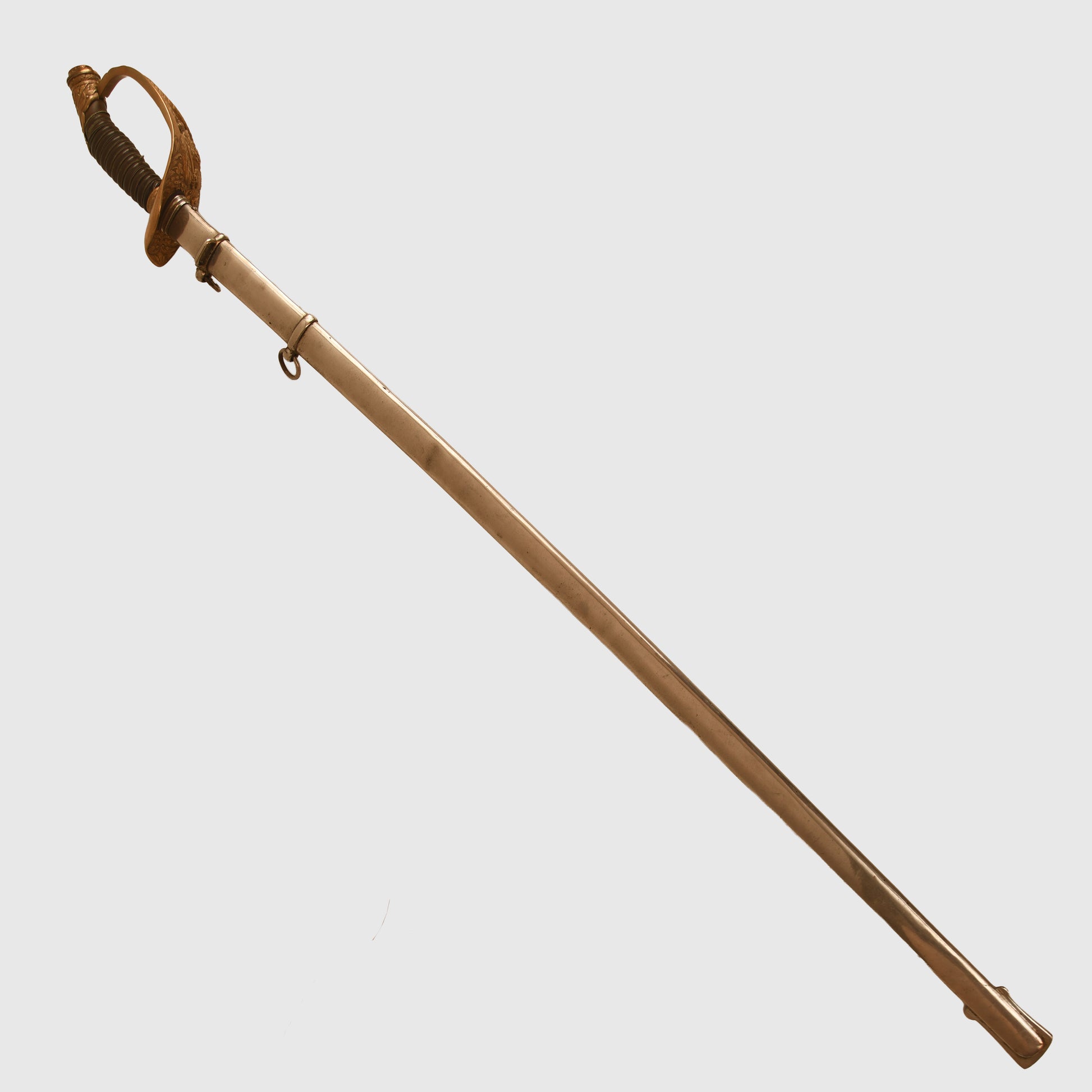 An exceptional and highly detailed example of the 1889 pattern infantry officer’s presentation piece. The hilt features intricate detailing beyond the standard pattern, including a finely rendered Prussian eagle, stands of arms and flags, and floriated motifs mirrored on both sides of the bowl. The composition grip is undamaged, with slightly loose wire and FWR motifs still in place.
