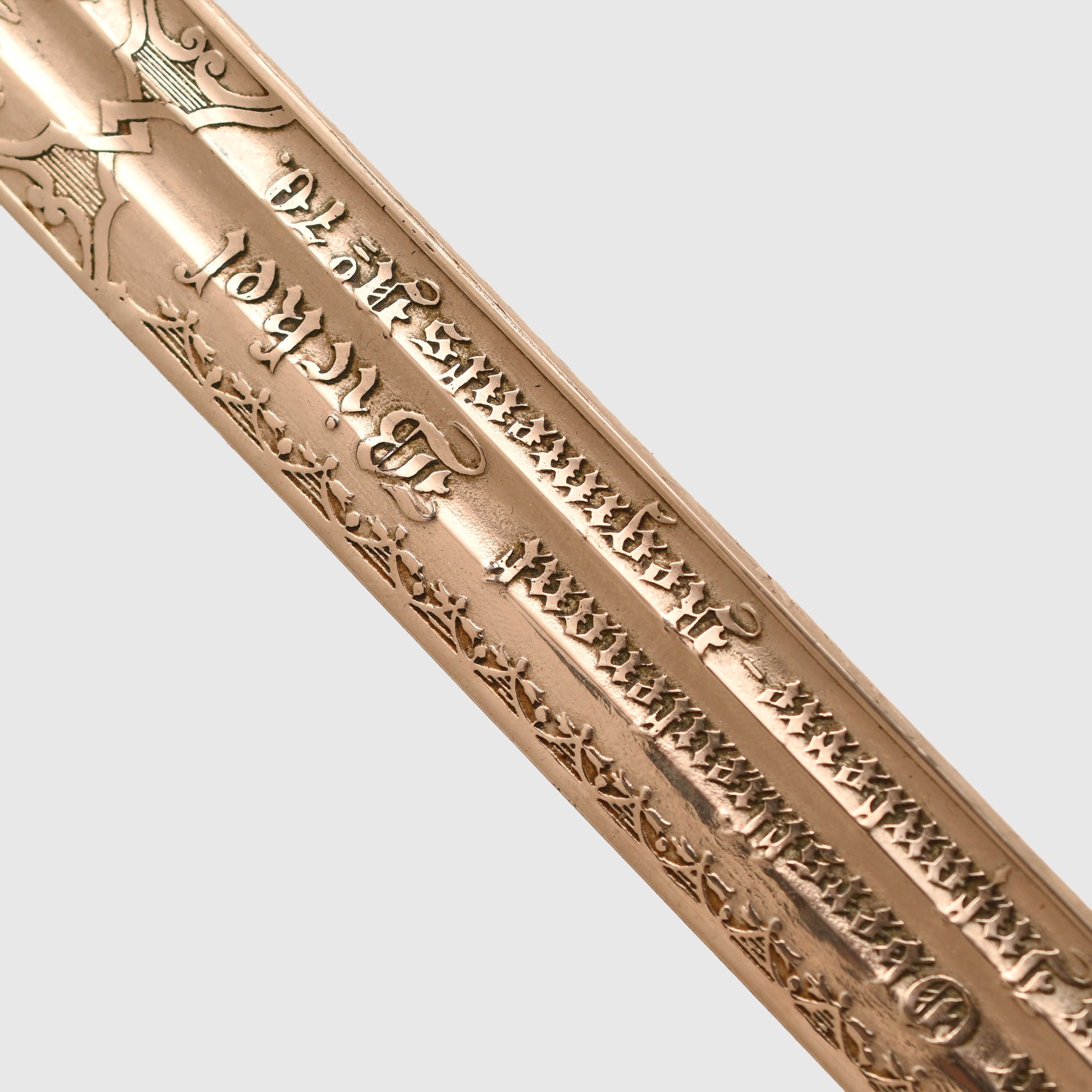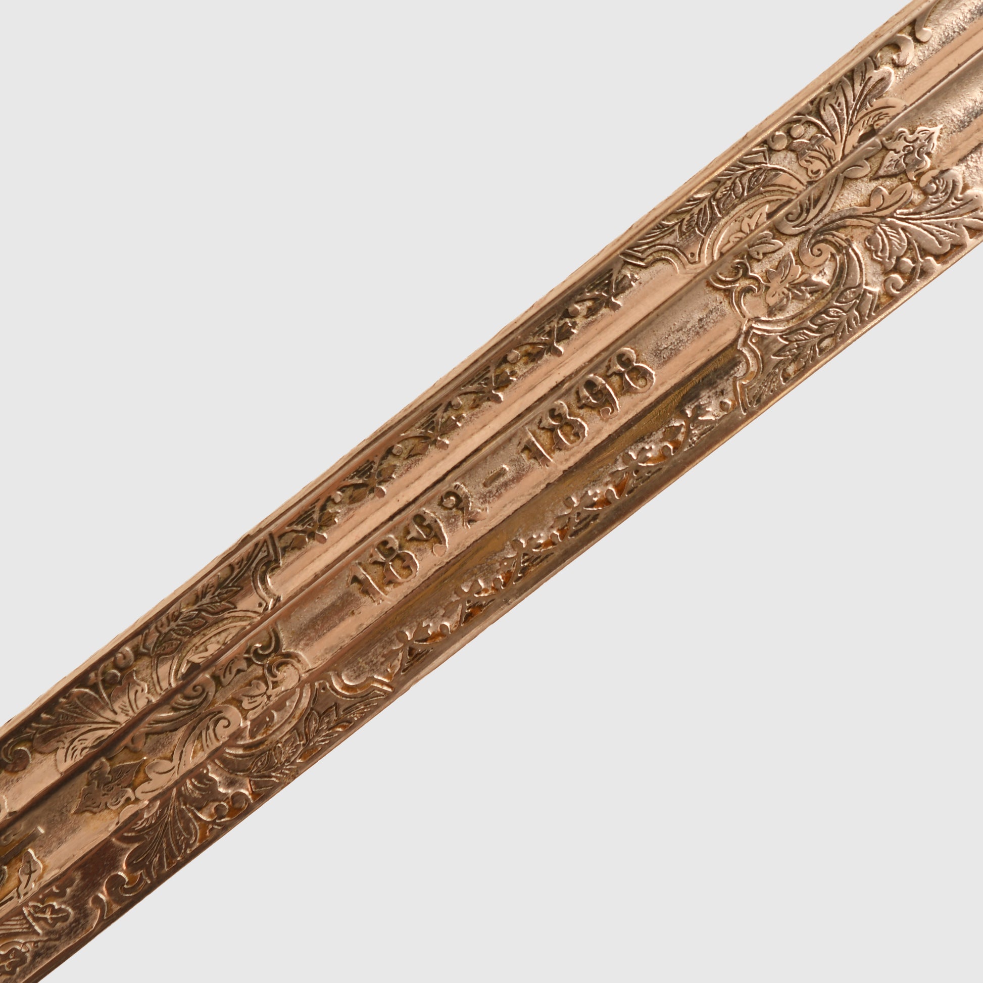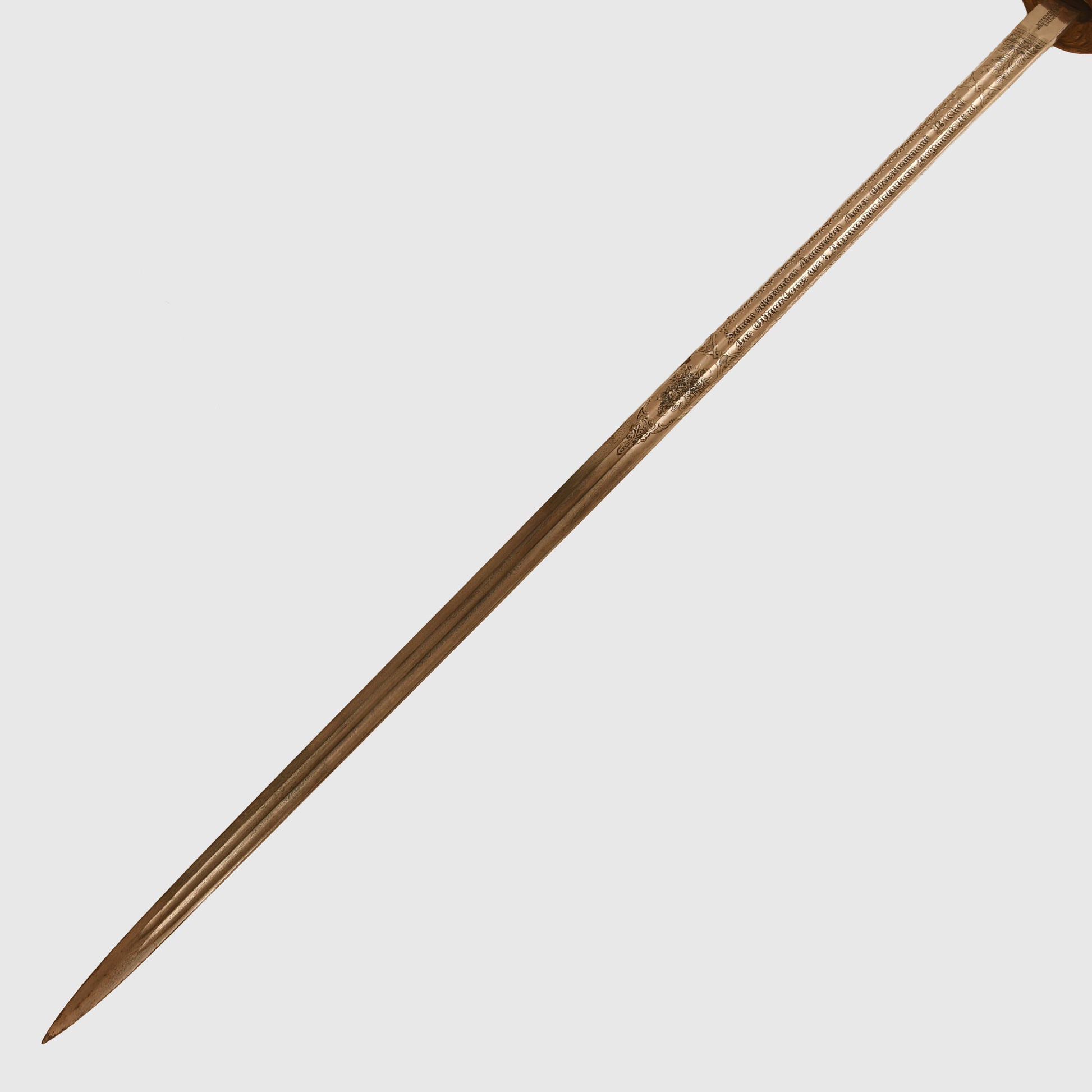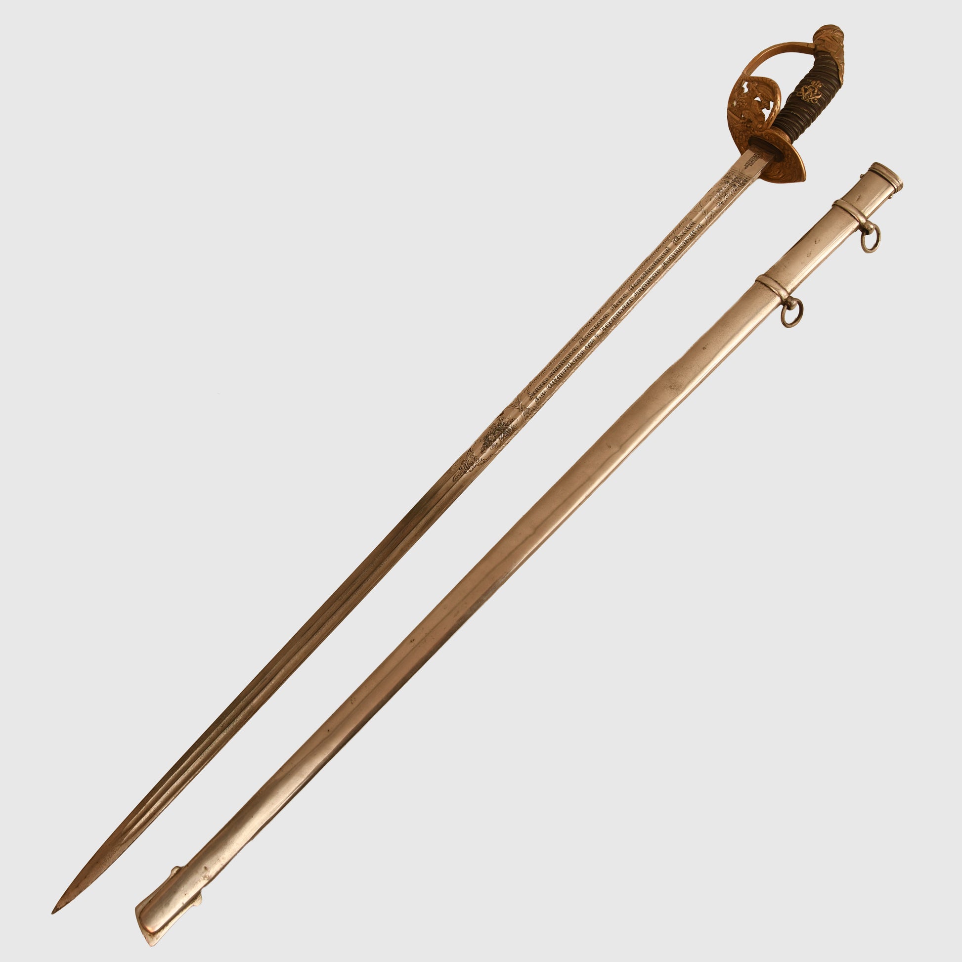 The long, double-fullered piece by Weyersberg Kirschbaum & Co., Solingen, features a beautiful double-line presentation inscription: “This sword presented to our retiring comrade Herr Oberstleutnant Bickel from the Officer Korps of the 8th Rhenish Infantry Regiment No.70.” The reverse bears a scroll inscribed “1892 to 1898” with stands of arms and the regimental insignia of Infantry Regiment No.70, along with visible Damascus-style patterns. The nickel-finished scabbard remains in good condition, showing only one small indentation below the second hanging ring, and is complete with its throat, fittings, and twin suspension rings. The flat back strap is inscribed with the name of the Berlin retailer.