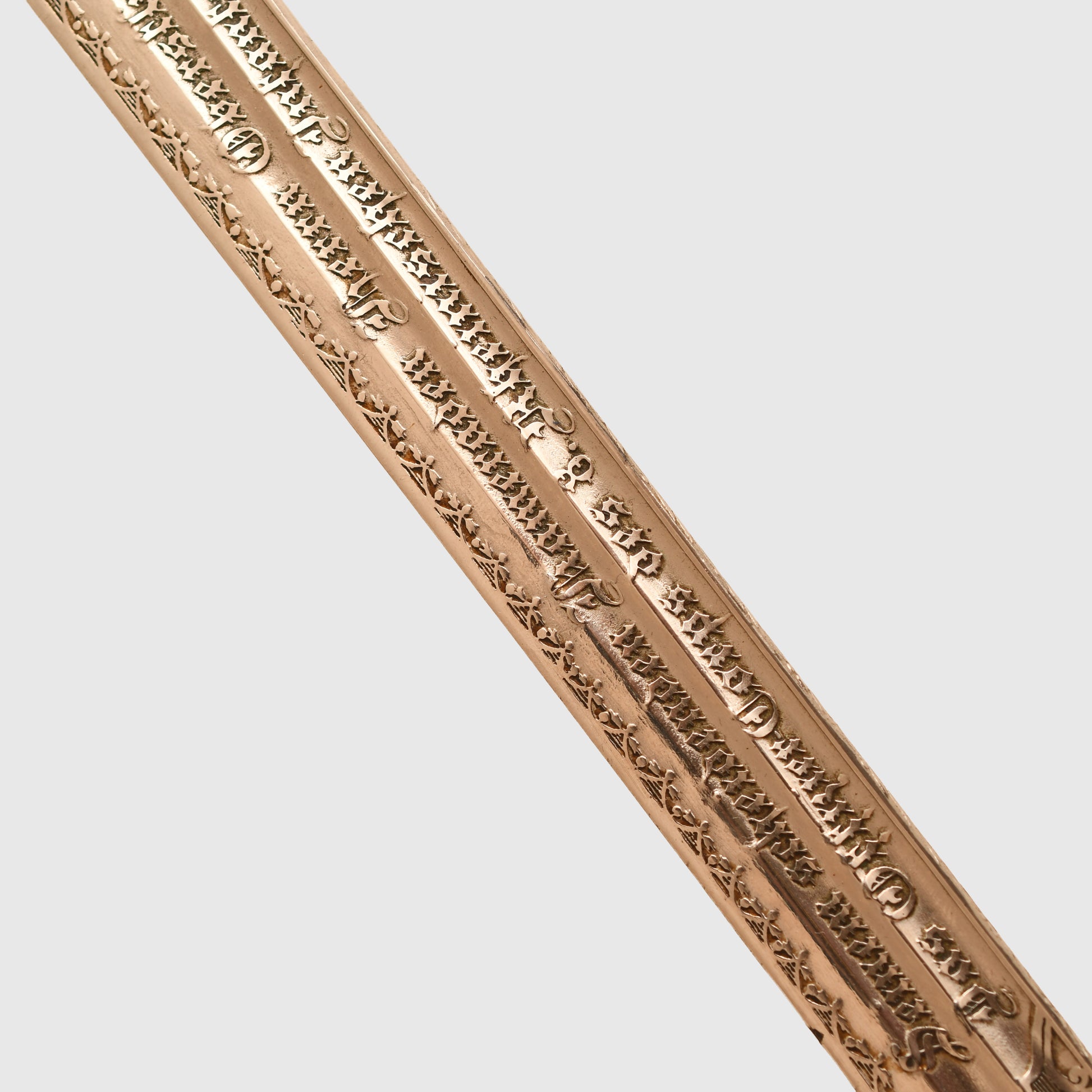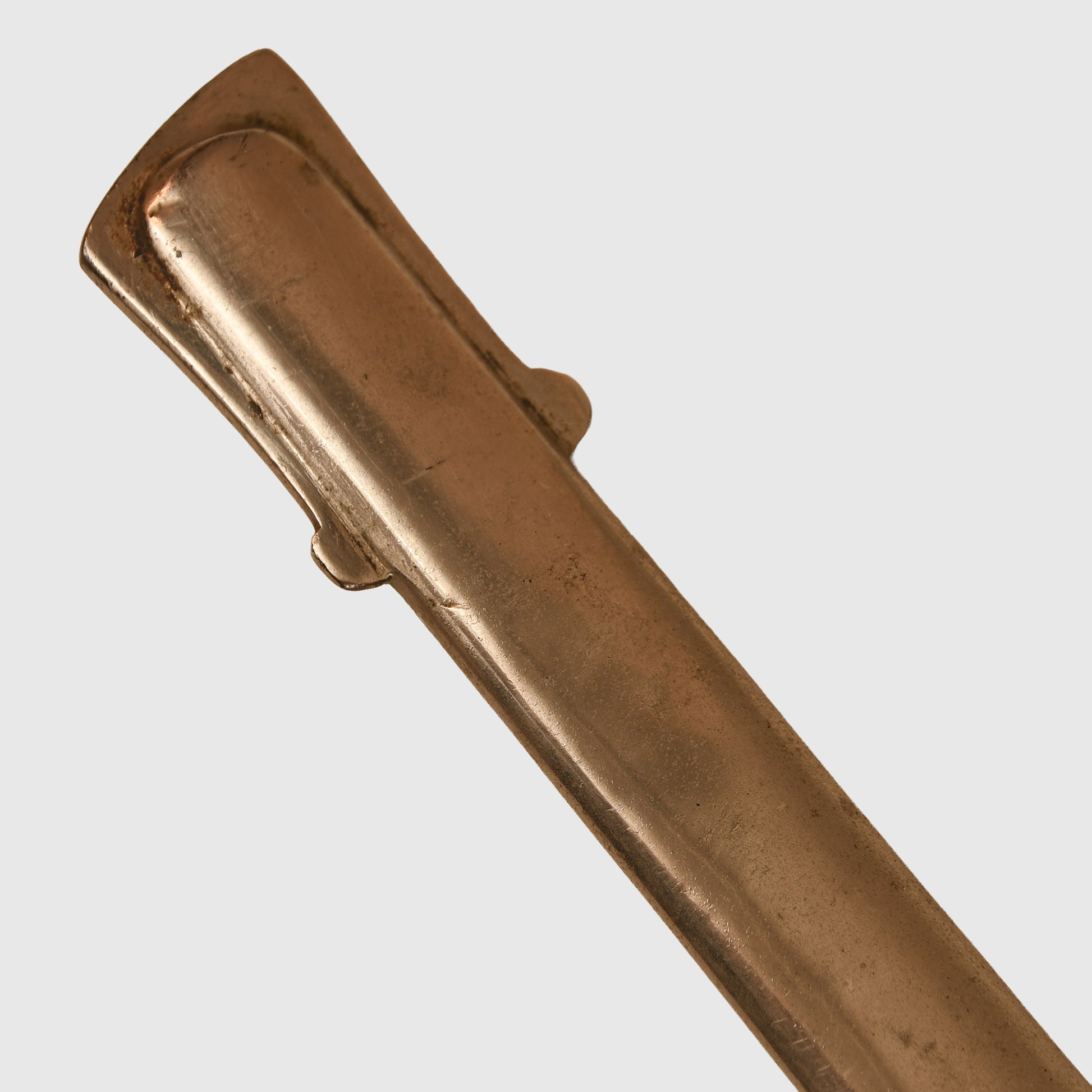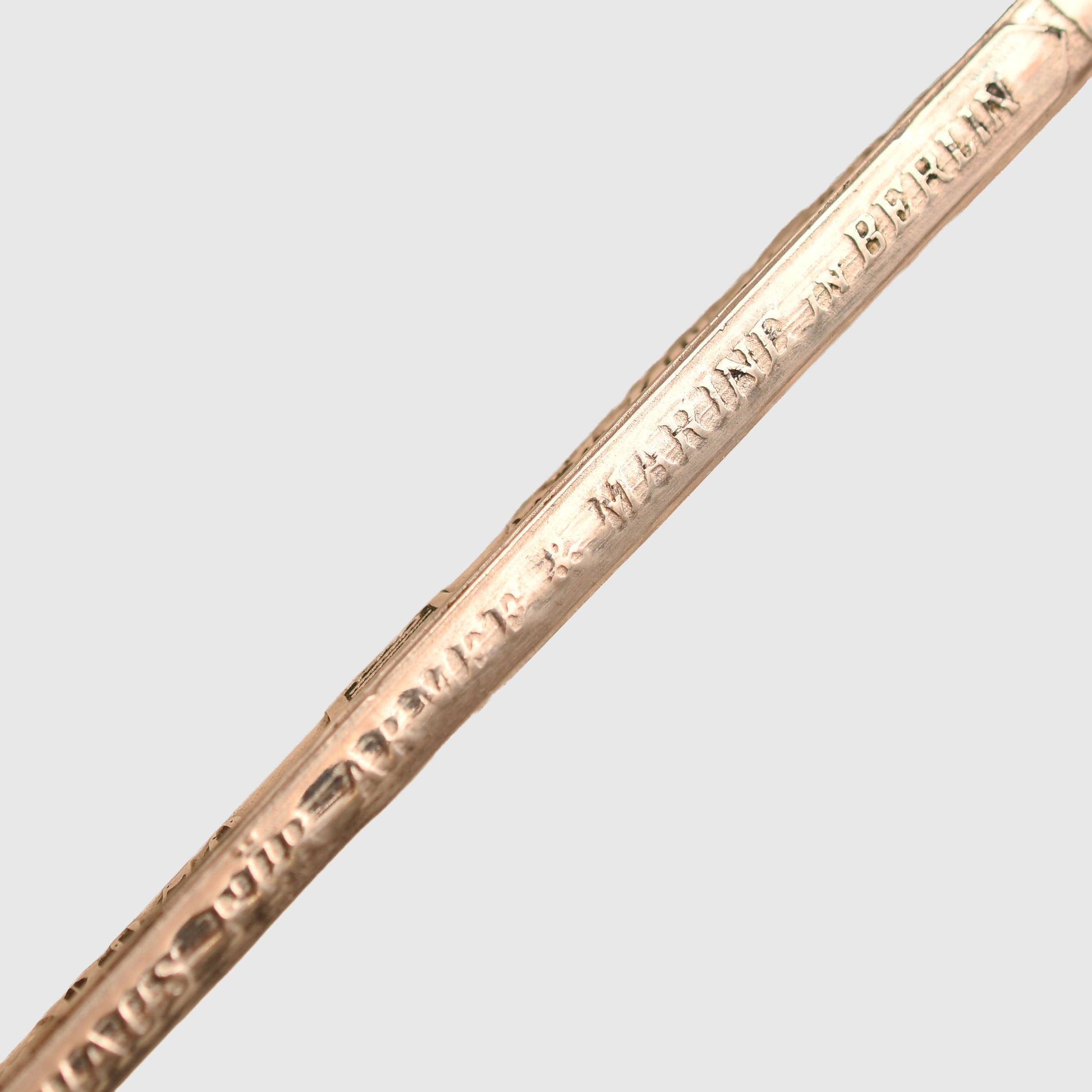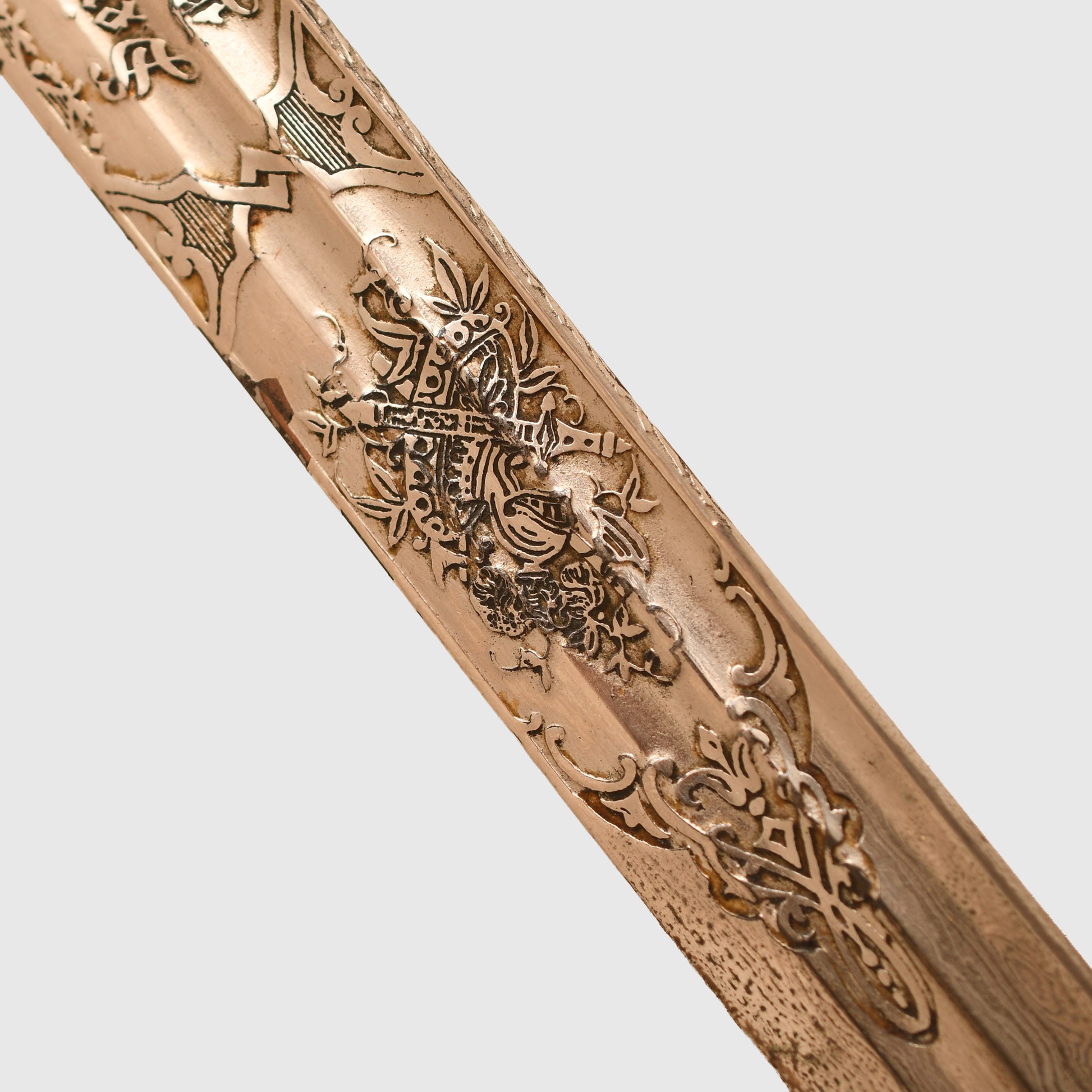 The long, double-fullered piece by Weyersberg Kirschbaum & Co., Solingen, features a beautiful double-line presentation inscription: “This sword presented to our retiring comrade Herr Oberstleutnant Bickel from the Officer Korps of the 8th Rhenish Infantry Regiment No.70.” The reverse bears a scroll inscribed “1892 to 1898” with stands of arms and the regimental insignia of Infantry Regiment No.70, along with visible Damascus-style patterns. The nickel-finished scabbard remains in good condition, showing only one small indentation below the second hanging ring, and is complete with its throat, fittings, and twin suspension rings. The flat back strap is inscribed with the name of the Berlin retailer.