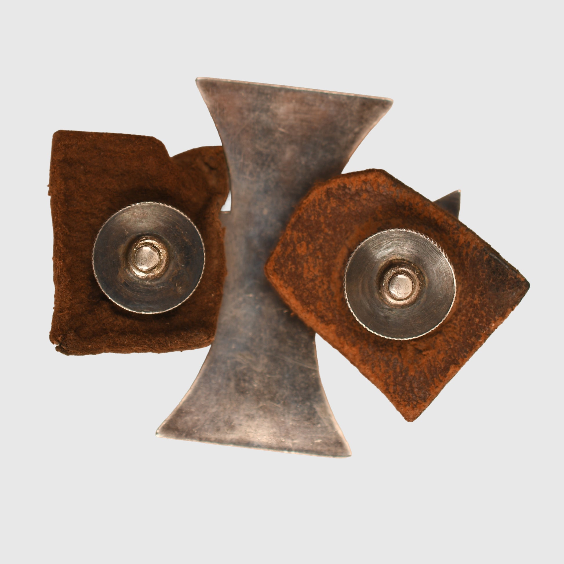 The reverse of the cross retains its unusual threaded disc fixings, accompanied by two protective leather pads. This specific method of attachment was favoured by Imperial German aviation personnel, as the screw-back system provided a more secure and permanent fixing when attached to heavy leather flying jackets or tunics, preventing the award from becoming detached during flight operations.