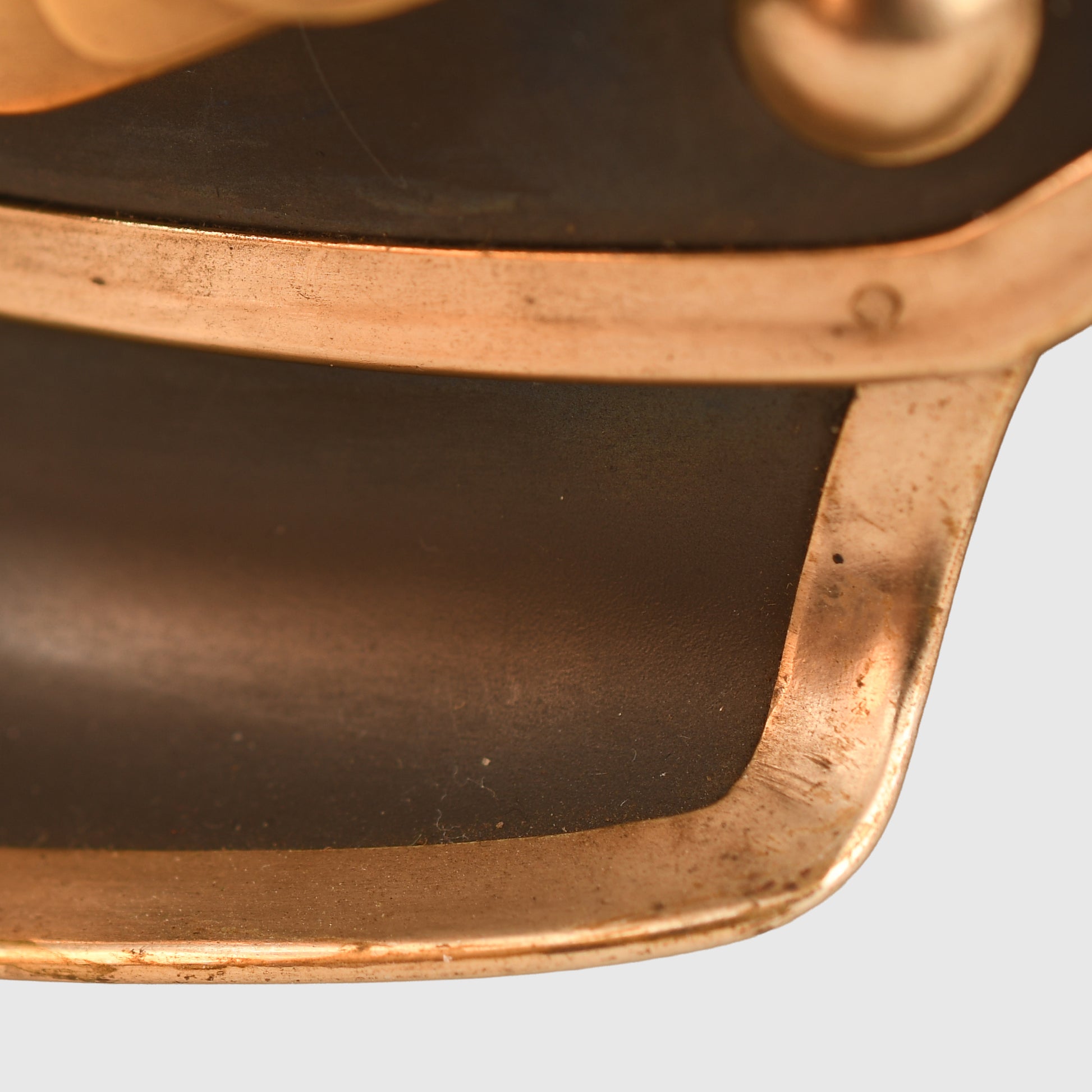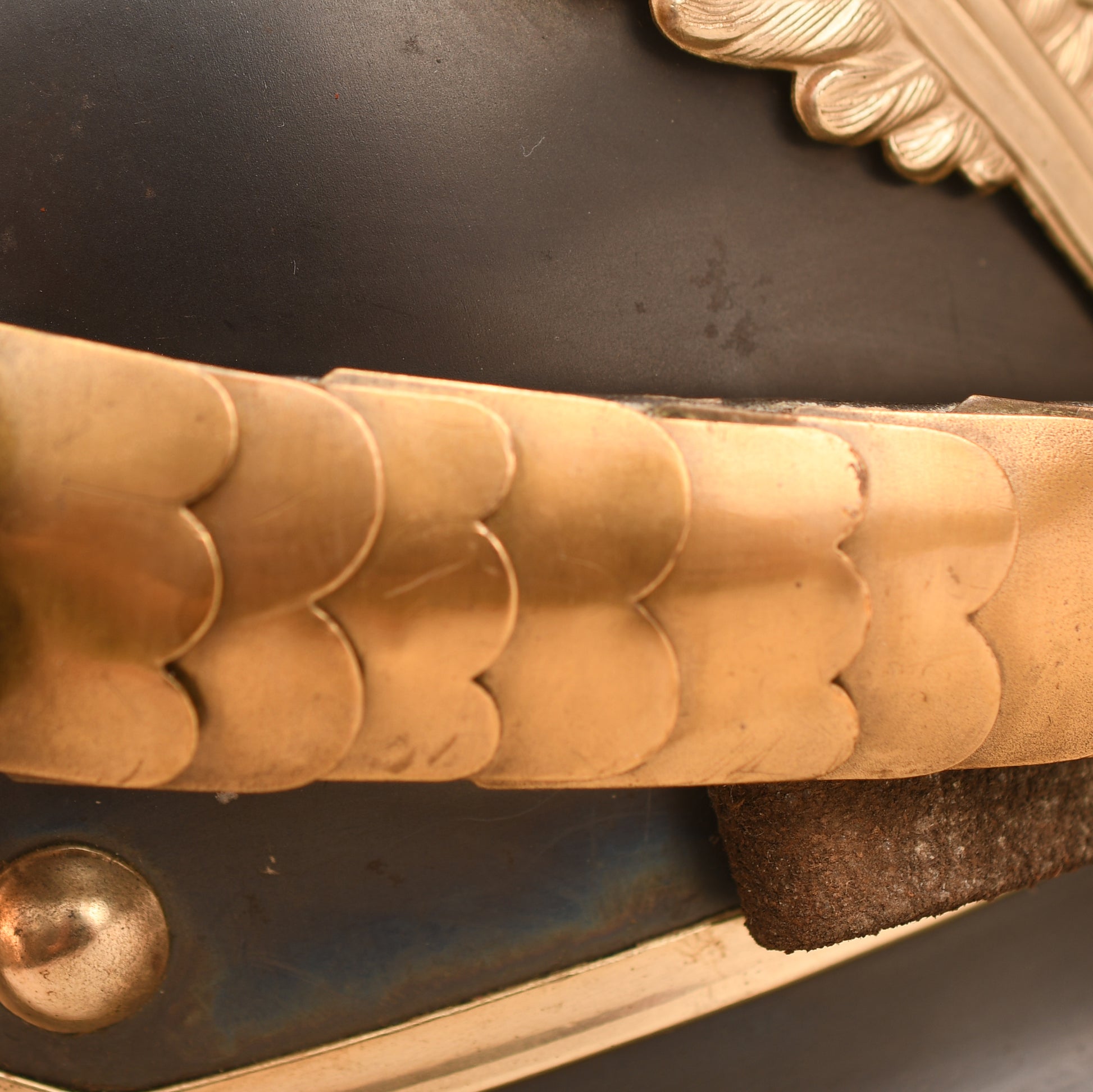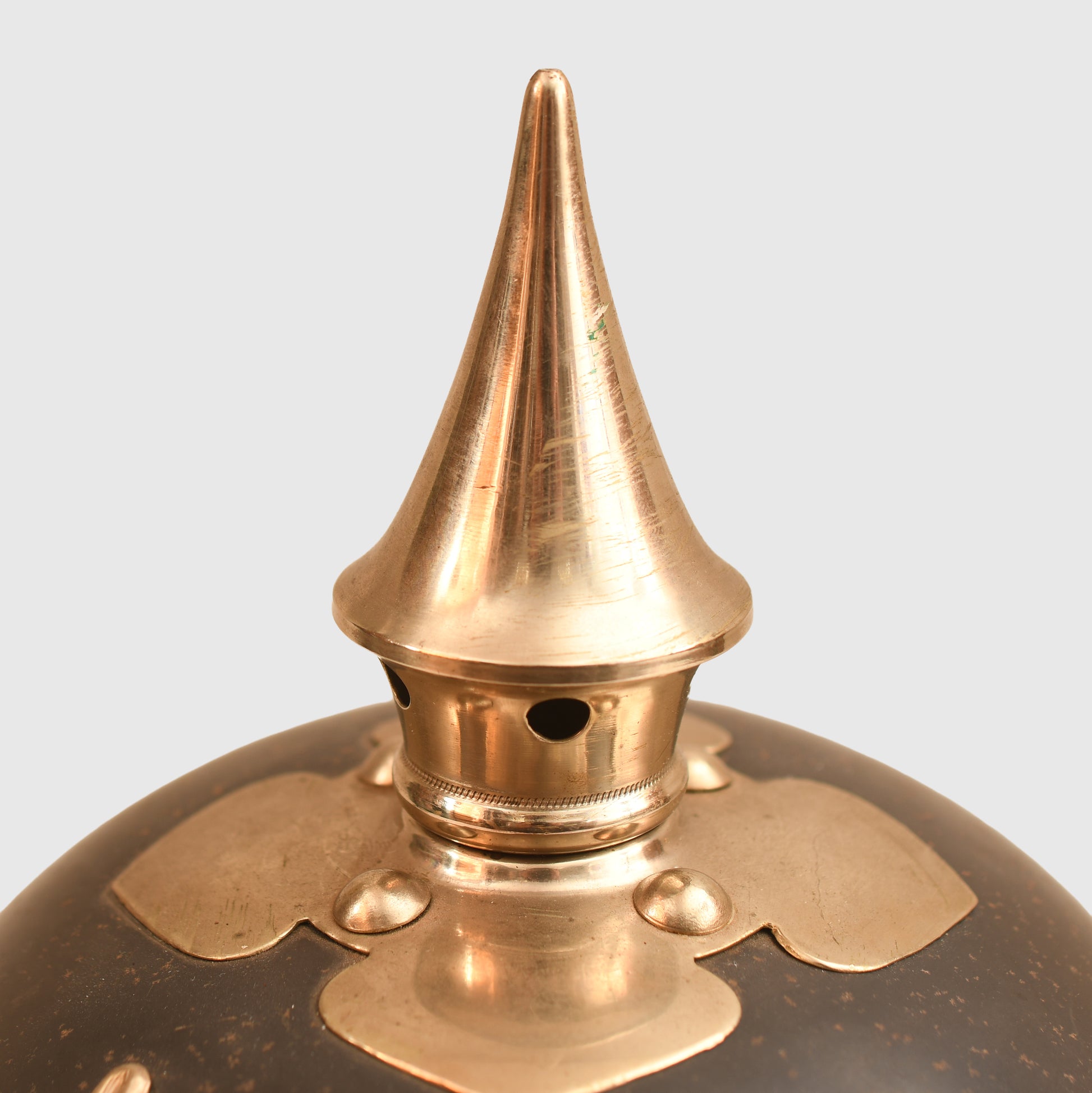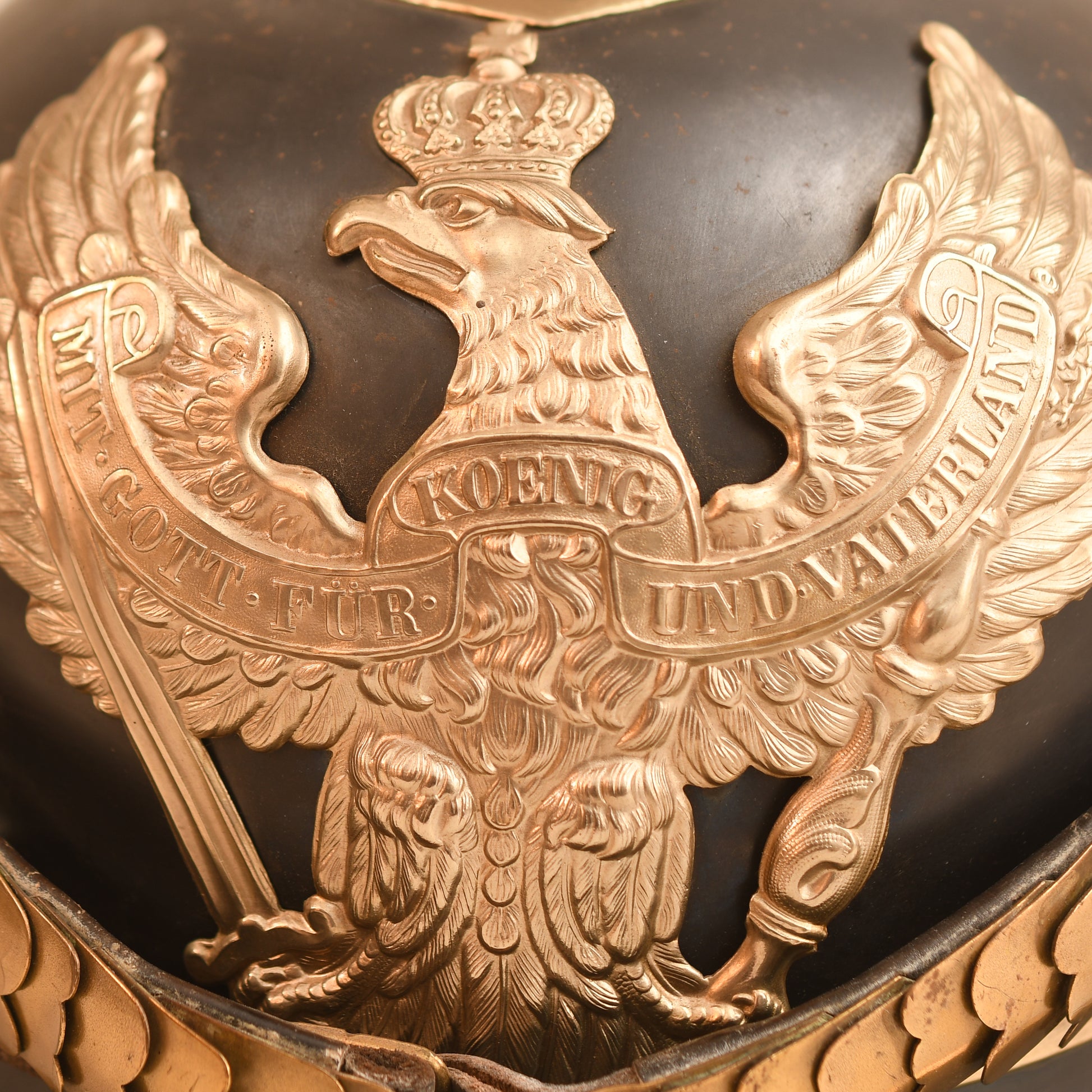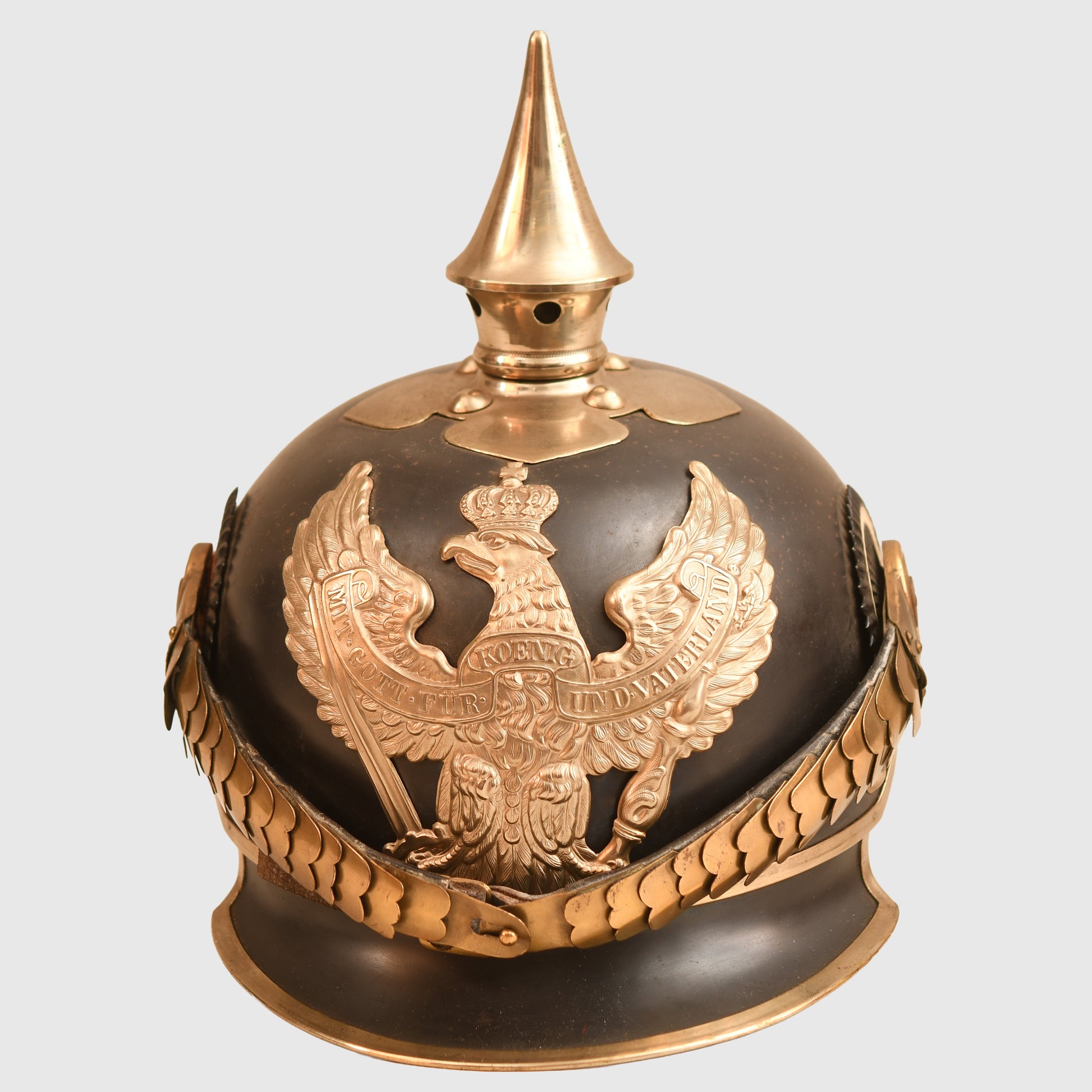 The blued steel skull is in excellent condition, showing only a very minor amount of rust bleed through the blueing, which is typical for a piece of this age. All of the white metal fittings, including the spike, spike base, front plate (wappen), and the trim along the edges of the helmet, are clean and undamaged. The domed brass chin scales remain in place and are complete with their original leather backings. The helmet also retains its original, large-size State and national cockades.