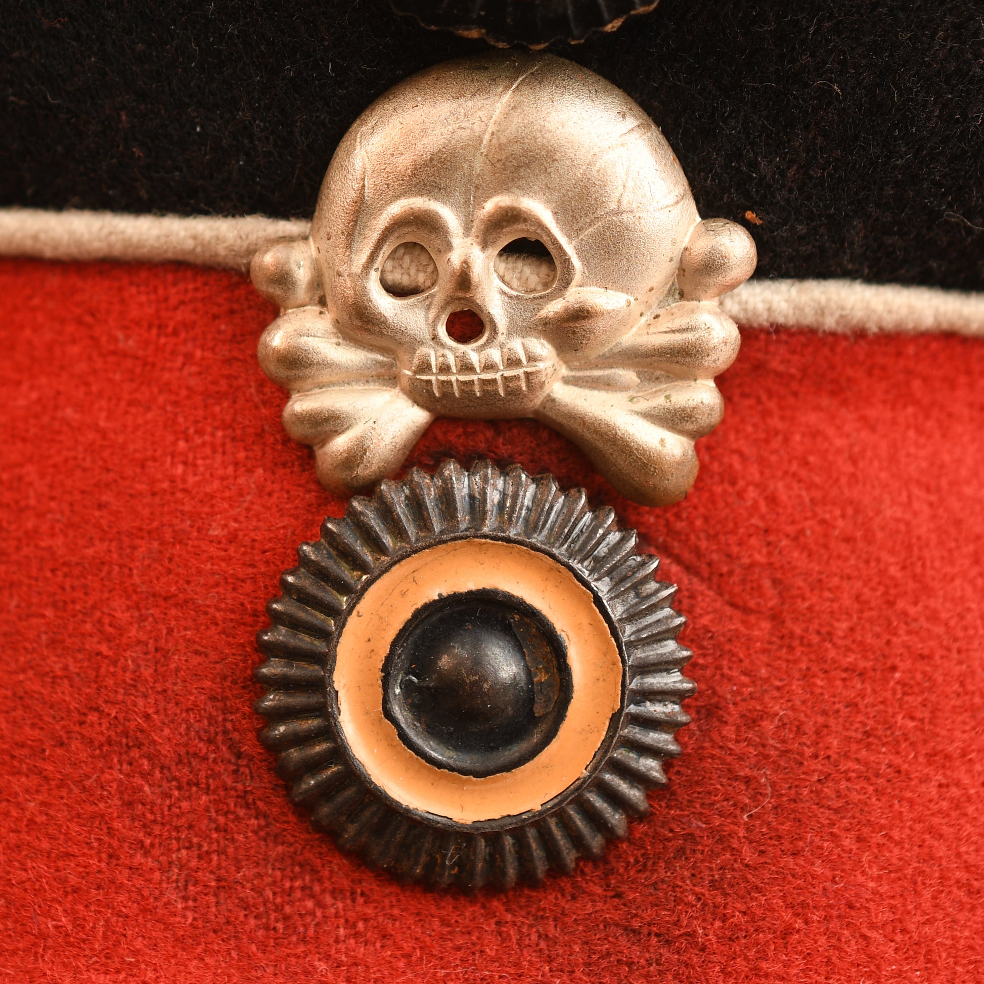 The cap is distinguished by its red centre band, bordered on both the upper and lower edges with white waffenfarbe. The insignia is particularly impressive, featuring an NCO quality national cockade at the top and an enlisted ranks one-piece Prussian State cockade below. Positioned prominently between the two cockades is the iconic jawless skull and crossbones (Totenkopf) unique to Leib Hussar Regiment No.1.