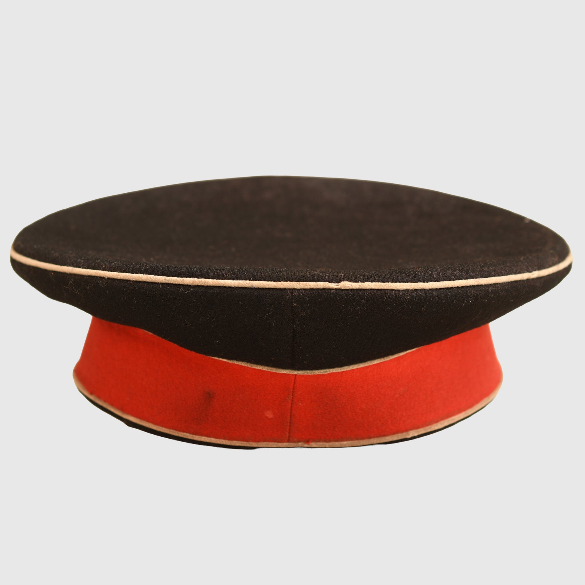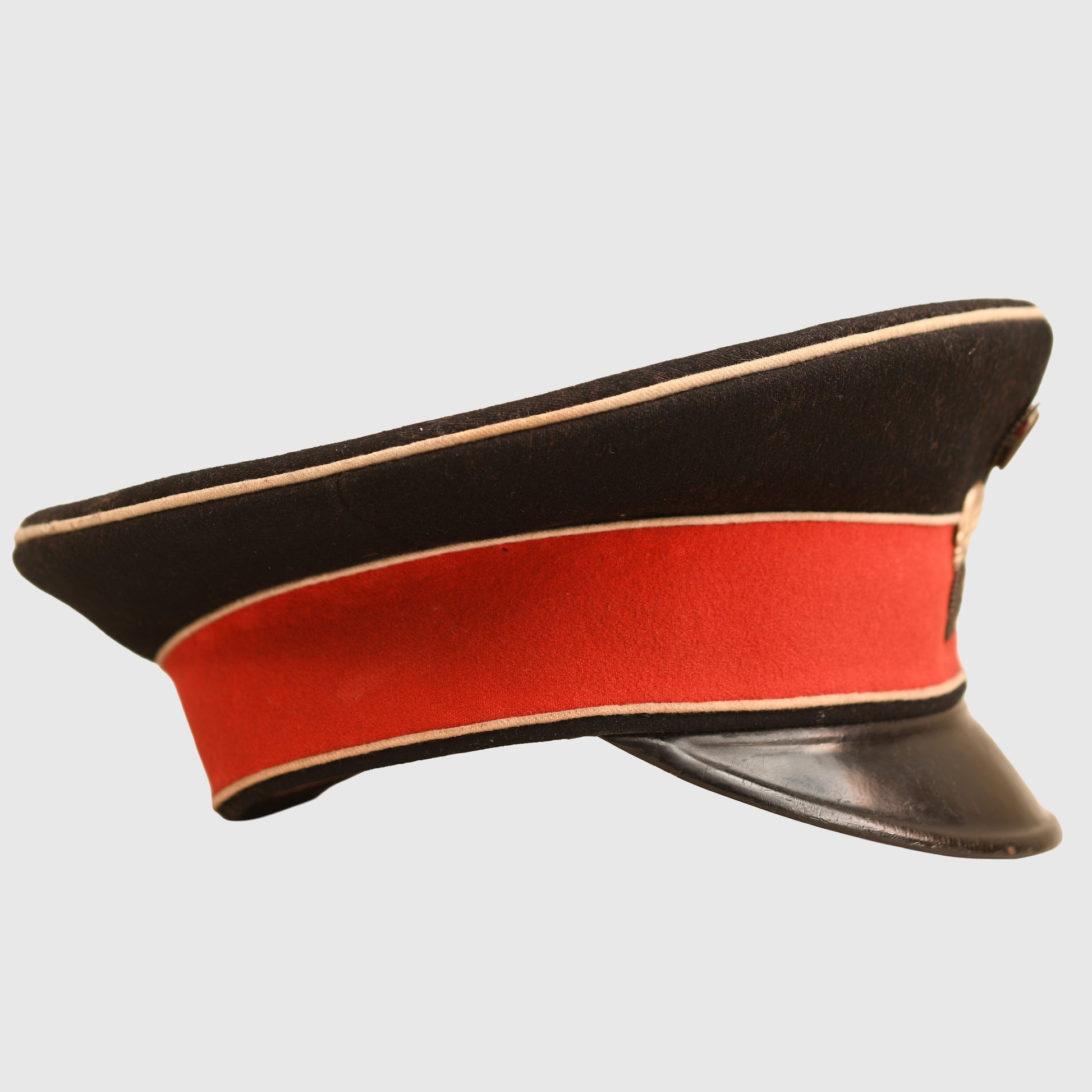 This is a rare and highly prestigious visor cap from one of the premier cavalry regiments of the Imperial German Army. It is an NCO grade cap in a desirable size, approximately 56 or 57. The cap features an all-black body which is in excellent condition and free from moth damage. There are two minor moth nips noted on the upper white waffenfarbe piping, but these do not detract significantly from the overall appearance.