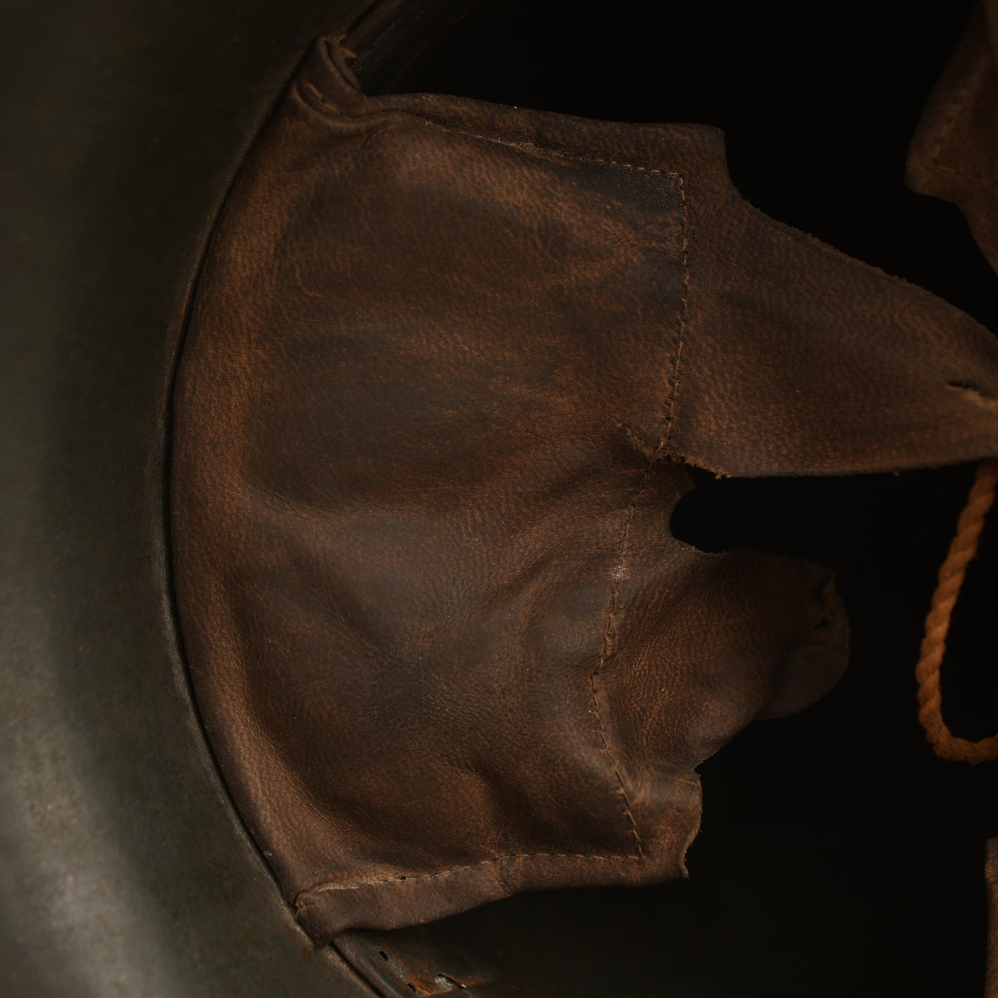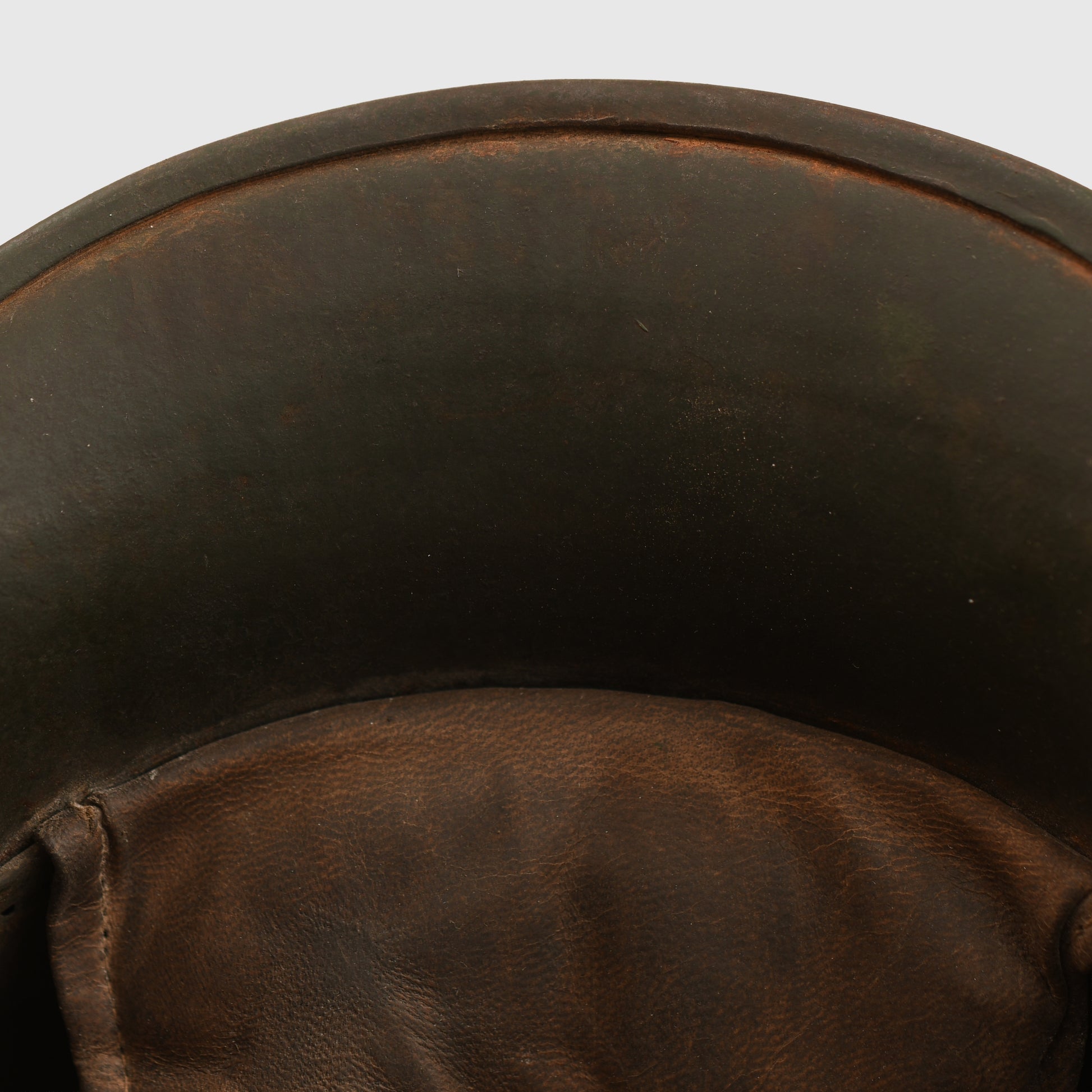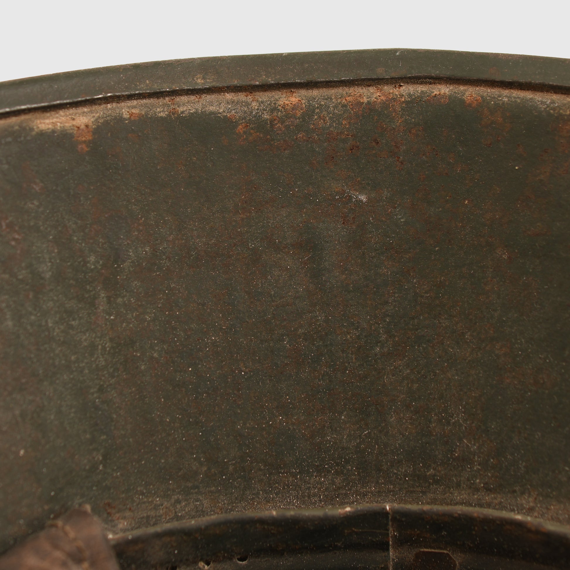 A rare variation being the M.18 helmet with its fixed carbine clip chinstrap in a fabulous three colour camouflage of green, brown and ochre. Some parts of the skull have highly unusual camouflage patterns. As we have mentioned before, it is the style of the camouflage pattern that has become an art form in itself. The three pad liner is all complete with its inner horsehair pads, with original drawstring and the carbine clip strap.
