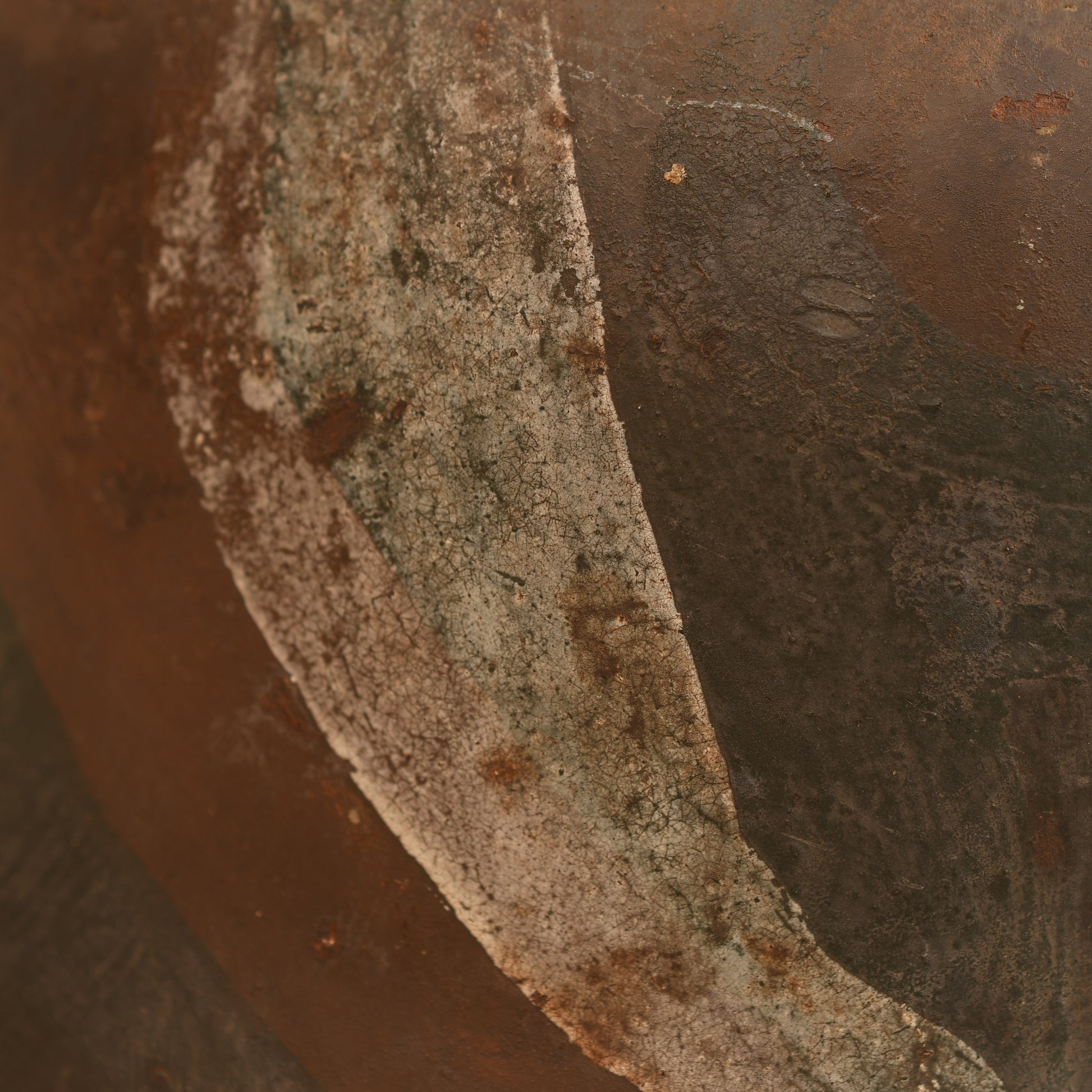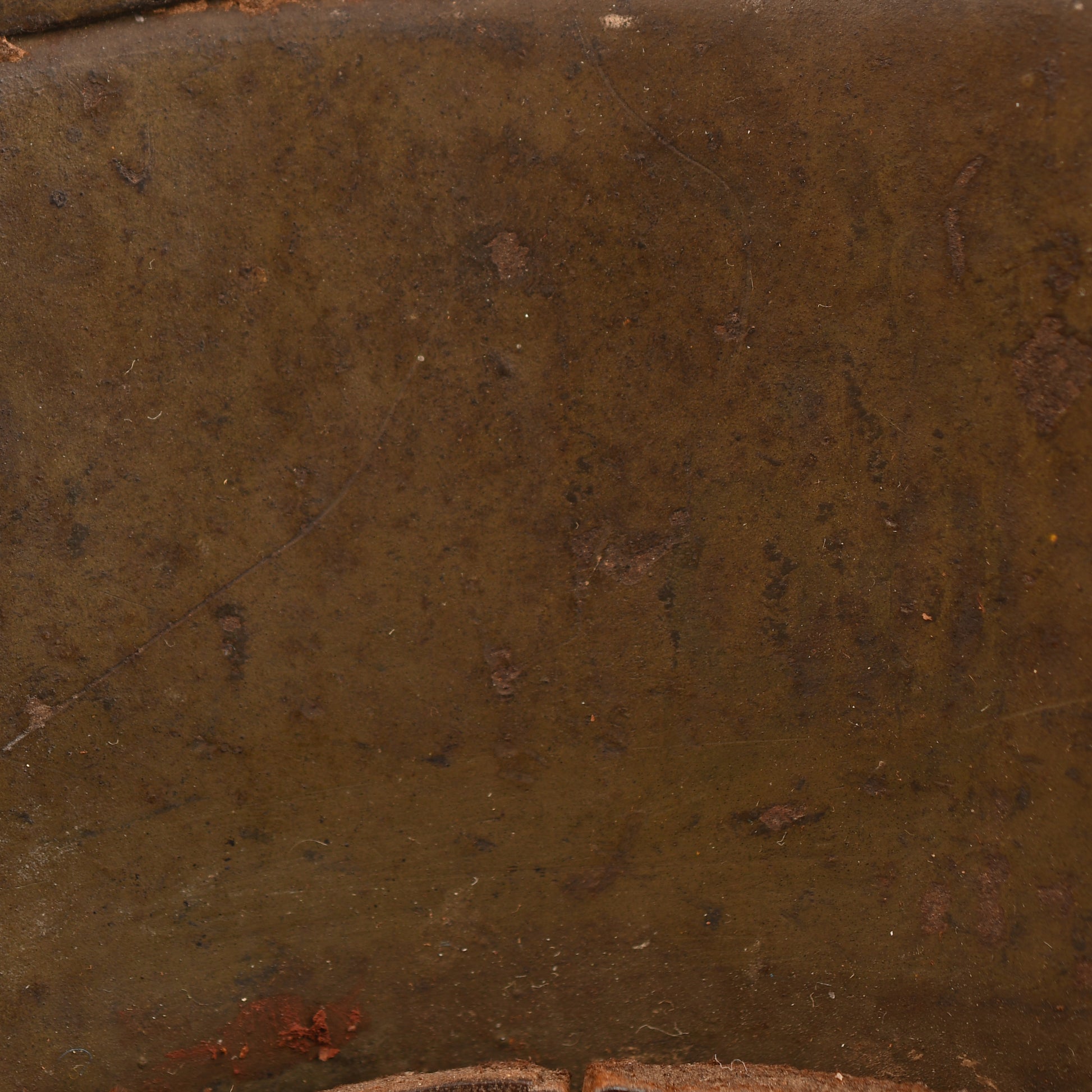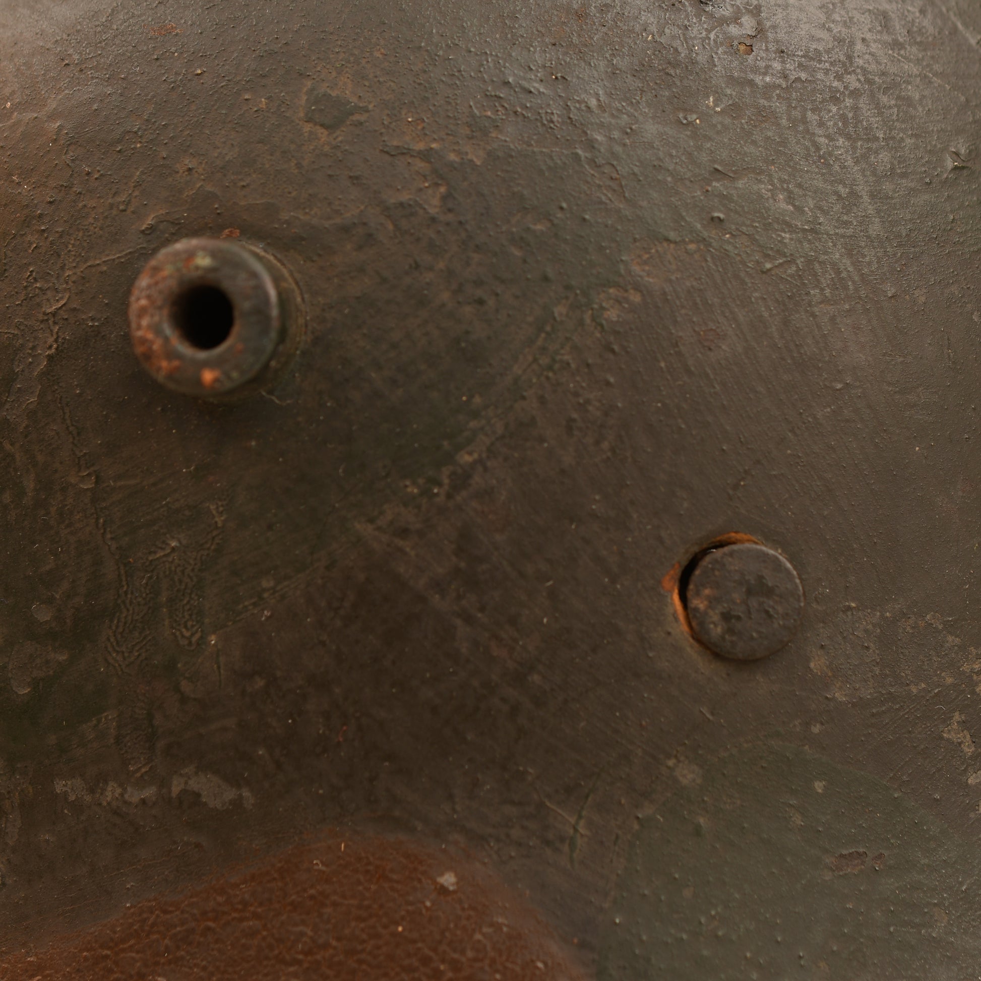 The shell is hand-painted in a heavy dark green base with irregular patches of brown and white, creating a unique camouflage effect. Some areas show natural wear, atmospheric fading, and minor losses to the finish, visible in our detailed images.